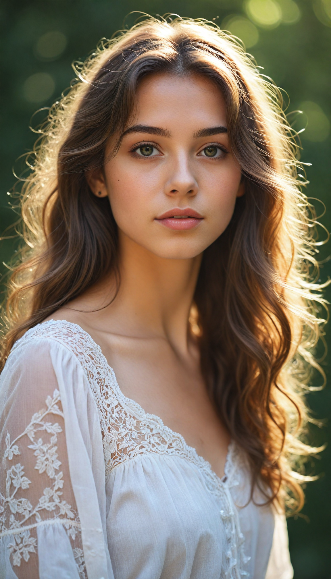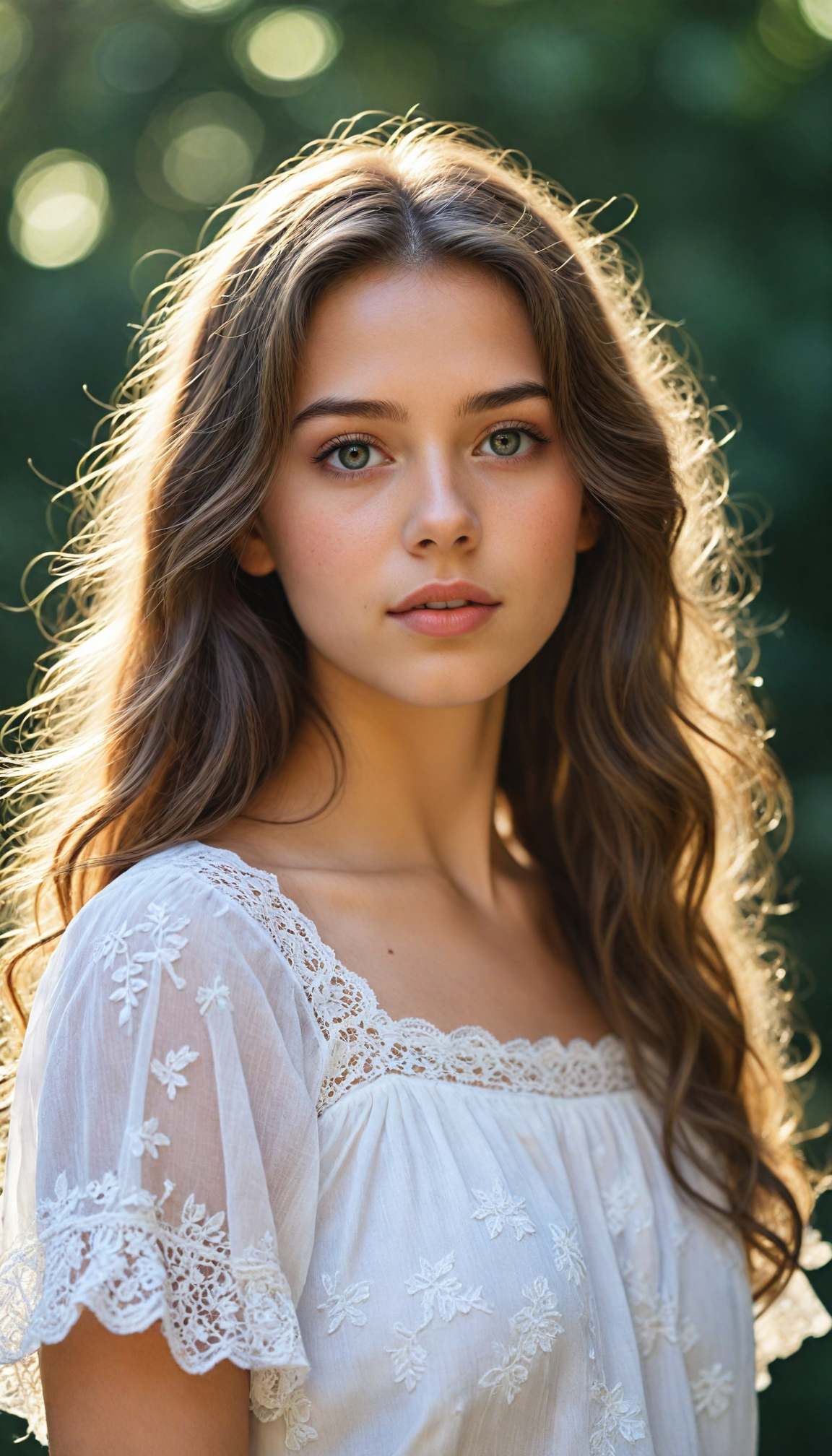 a hyper-realistic portrait of a captivating young girl with flowing waves of silky hair cascading down her shoulders. She gazes sweetly into the camera, exuding charm and innocence. Her outfit features a delicate white crop top adorned with intricate lace details, hinting at a dreamy summer vibe. The background is softly blurred with hints of pastel floral patterns, creating an ethereal atmosphere, reminiscent of a whimsical fairy tale. Sunlight gently illuminates her face, highlighting her sparkling eyes and soft features, while a sprinkle of magical dust floats in the air, enhancing the enchanting scene.