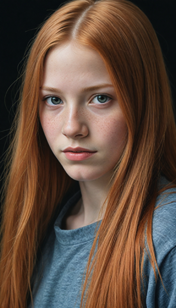 (portrait), detailed pencil drawing, silvery-skinned (young teen girl), long straight red hair (black background)