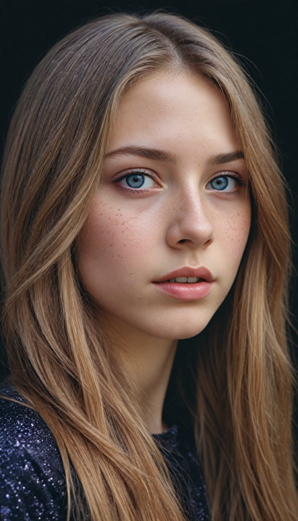 (portrait), intricately detailed pencil drawing, silvery-skinned (young teen girl) with cascading long straight molten copper hair that glimmers like liquid metal, piercing violet eyes reflecting a cosmic universe, set against a velvety black background that appears to shimmer with starlight, reminiscent of a blend between classical realism and modern fantasy illustration