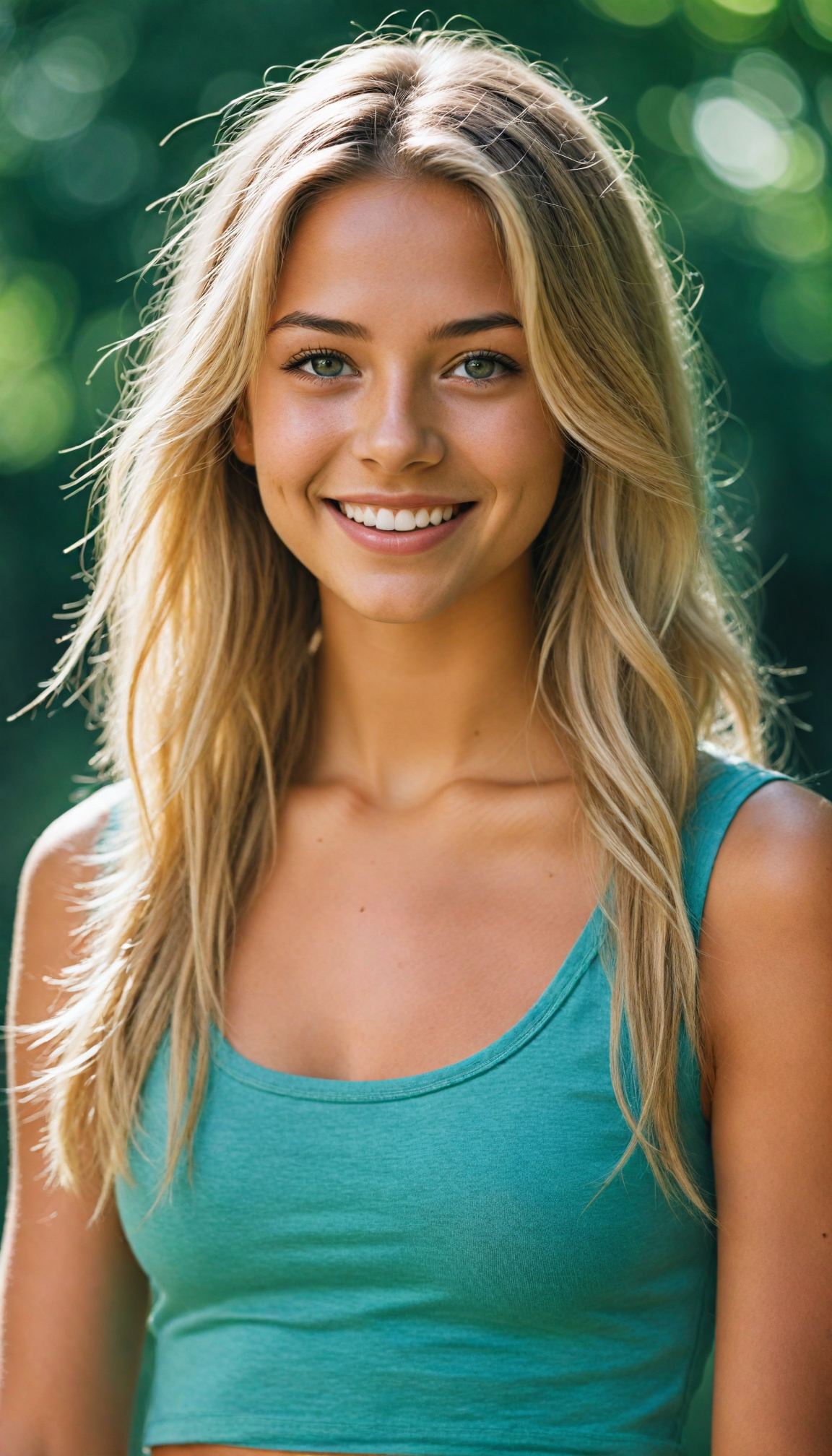 cute teen petite tanned teen girl, detailed soft long light blond hair, short cropped tank top, ultra realistic face, realistic amber eyes, a stunning photo with beautiful saturation, ultra high resolution, deep shadow, (best quality, masterpiece), highly detailed, looking at viewer, warm smile, white teeth, (upper body), masterpiece, ultra realistic, extremely detailed, sunny green backdrop