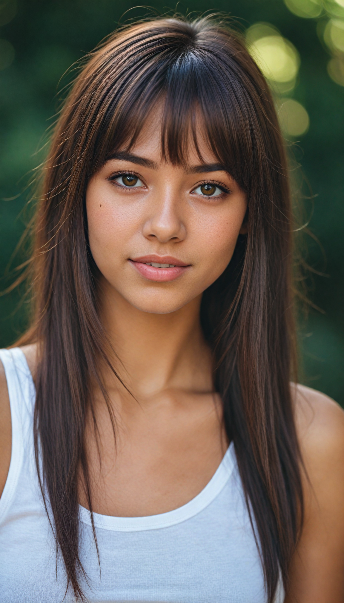 cute teen petite tanned teen girl, detailed soft long hair, bangs, white short cropped tank top, ultra realistic face, realistic amber eyes, detailed maroon straight hair, a stunning photo with beautiful saturation, ultra high resolution, deep shadow, (best quality, masterpiece), highly detailed, looking at viewer, warm smile, (upper body), masterpiece, ultra realistic, extremely detailed