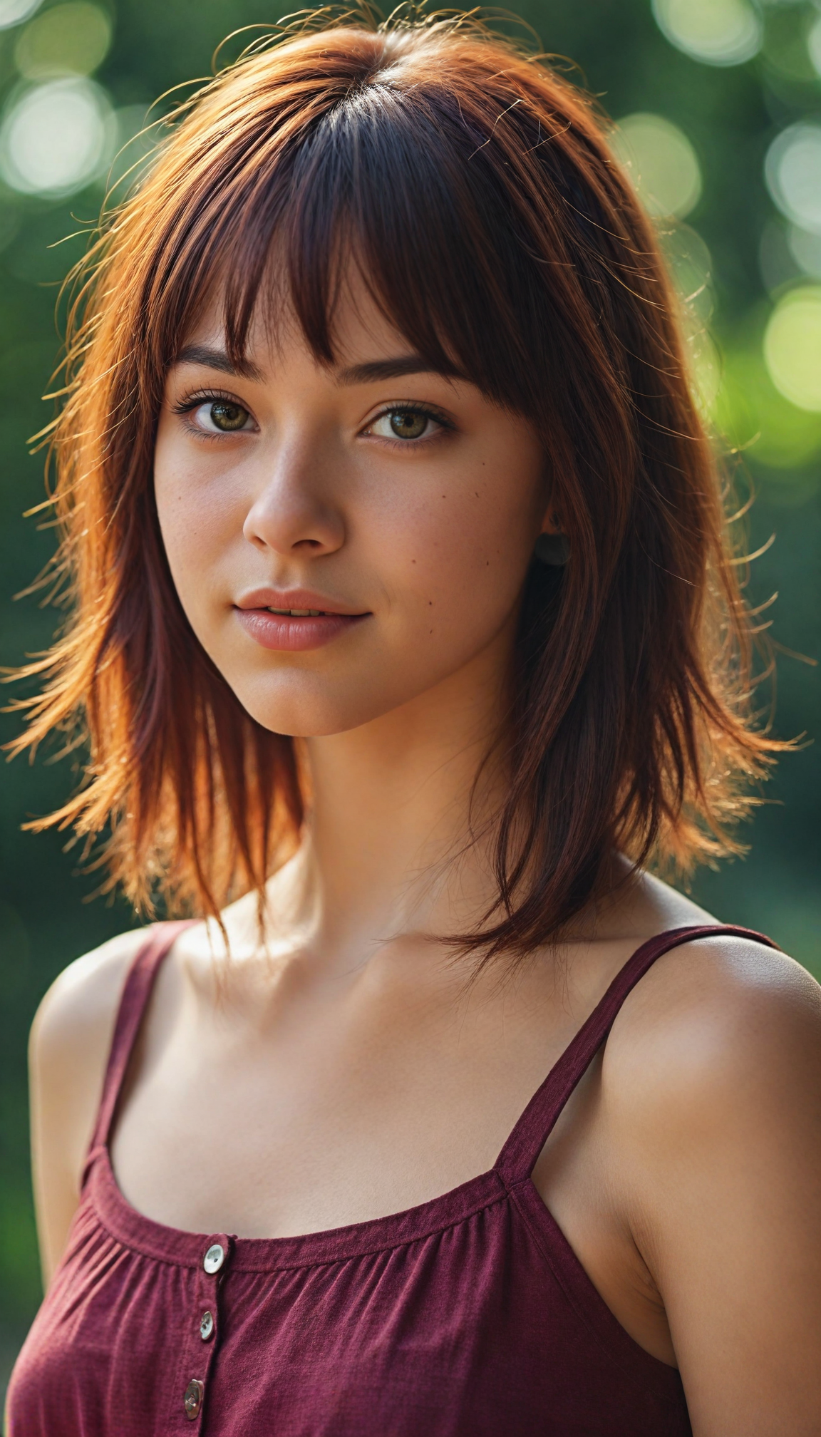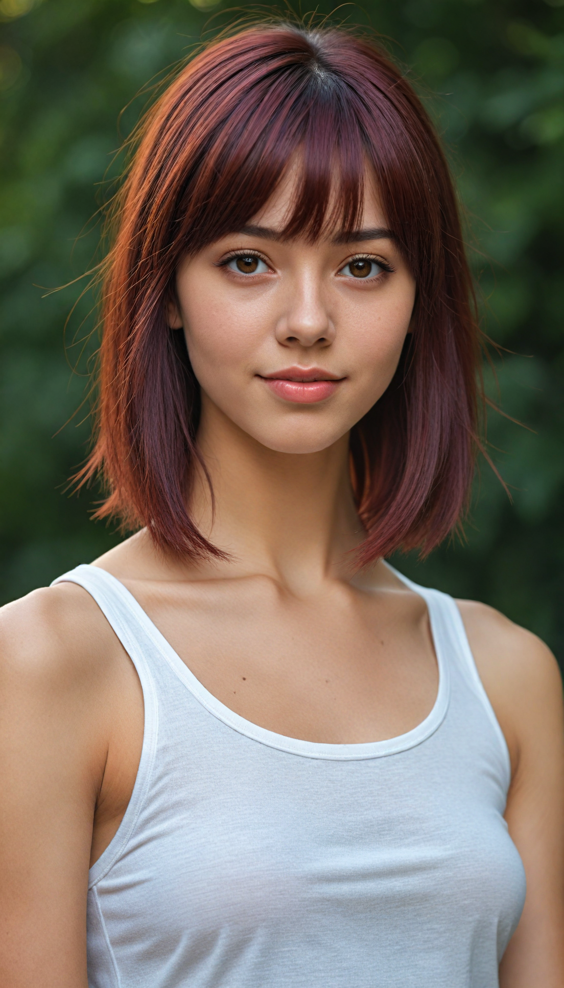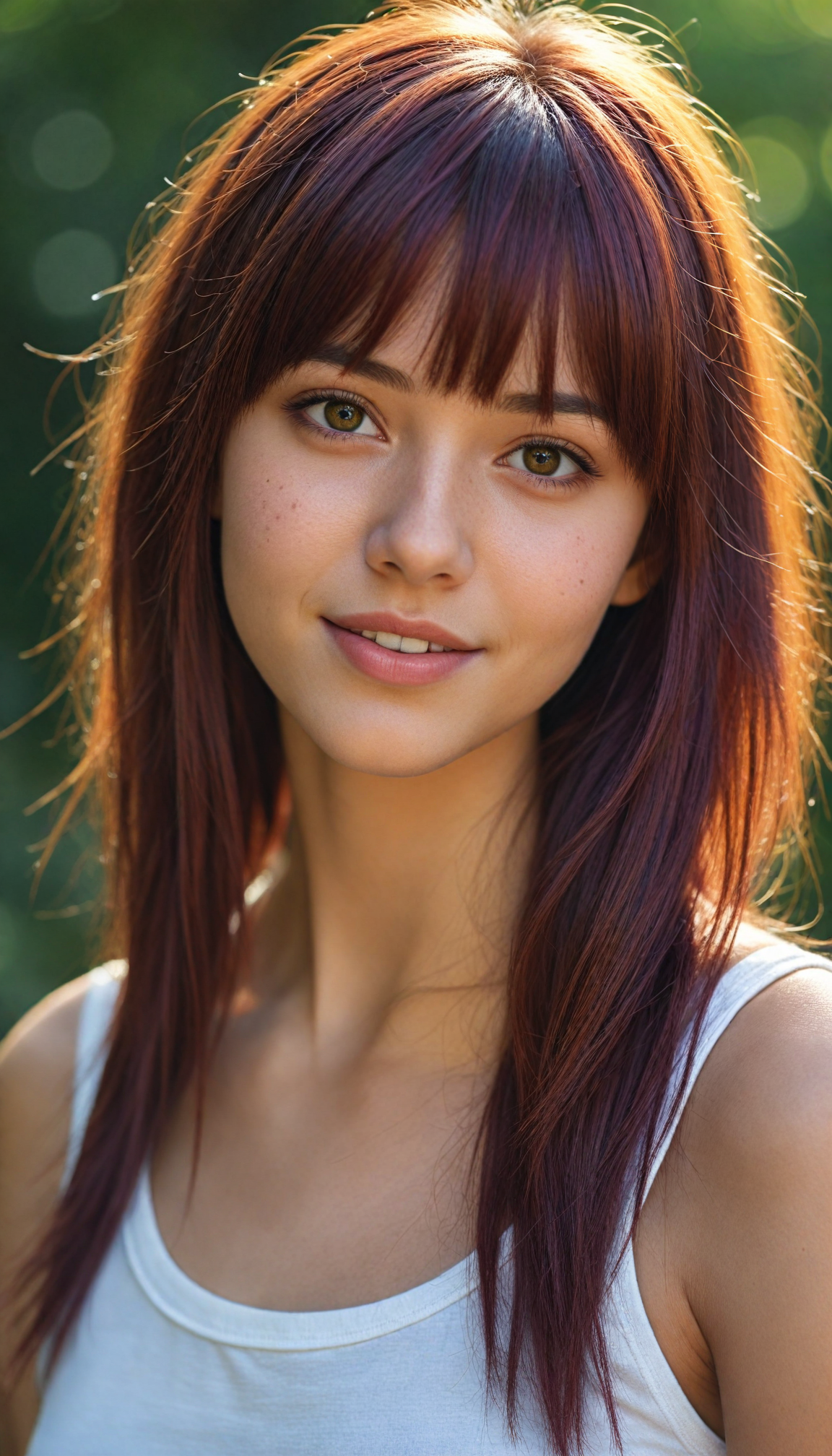 cute teen girl, detailed hair, bangs, white short cropped tank top, perfect curved body, ultra realistic face, realistic amber eyes, detailed maroon straight hair, a stunning photo with beautiful saturation, ultra high resolution, deep shadow, (best quality, masterpiece), highly detailed, depth of field, film grain, looking at viewer, warm smile, (upper body), masterpiece, ultra realistic, extremely detailed CG unity 8k wallpaper, best quality