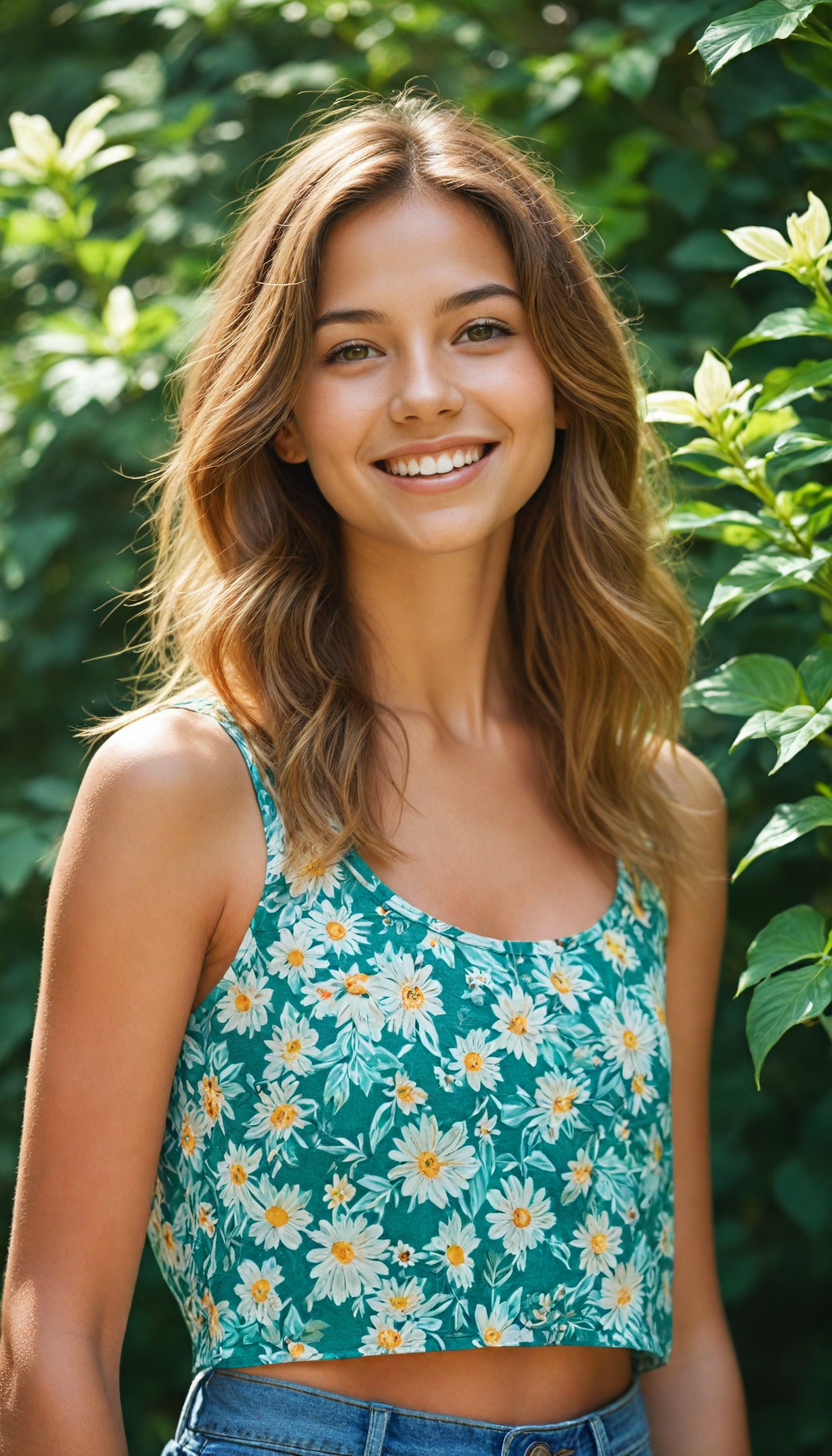 enchanting petite tanned teenage girl with flowing, soft, sun-kissed golden hair that cascades gently over her shoulders, wearing a vibrant cropped tank top adorned with floral patterns. Her captivating, ultra-realistic face features sparkling amber eyes that glimmer with warmth, framed by long lashes. She radiates joy with a radiant smile displaying pearly white teeth, set against a lush, sun-drenched backdrop of emerald green foliage and blooming flowers, where dappled sunlight filters through the leaves, creating a magical, ethereal atmosphere that invites the viewer into her world.