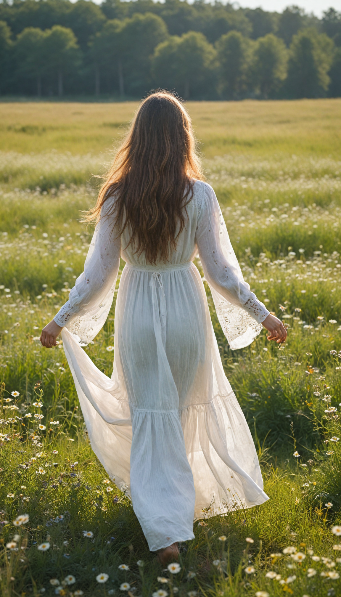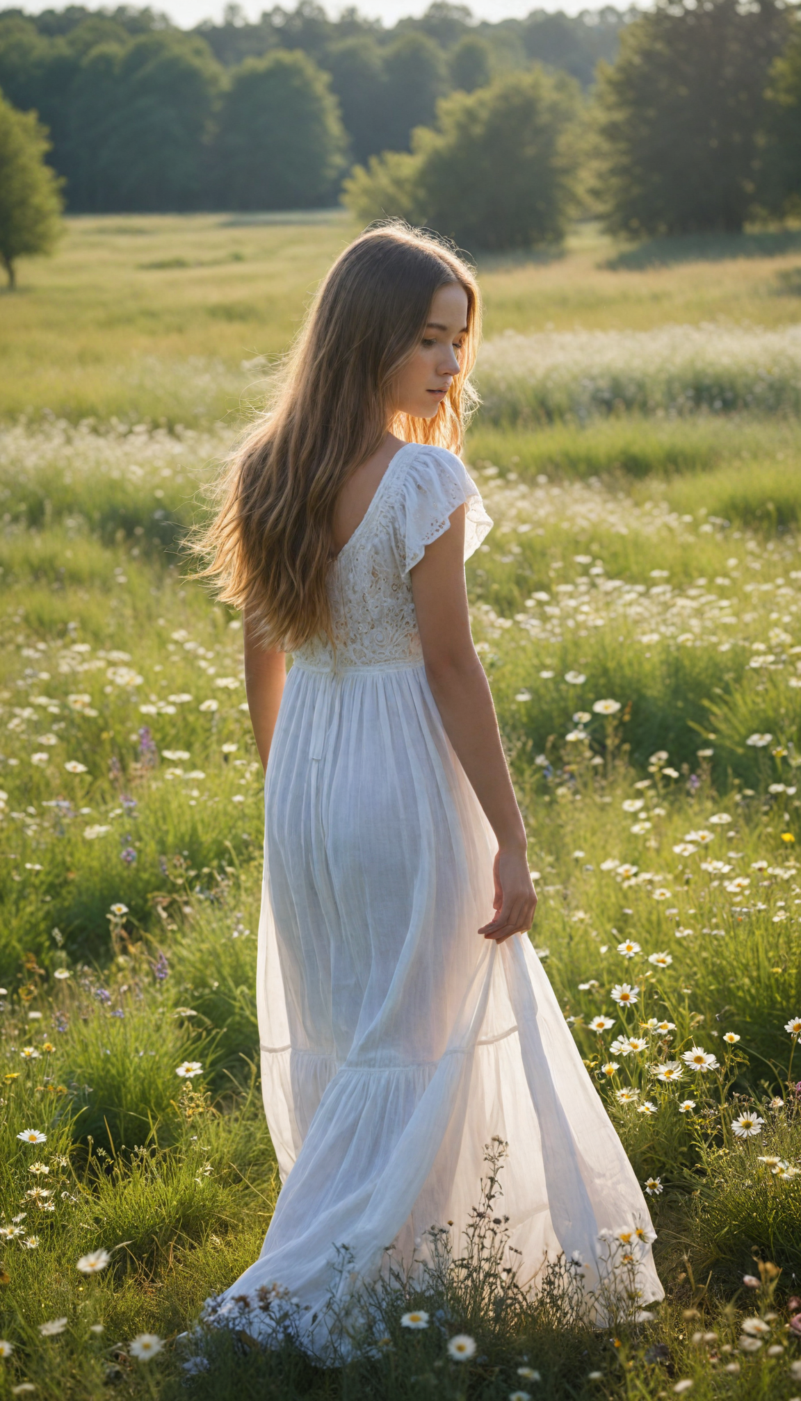 a young girl with soft long straight hair cascading down her back, stands in front of viewer in a sun-drenched meadow filled with wildflowers. The scene is infused with an ethereal glow, reminiscent of a dreamy impressionist painting. The girl wears a flowing white dress.