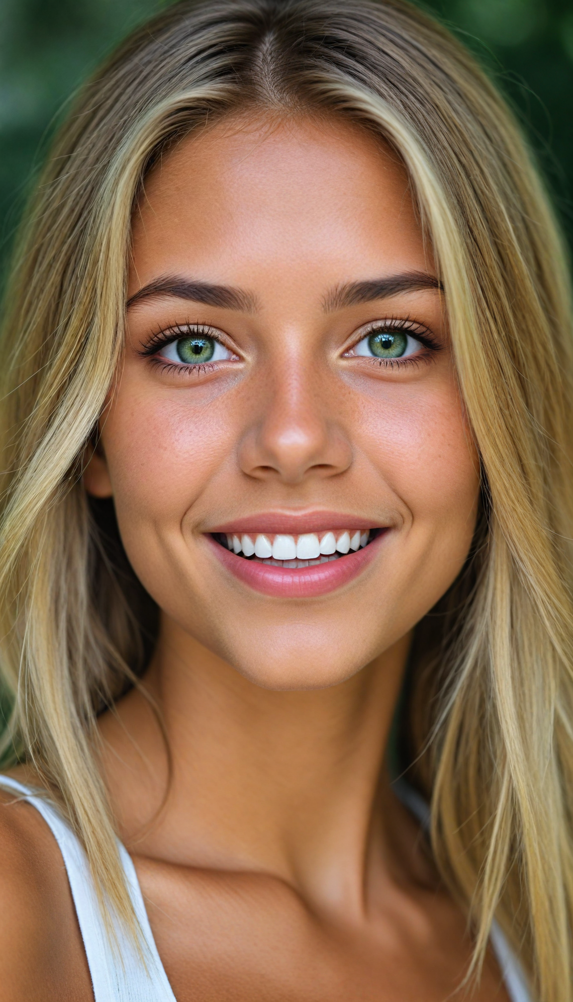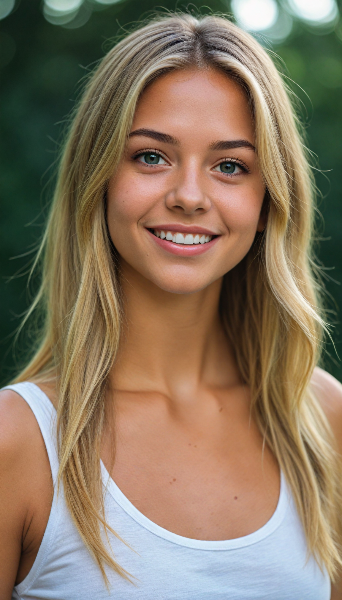 cute teen petite tanned teen girl, detailed soft long jet straight blond hair, short cropped tank top, ultra realistic face, realistic amber eyes, a stunning photo with beautiful saturation, ultra high resolution, deep shadow, (best quality, masterpiece), highly detailed, looking at viewer, warm smile, white teeth, (upper body), masterpiece, ultra realistic, extremely detailed, sunny green backdrop