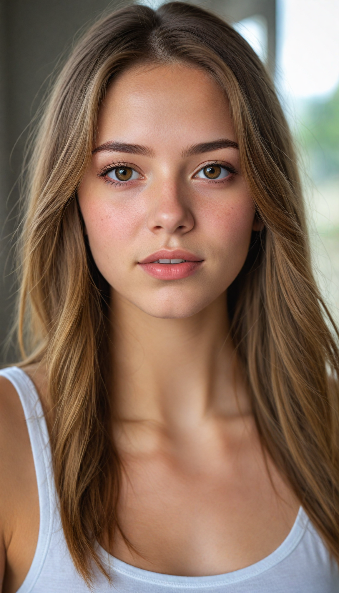 a very detailed and realistic portrait of a (cute teen girl), (long yet straight light brown hair), (realistic detailed brown eyes), (full kissable lips), (realistic detailed, light amber eyes), (face illuminated), (wearing a very low cut (white tank top) made on fine wool), perfect curved fit body