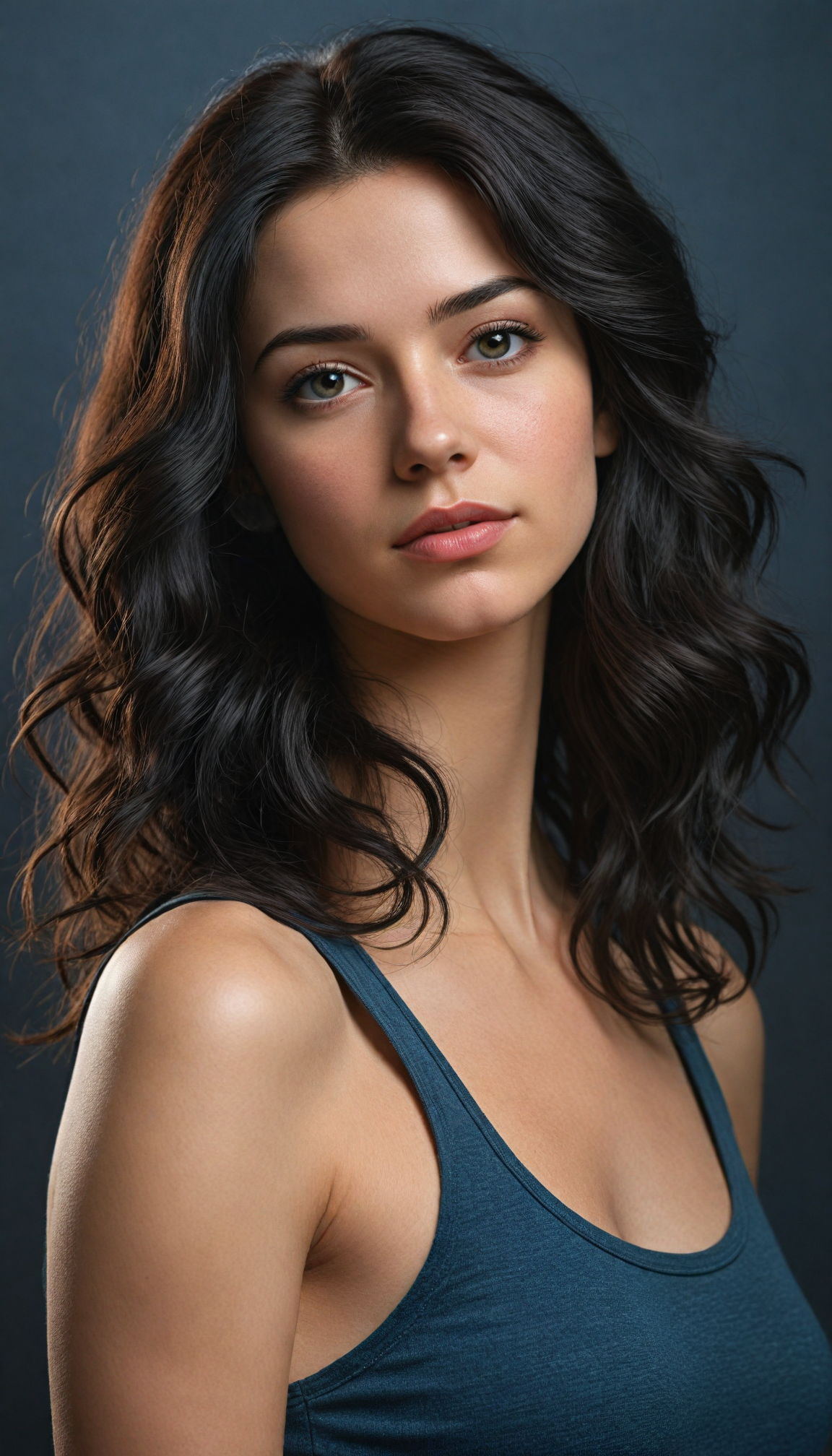 a (super realistic and highly detailed full-body photo), capturing a (beautiful and innocent Caucasian girl) with (very long, thick, wavy black hair), and (a short, cropped tank top), she stands in a (dark, gloomy setting) with (volumetric lighting) that brings out her (natural features) and (beautiful eyes), set against a (plain, dark backdrop) that focuses on her face, with (black hair) (perfect, accurate anatomy) and (high quality, high detail) that make her a (super-realistic, 3D character)