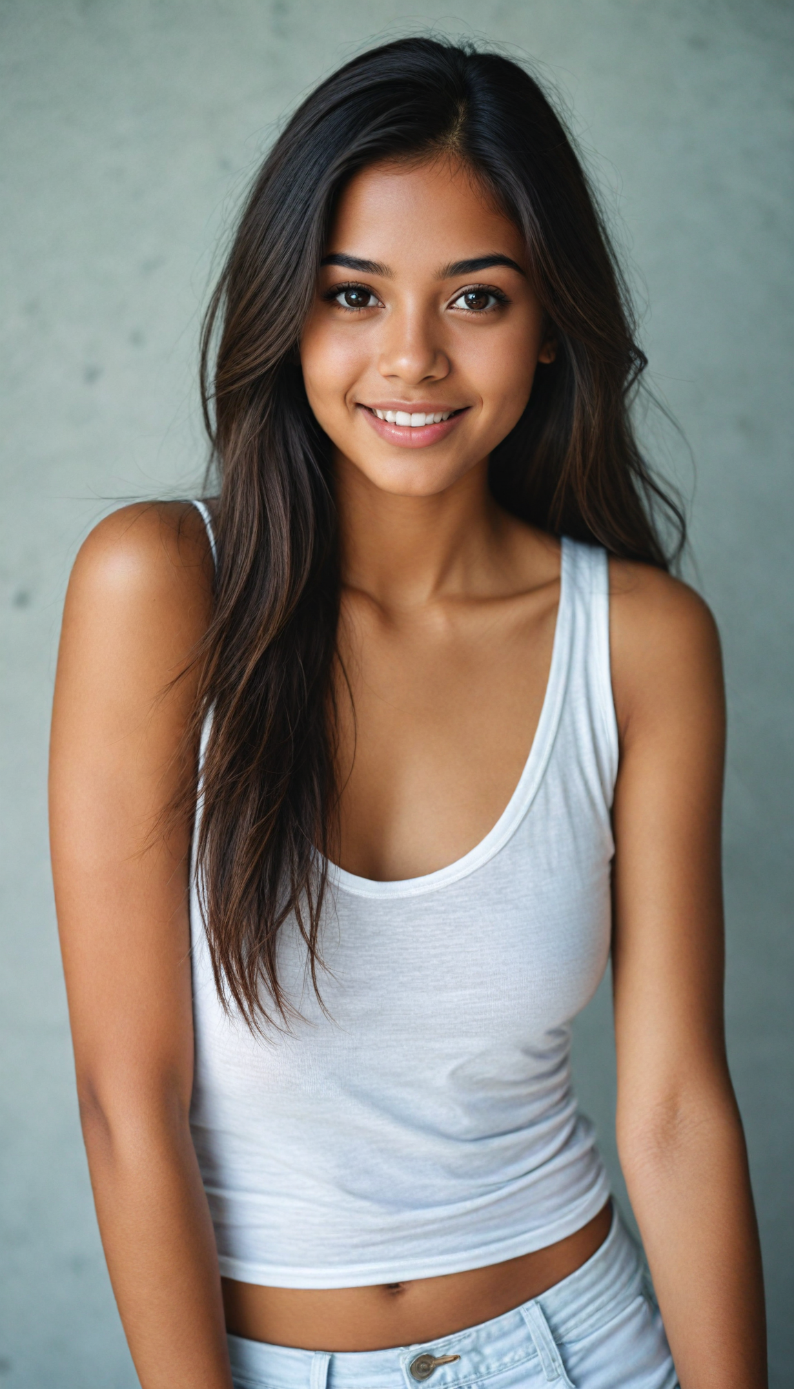 a very detailed and realistic (full body) portrait of a (brown-skinned teen girl), (long straight (dark brown hair), (realistic detailed (big brown eyes), (thin lips), (realistic detailed (brown skin), (light brown (eyes), (catchlights in both eyes), (matching eyes), (bright smile), (face illuminated), (looking into the camera), (wearing a very low cut (white tank top) made on thin silk)