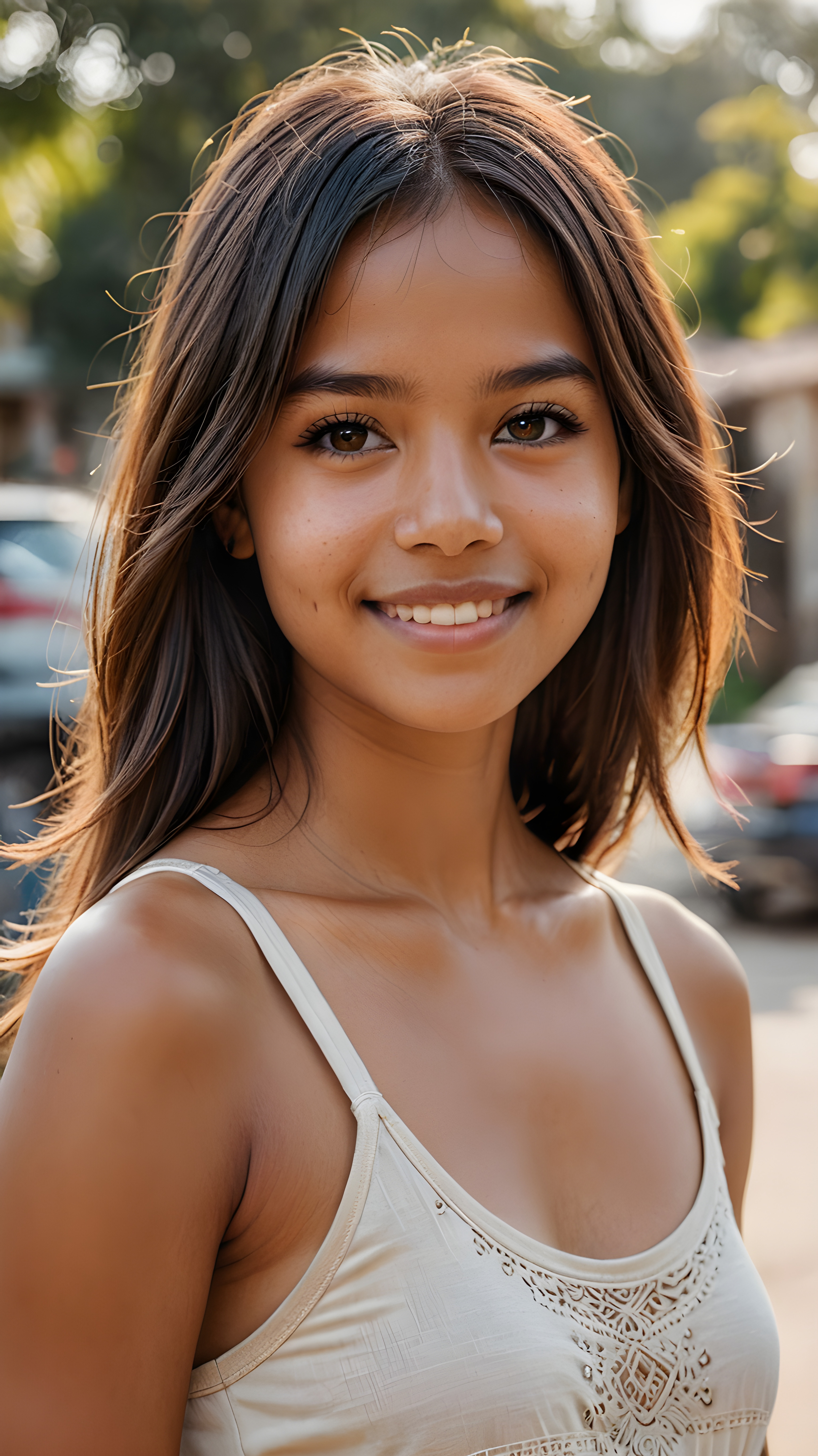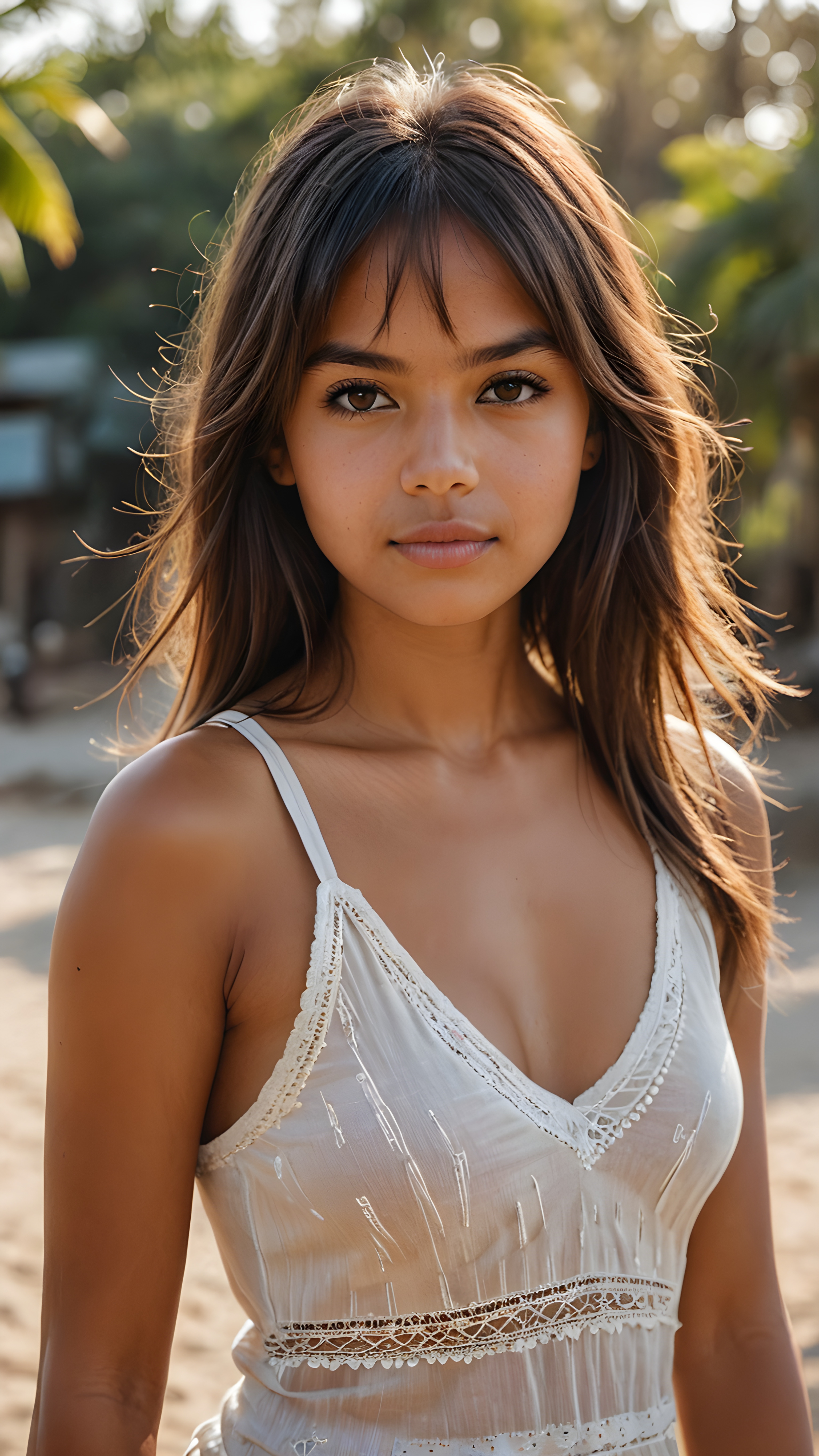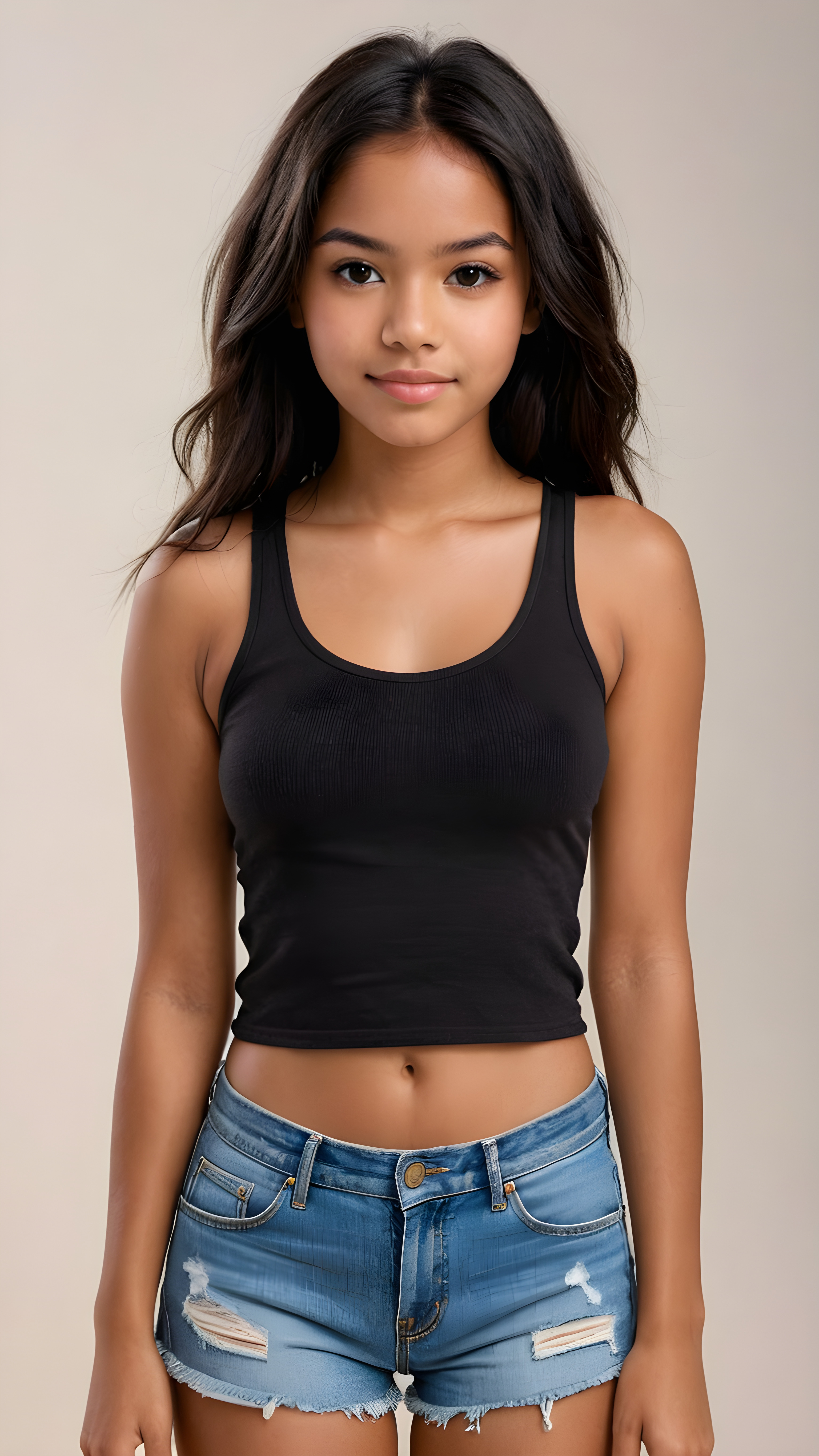 full body of pretty brown-skinned indigenous teen girl with black soft hair, brown eyes, wearing a short plain tank top that support her perfect body