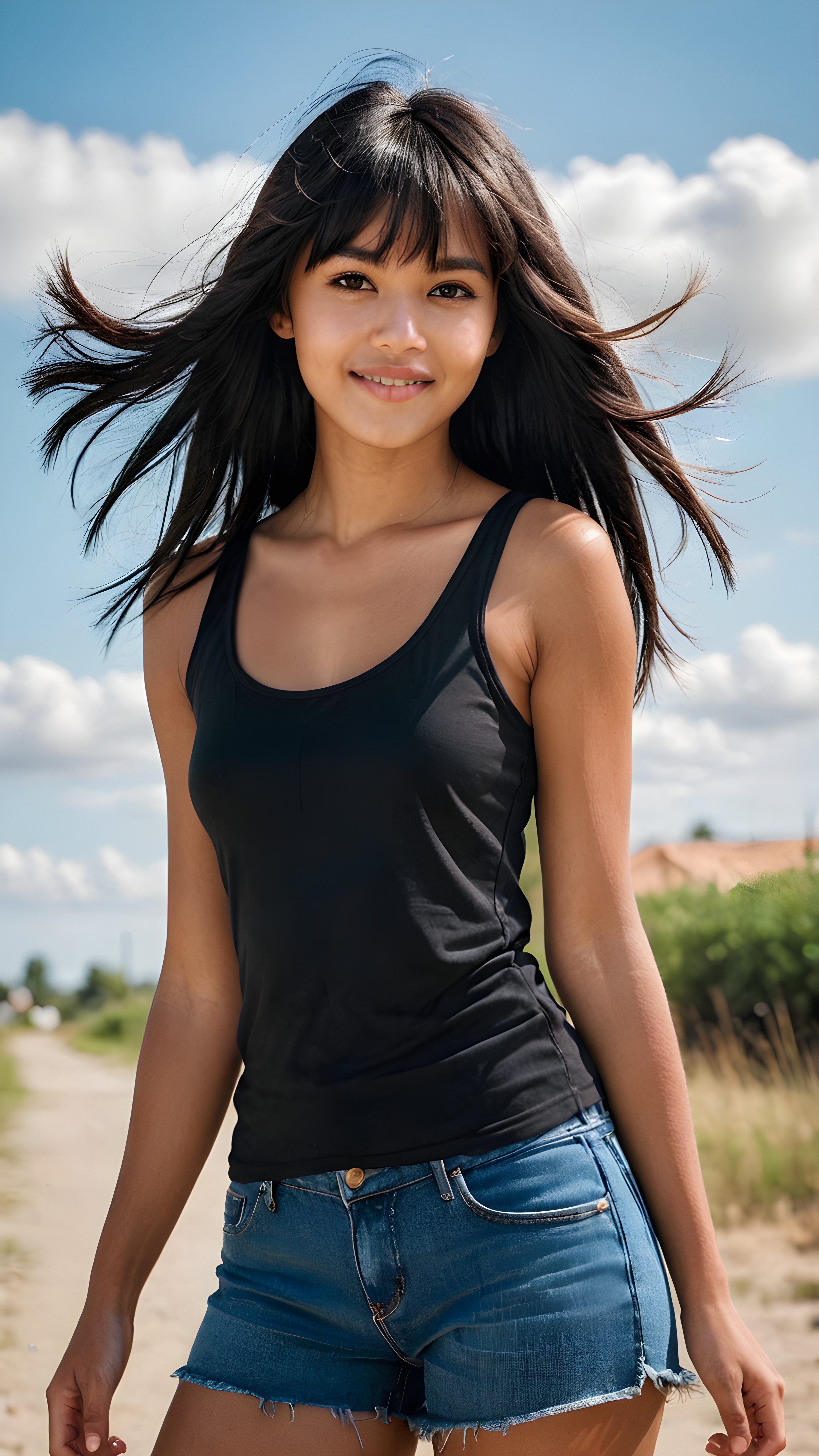 full body of pretty brown-skinned indigenous girl with long black soft straight hair, bangs cut, brown eyes, gentle smile, wearing a tank top. Brown skin, straight black hair, bangs cut, unique, beautiful, cute, pretty face, full body, slim, short stature, little shoes on her feet, unique, beautiful, cute, straight black hair with bangs cut. Her hair was blown away by the strong wind. (((Blowing hair)))