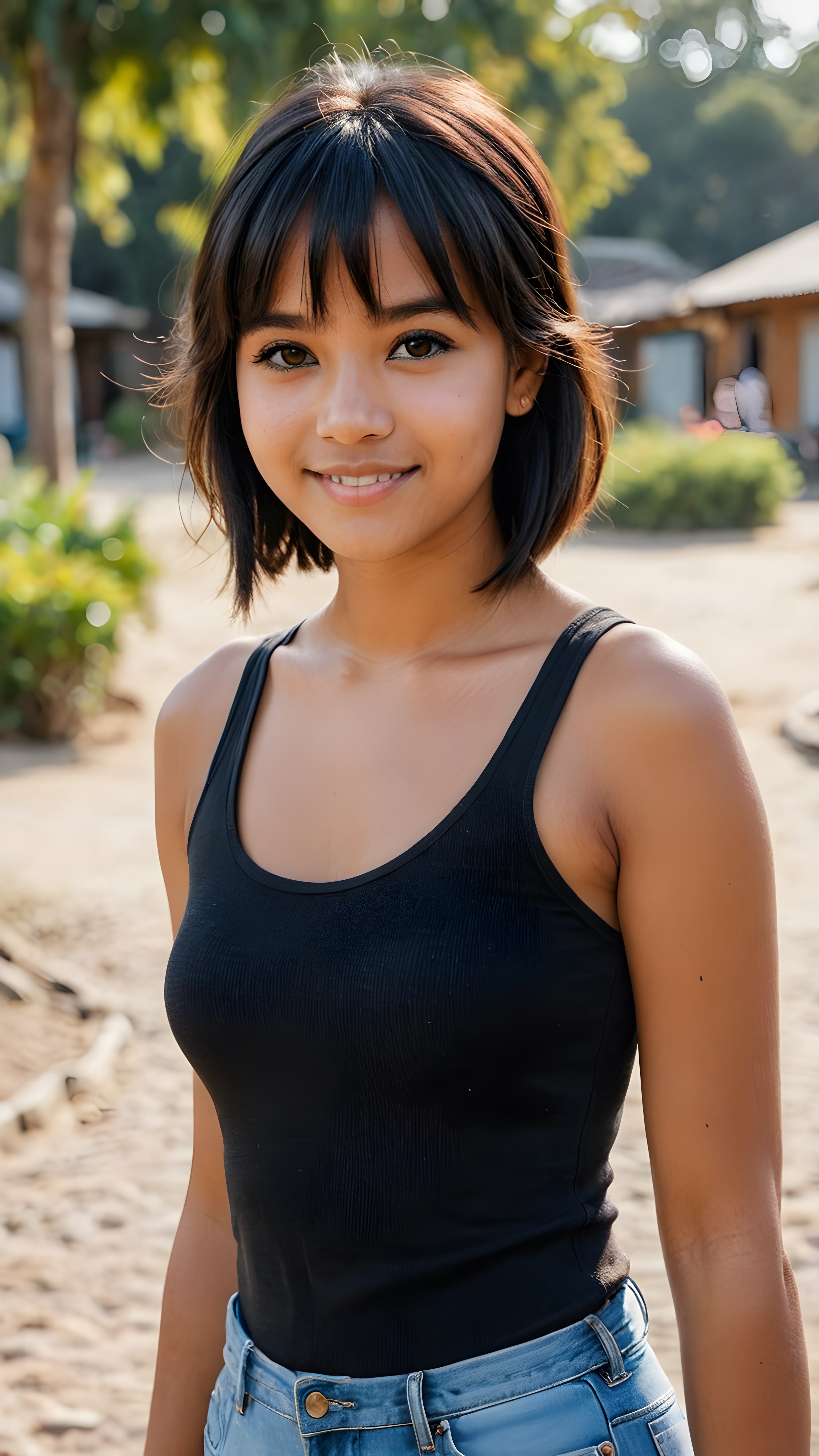 full body of pretty brown-skinned indigenous girl with black soft straight hair, bangs cut, brown eyes, gentle smile, wearing a tank top