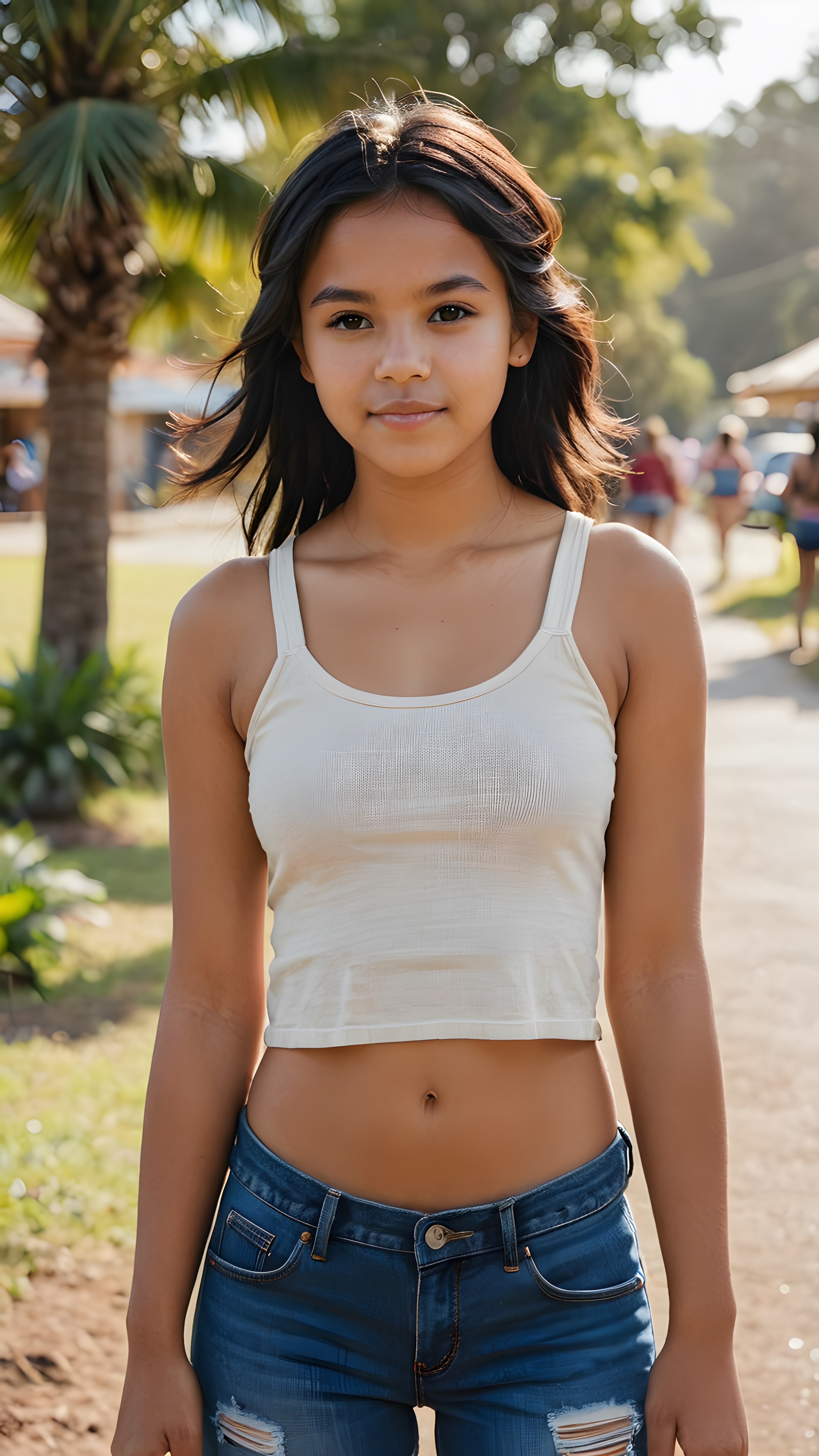 full body of pretty brown-skinned indigenous teen girl with black soft hair, brown eyes, wearing a short tank top