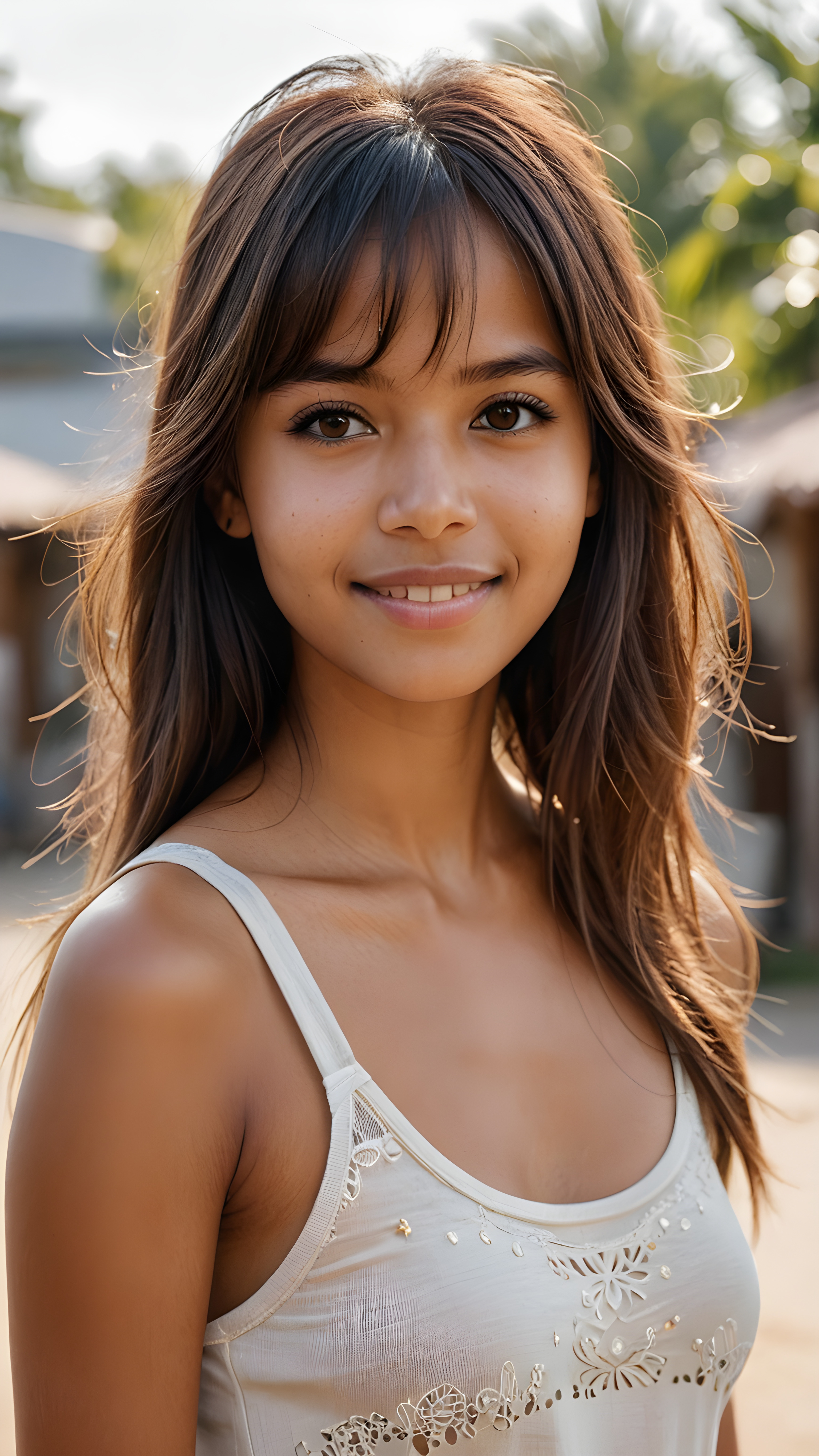 realistic and detailed photo from a pretty brown-skinned indigenous girl with soft straight very long hair, bangs cut, brown eyes, gentle smile, wearing a tank top