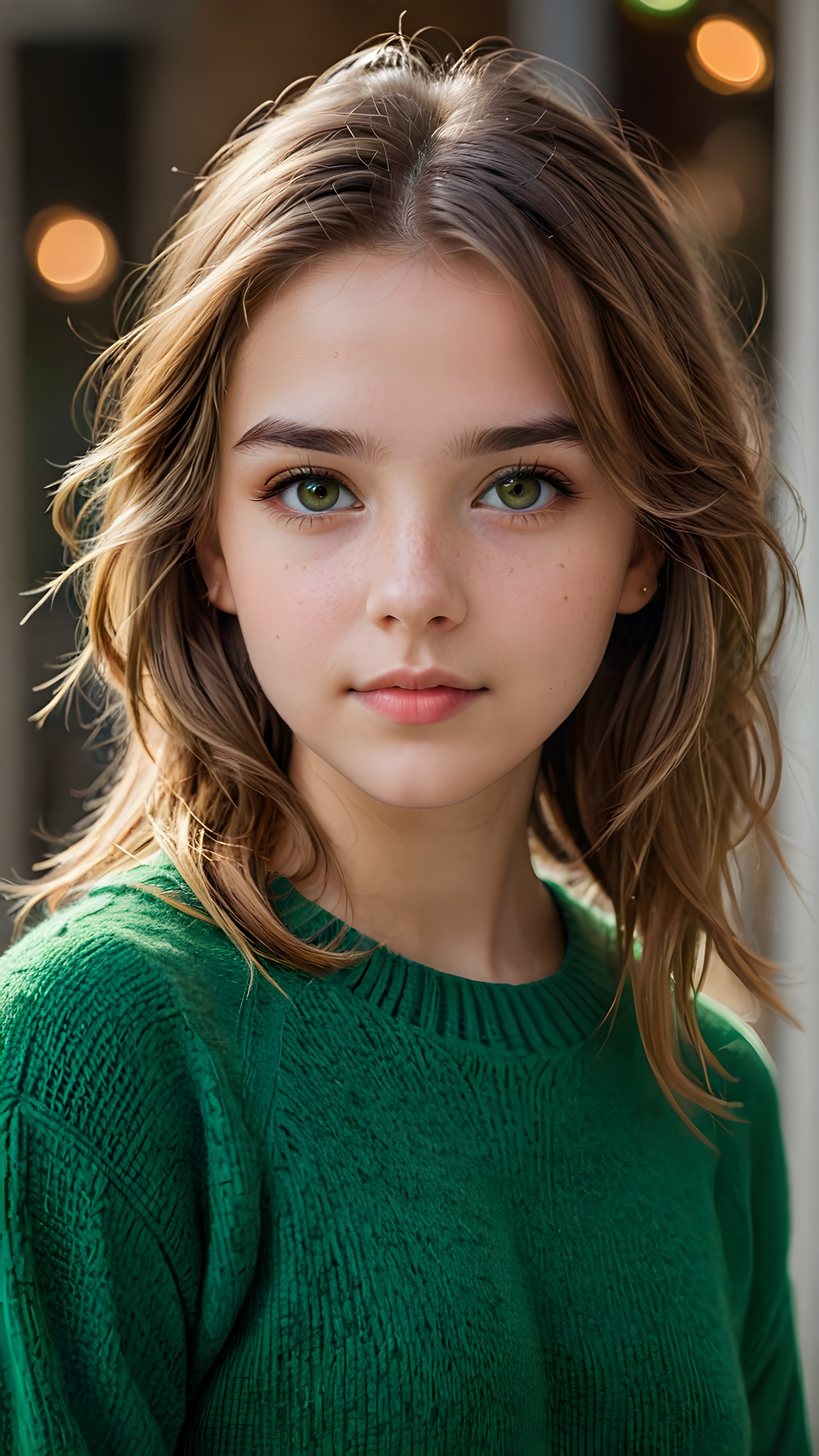 a stunningly realistic and highly detailed (((portrait))) of a (((young teen girl))), featuring a sleek, modern silhouette with asymmetrical, harmonious proportions. Her skin is (((light brown))), her eyes a vivid (((green))), and her hair long, straight, and messy. She wears a sweater made of animal fur , with a (((sleek, modern silhouette))), emphasizing her youthful, vibrant beauty. The background is (((empty))) to showcase the intricate details on her face and body, capturing the essence of a (professional photograph) that exudes a (fresh, realistic glow)