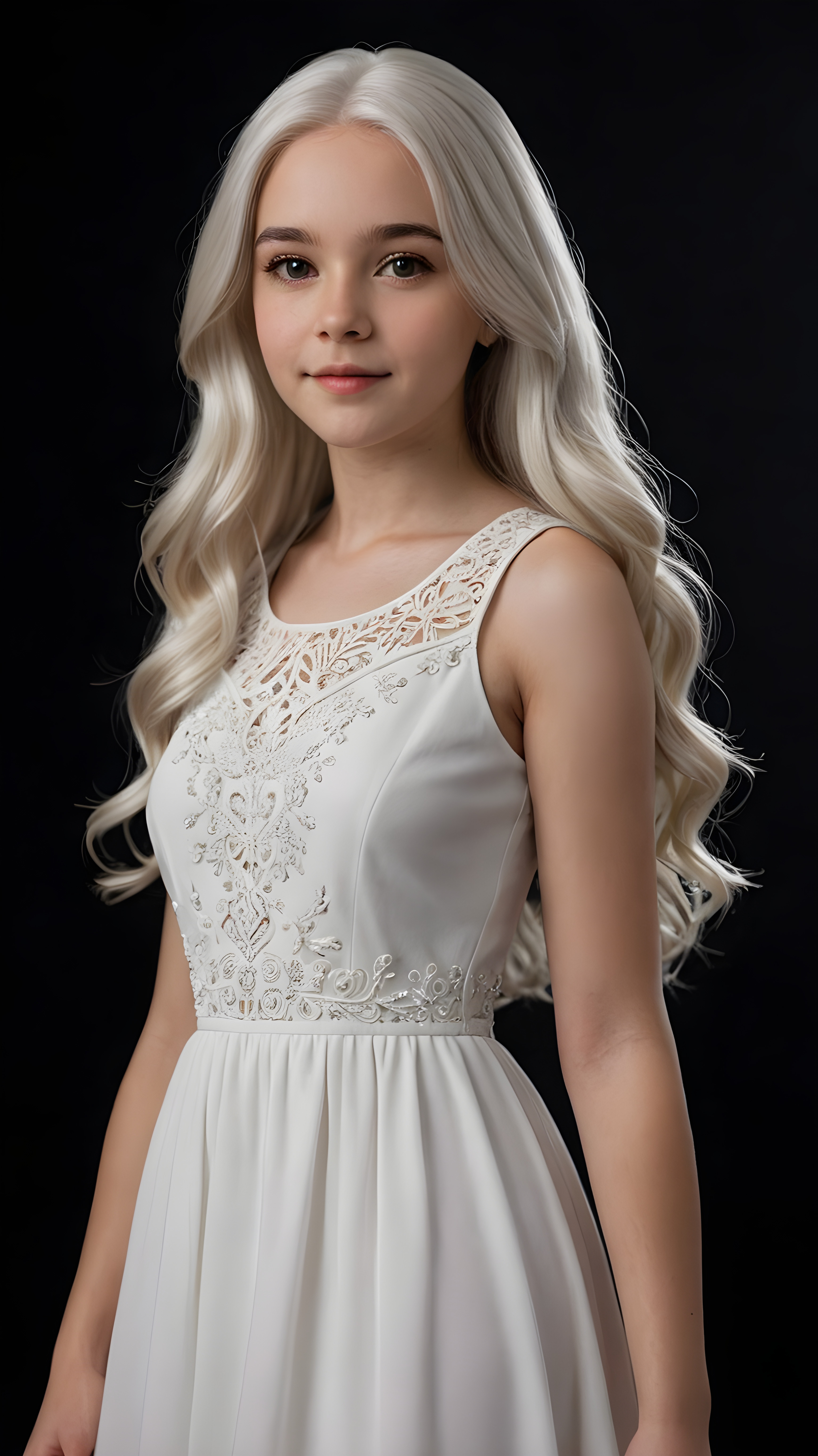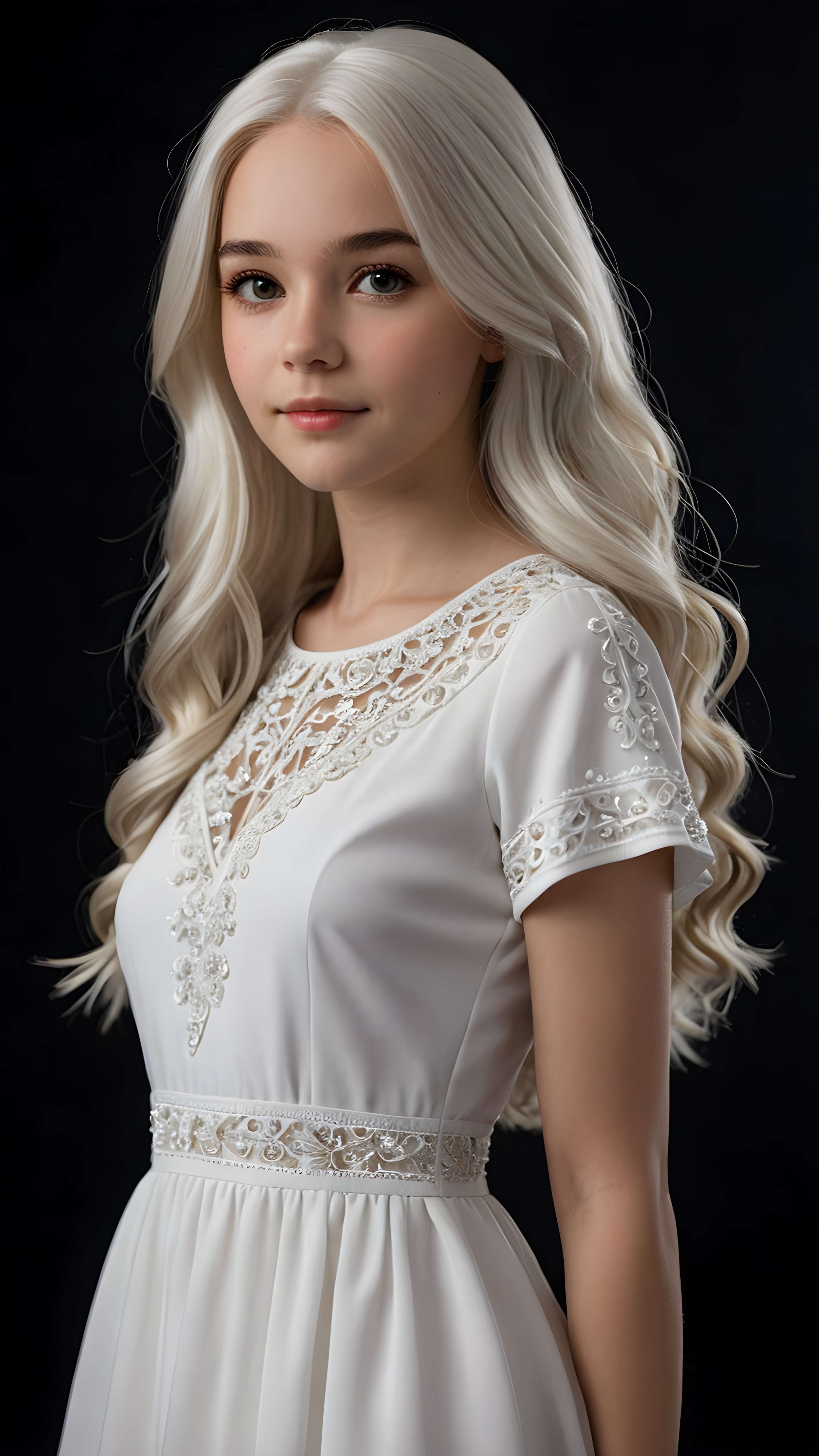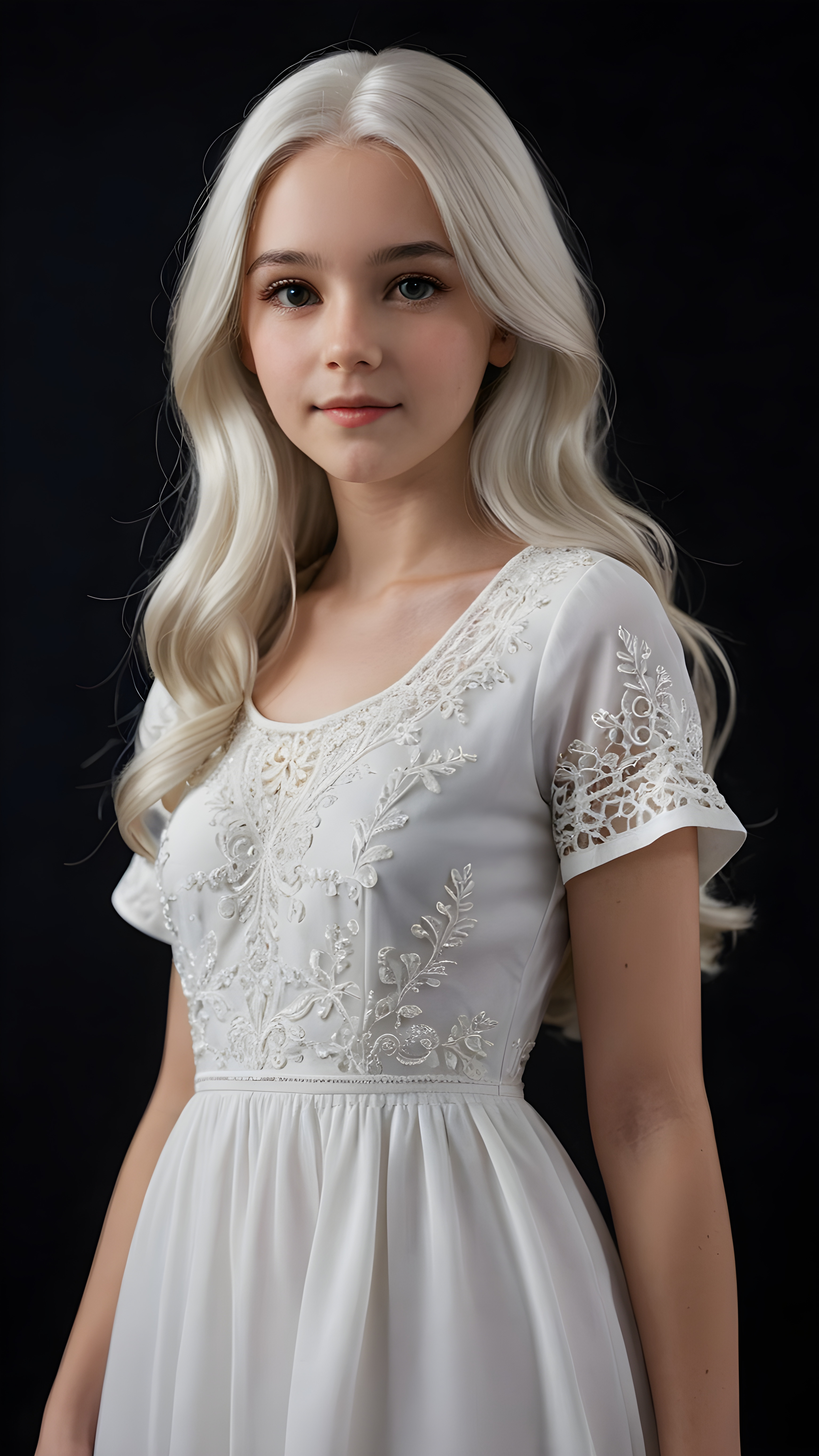 a (((super realistic and detailed)) white teenage girl with long, soft ((white hair)) and a ((white dress)), standing against a (((black backdrop))), her features and details intricate and lifelike