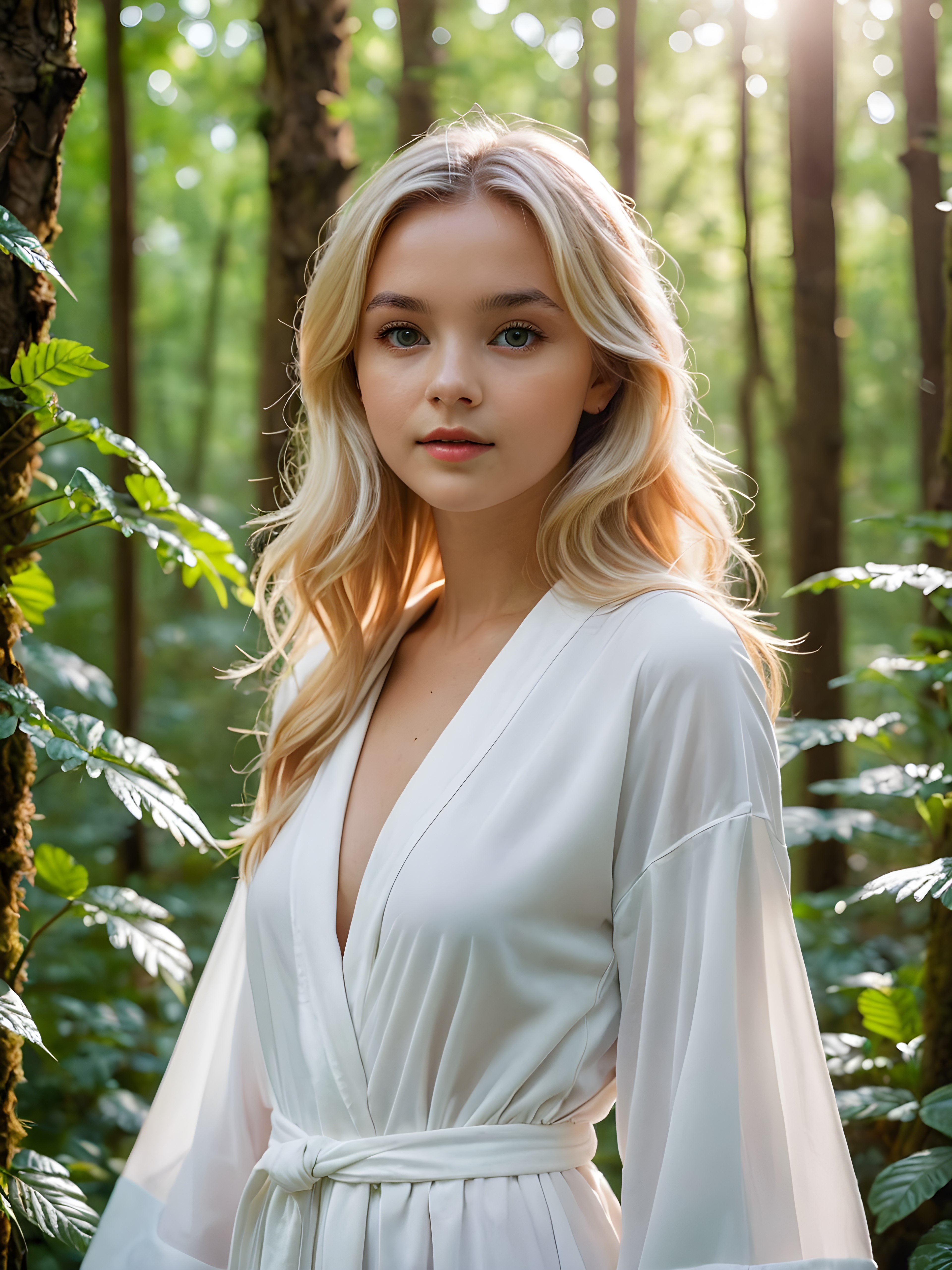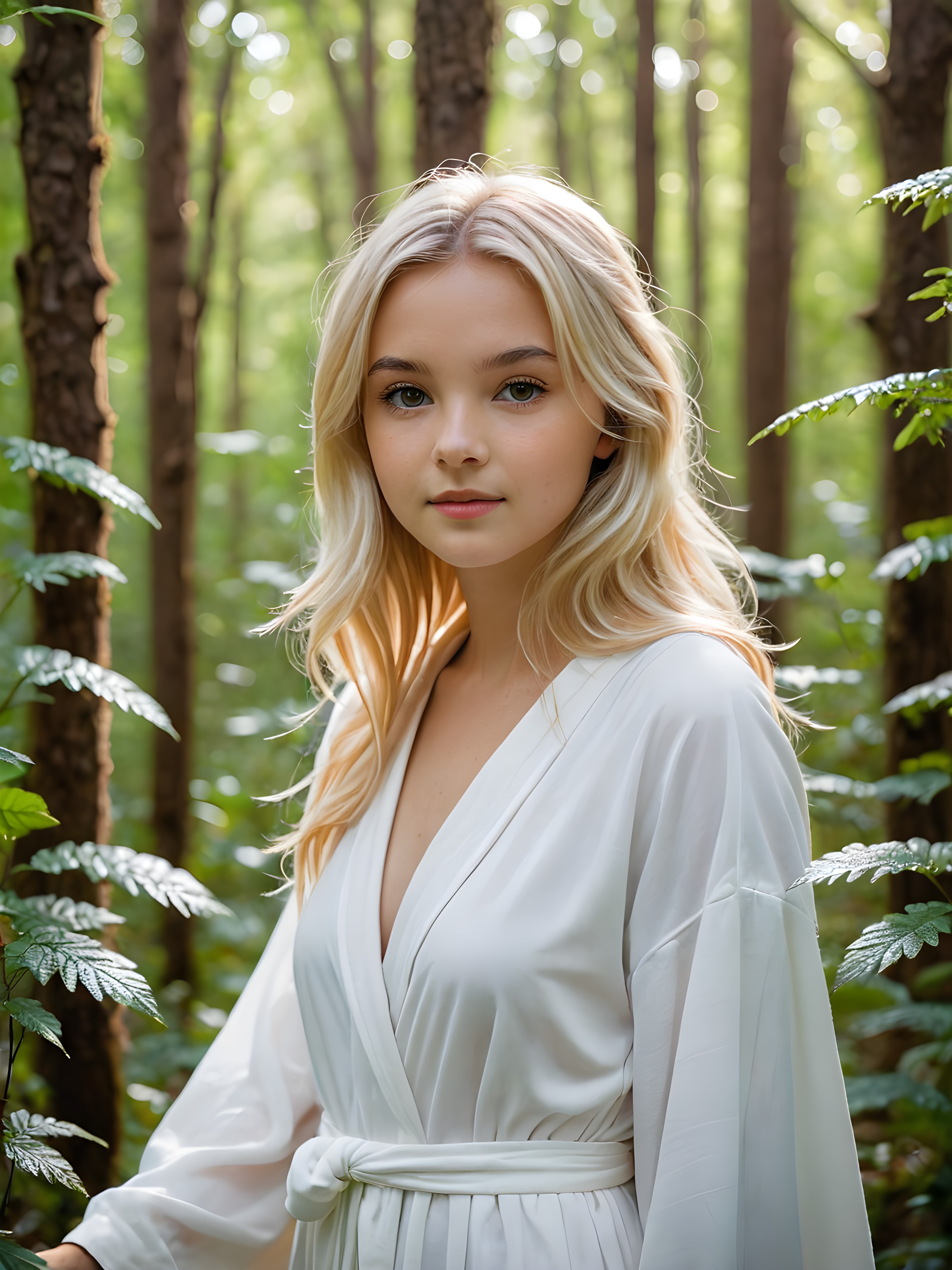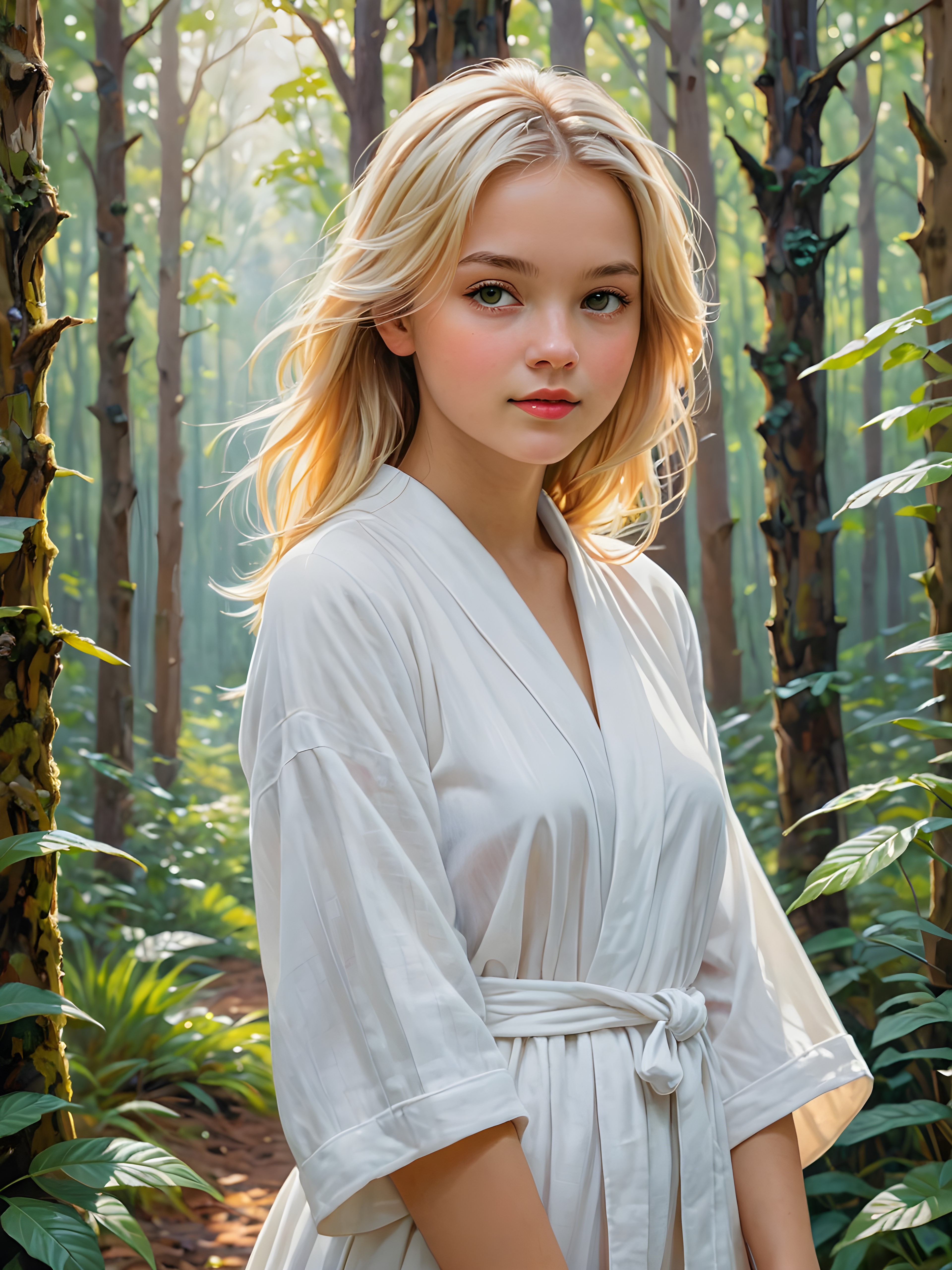 a (((sweet young girl))) in a (((mysterious forest))), where the plants emit a soft, ethereal glow that adds to the enchanting atmosphere. The girl wears a (((white, thin robe))), her blonde hair fluttering in the gentle breeze