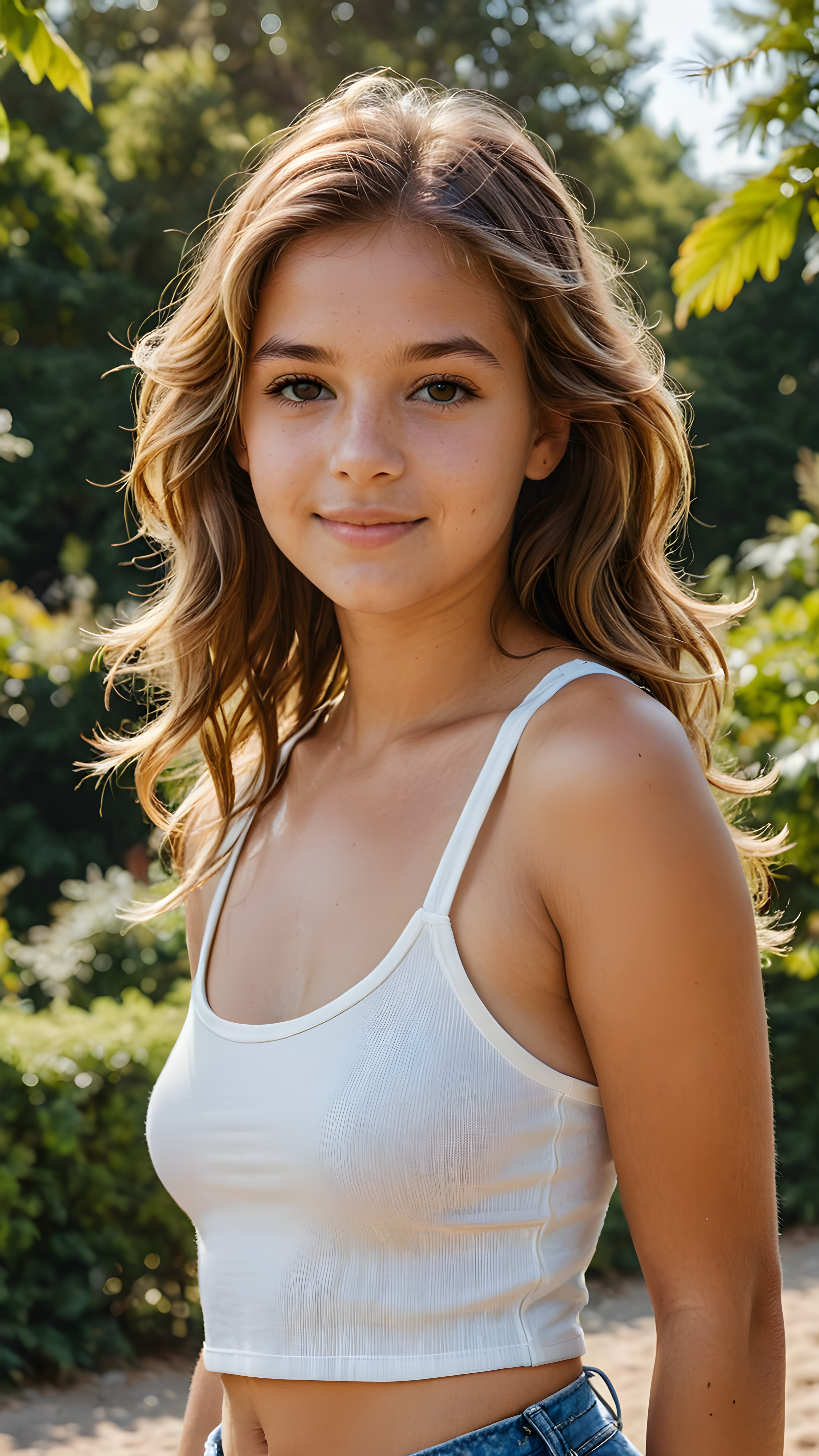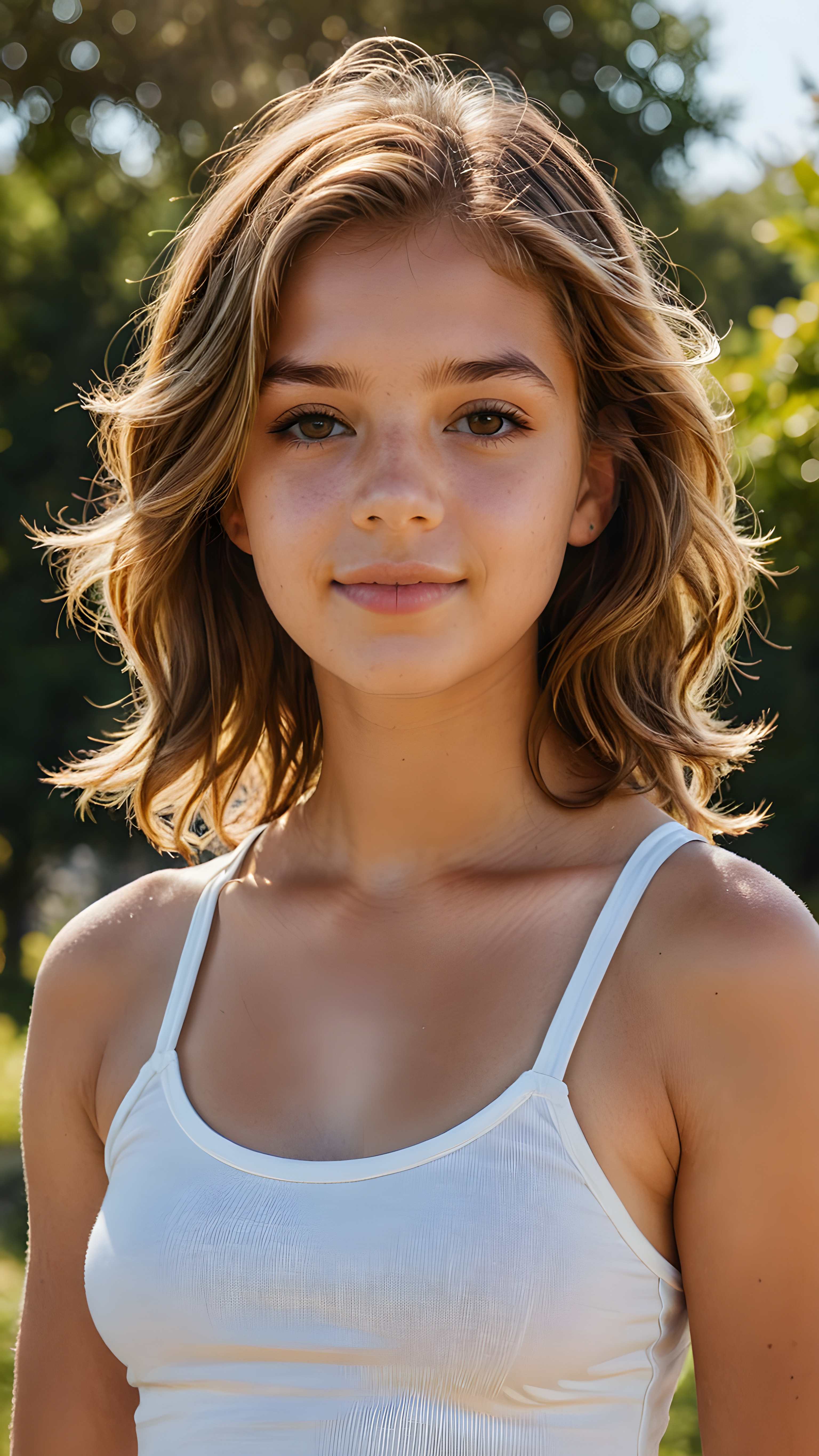 detailed and realistic portrait from a very cute ((tanned tomboy young teenage girl)), long wavy light brown hair, ((sunny summer backdrop), short cropped tank top support her perfect curvy body