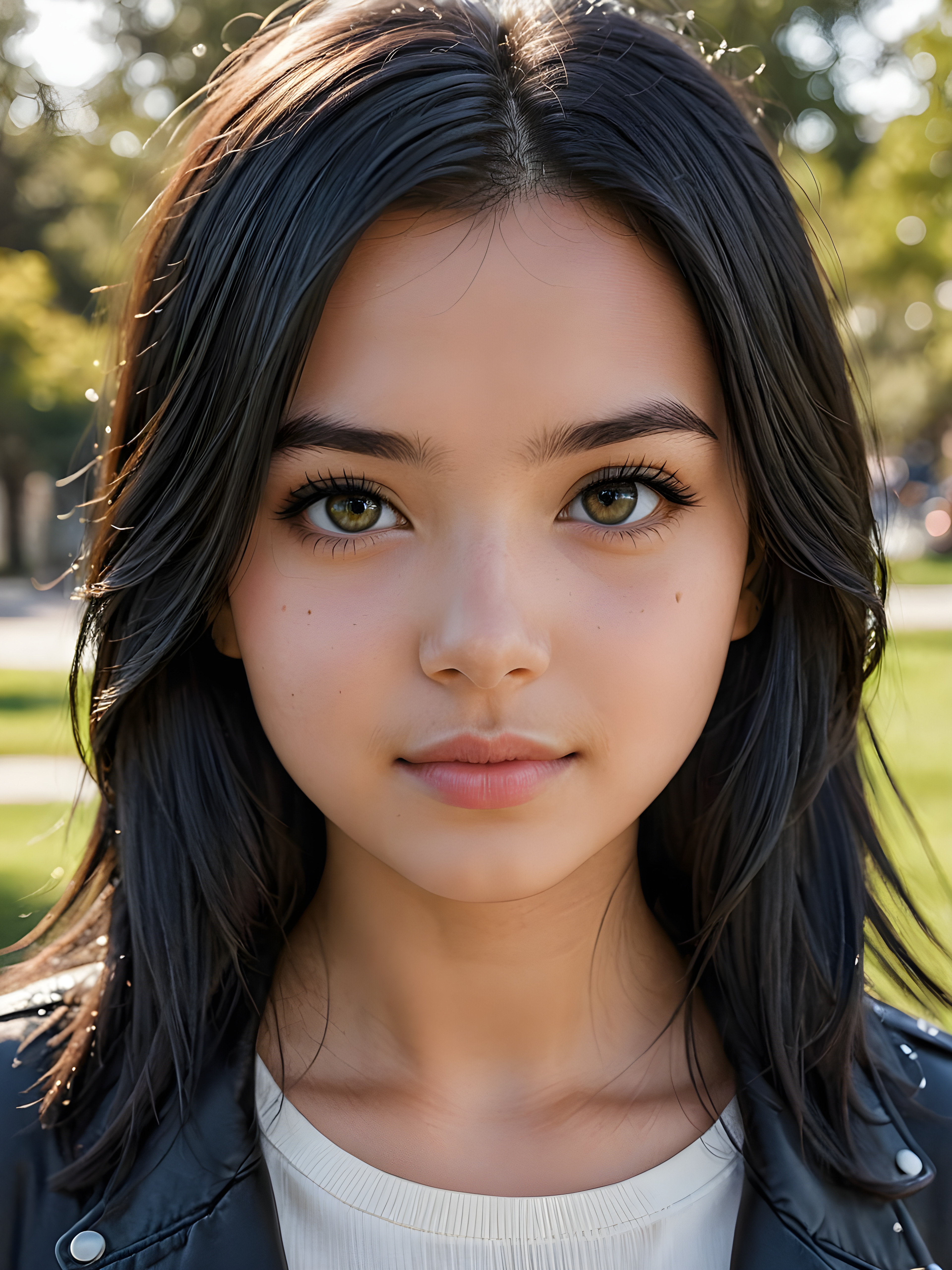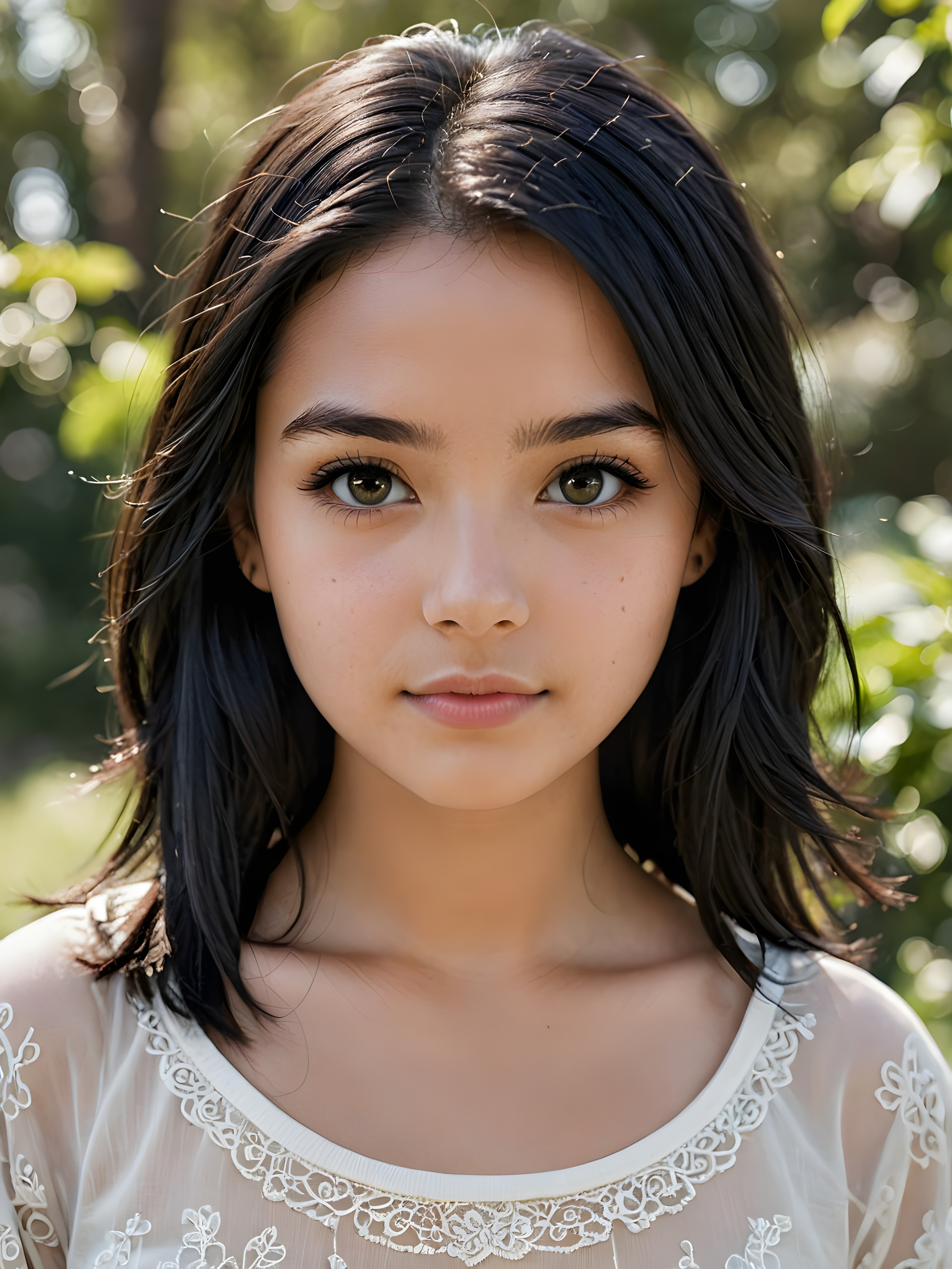 visualize a (((beautiful drawning))), capturing a (teen girl with long, straight soft brown hair, styled in a (short bob cut), her face framed by a short, bang-like fringe), and short, detailed facial features, facing forward with a serene expression, wearing a white short, crop t-shirt against a (detailed, realistic backdrop)