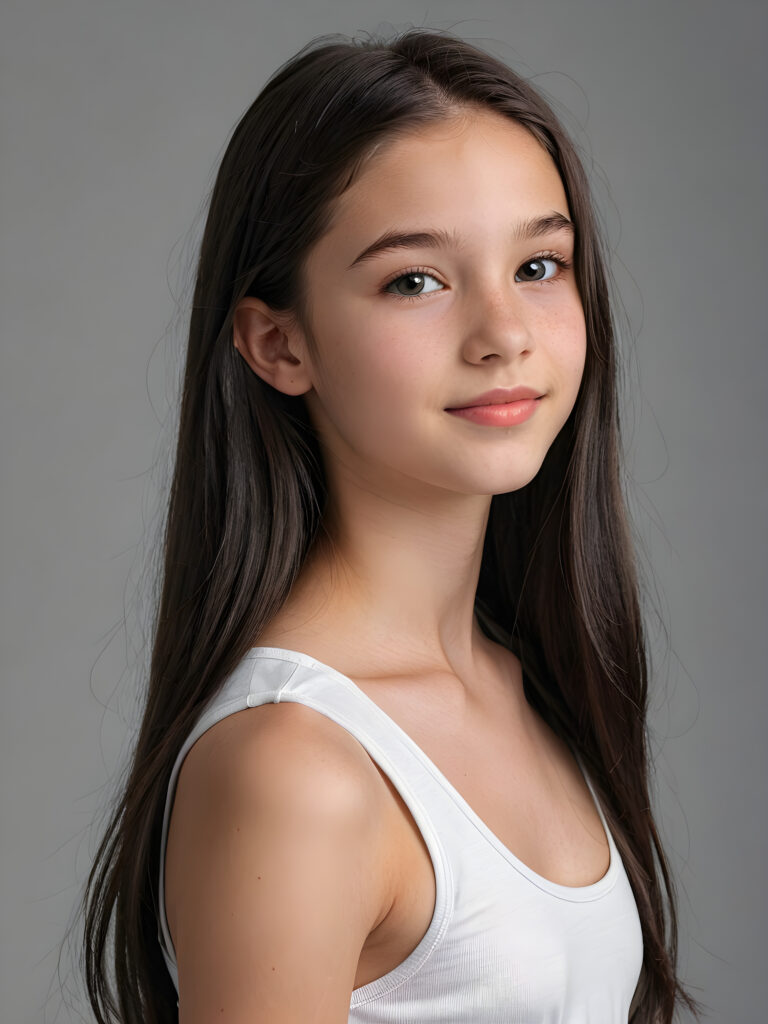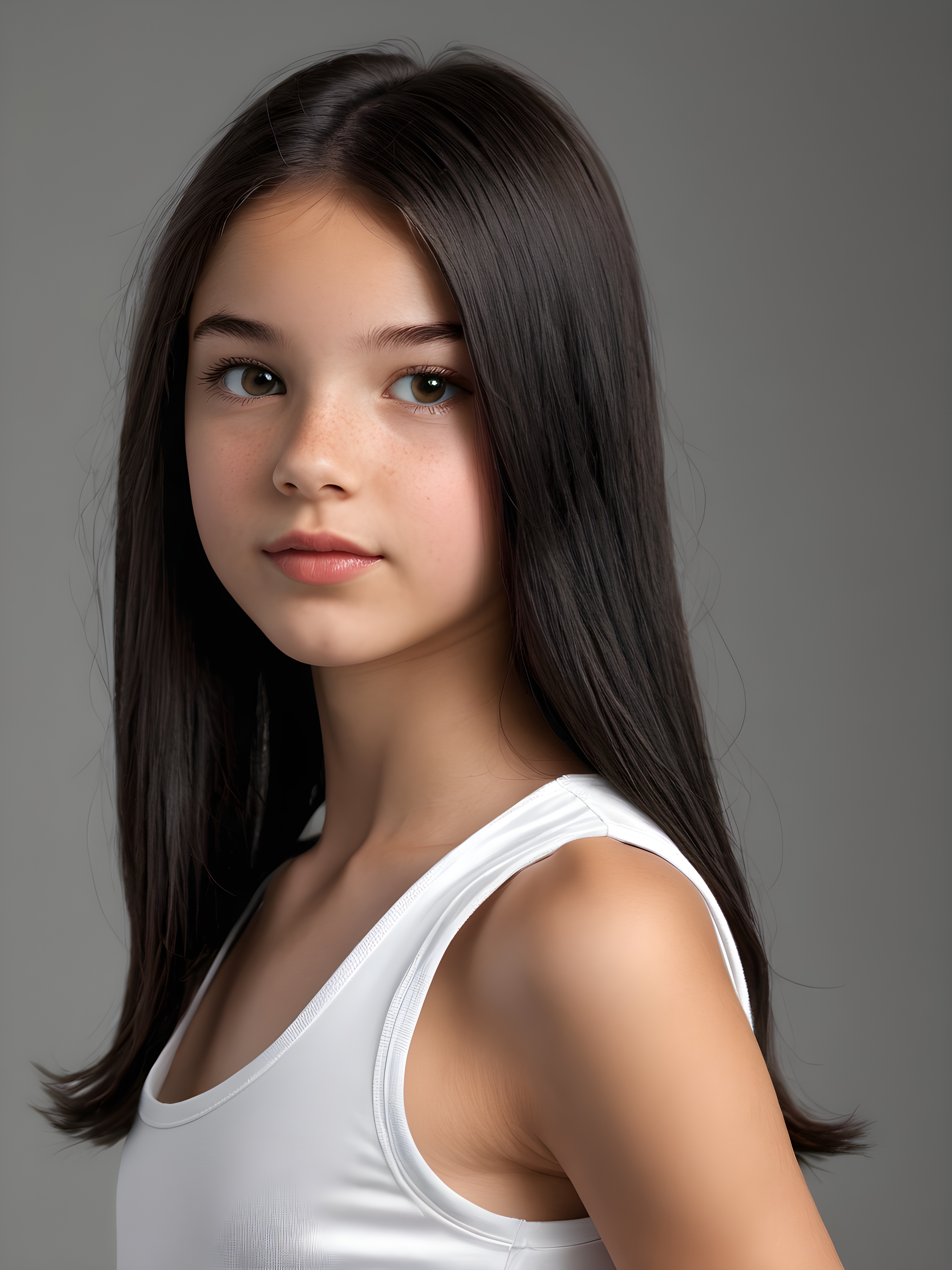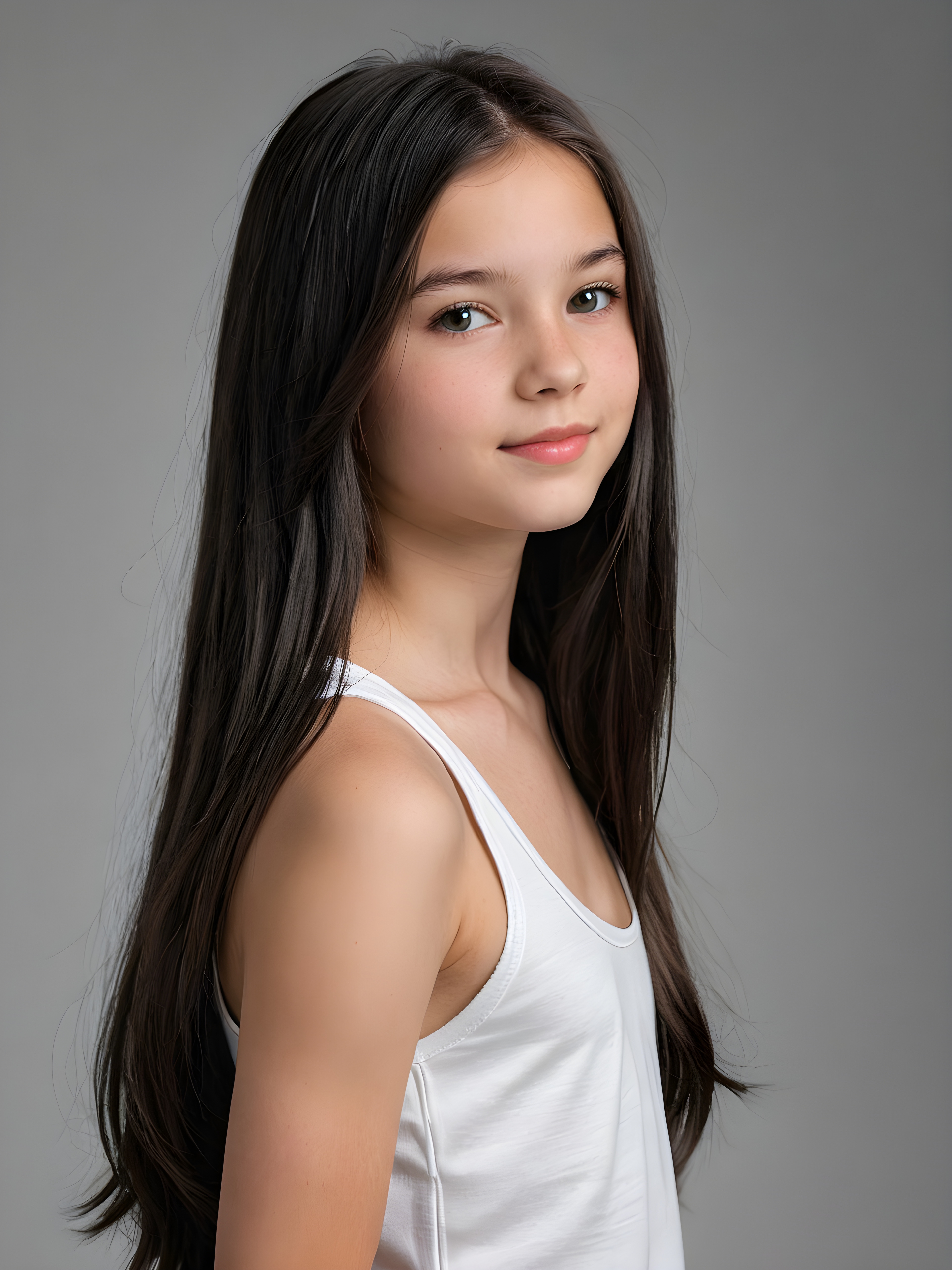 realistic and detailed portrait: a (((super cute teen girl, 13 years old, captured in upper body view))), ((flawless beautiful soft skin)), (((black soft sleek straight long hair))), angelic round face with full lips, emoting joy, framed in a side profile portrait shot against a (((grey backdrop))), with perfect anatomics and curved body, wears a (((super short thin white crop tank top))), ((side view))