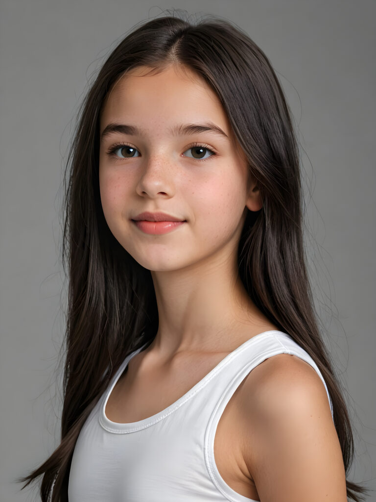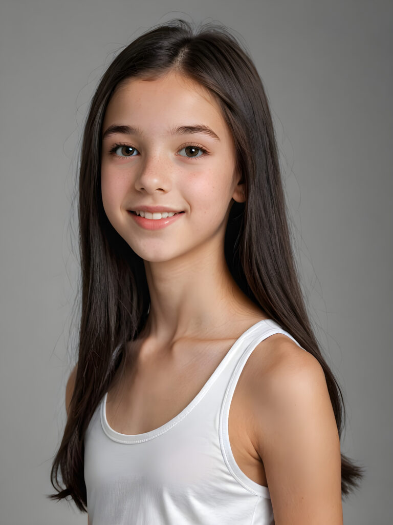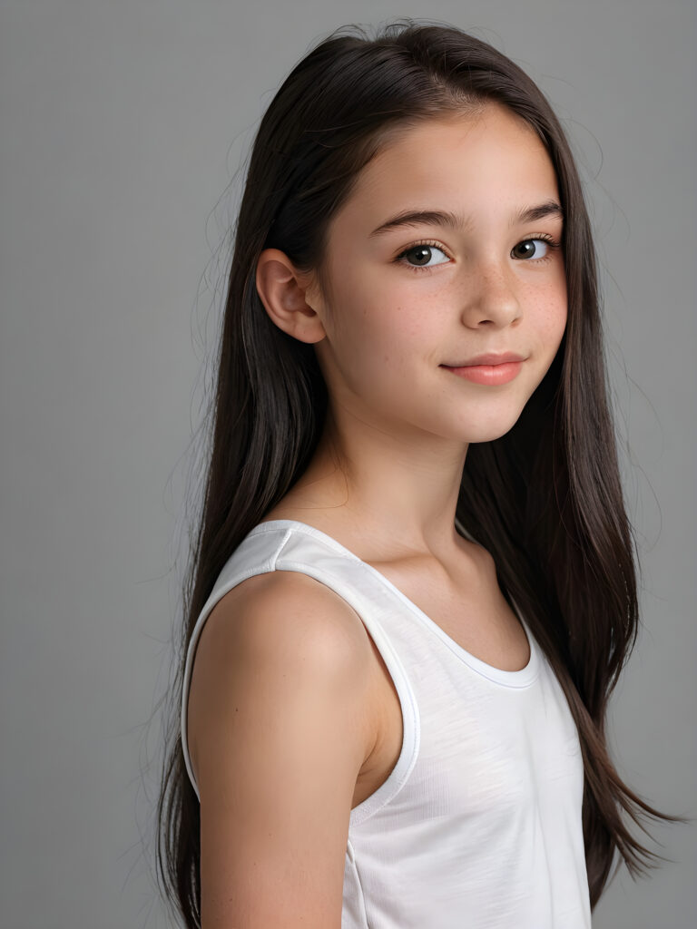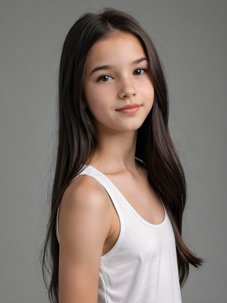 realistic and detailed portrait: a (((super cute teen girl, 13 years old, captured in upper body view))), ((flawless beautiful soft skin)), (((black soft sleek straight long hair))), angelic round face with full lips, emoting joy, framed in a side profile portrait shot against a (((grey backdrop))), with perfect anatomics and curved body, wears a (((super short thin white crop tank top))), ((side view))