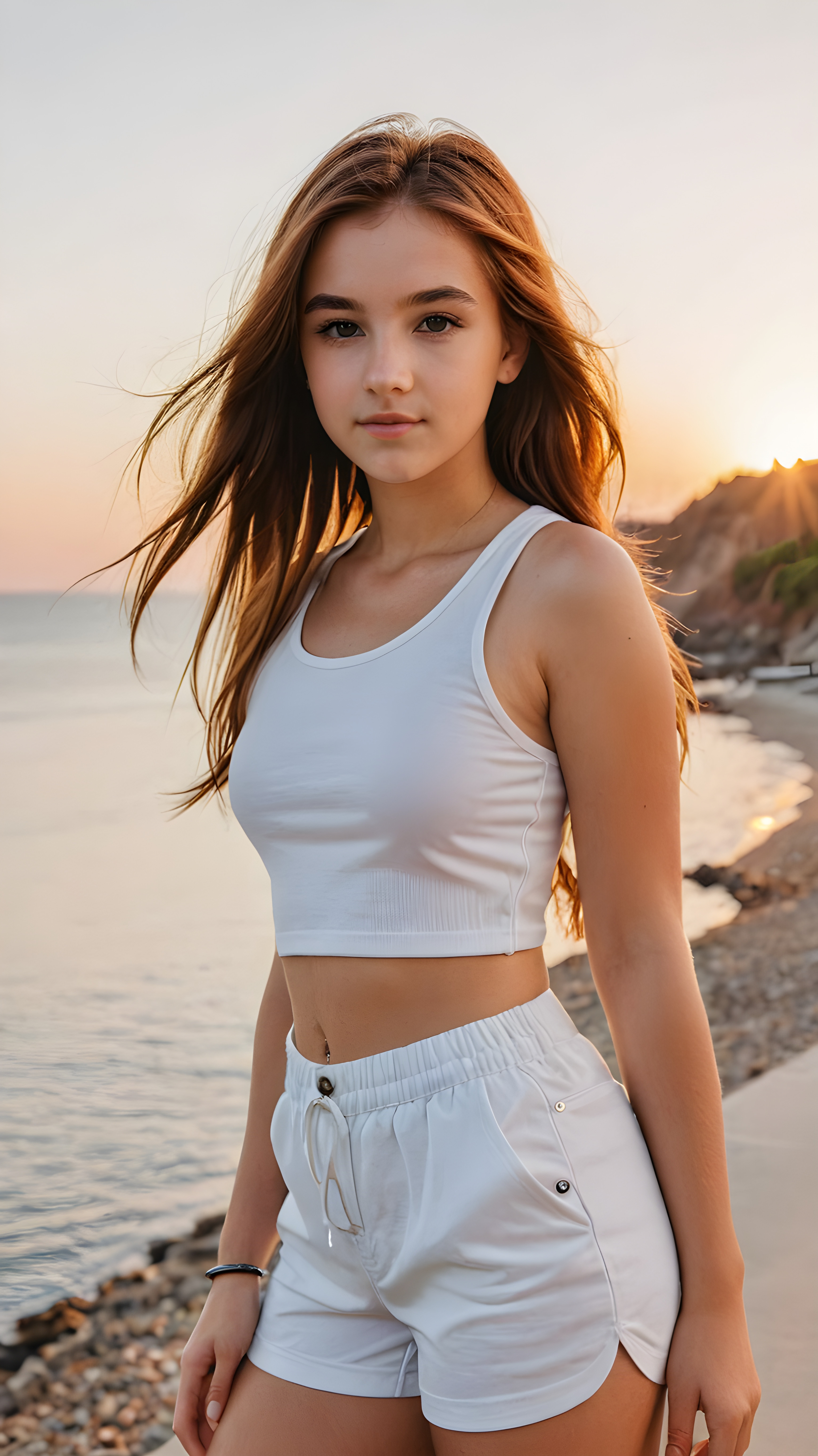 realistic and detailed portrait: a (((teenage girl))) in a white sleek, cropped tank top and fitted ((shorts)) that show off every curve of her youthful form, sunset in backdrop, long straight copper hair