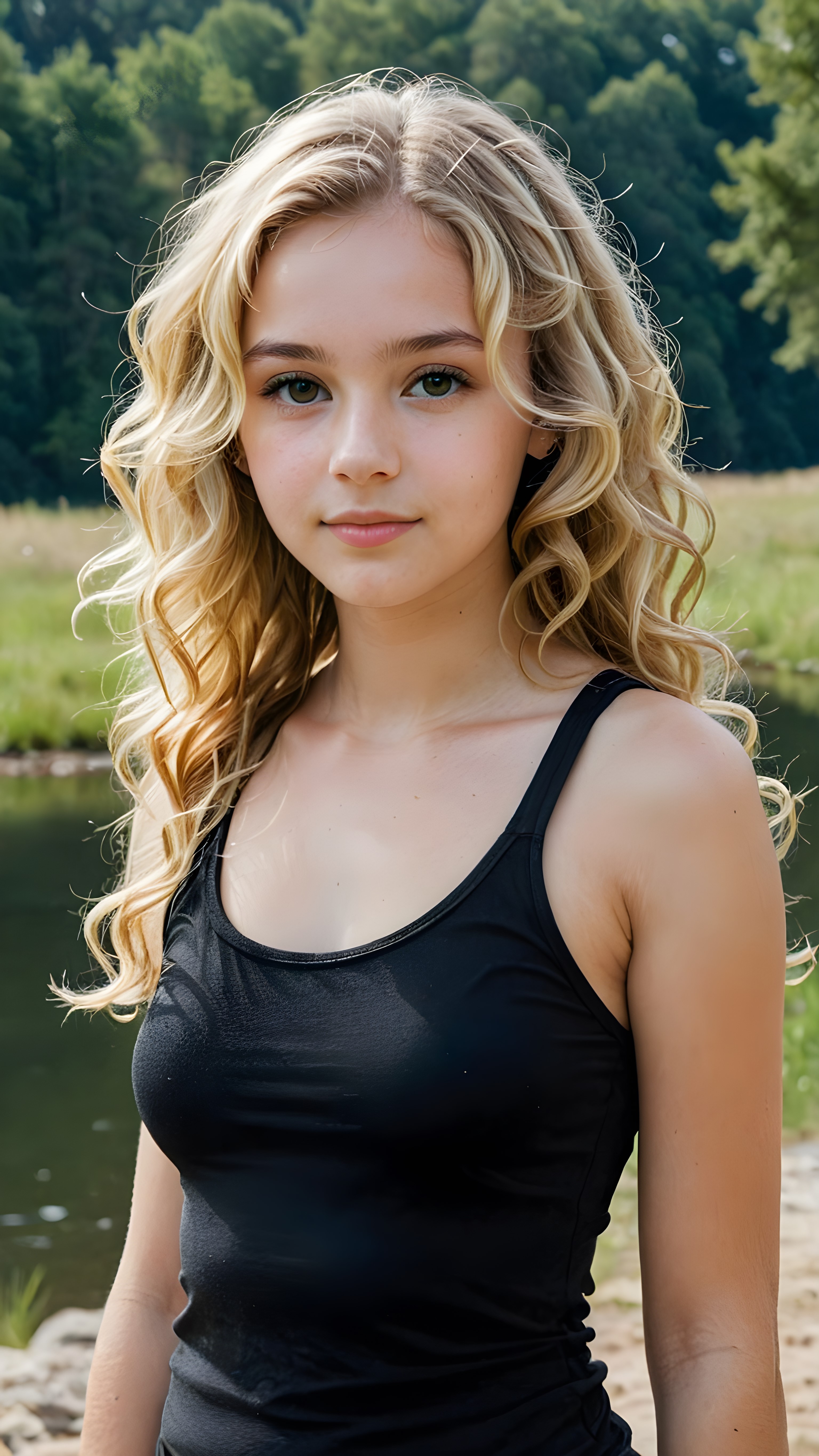 a (((detailed and realistic portrait))), featuring a gently drawn (((natural beautiful teen girl))) with long, (((semi-curly, soft blonde hair))), wearing a sleek, ((black tight tank top)), set against a backdrop of a serene, naturally occurring landscape with its perfect contours mirroring the girl’s form