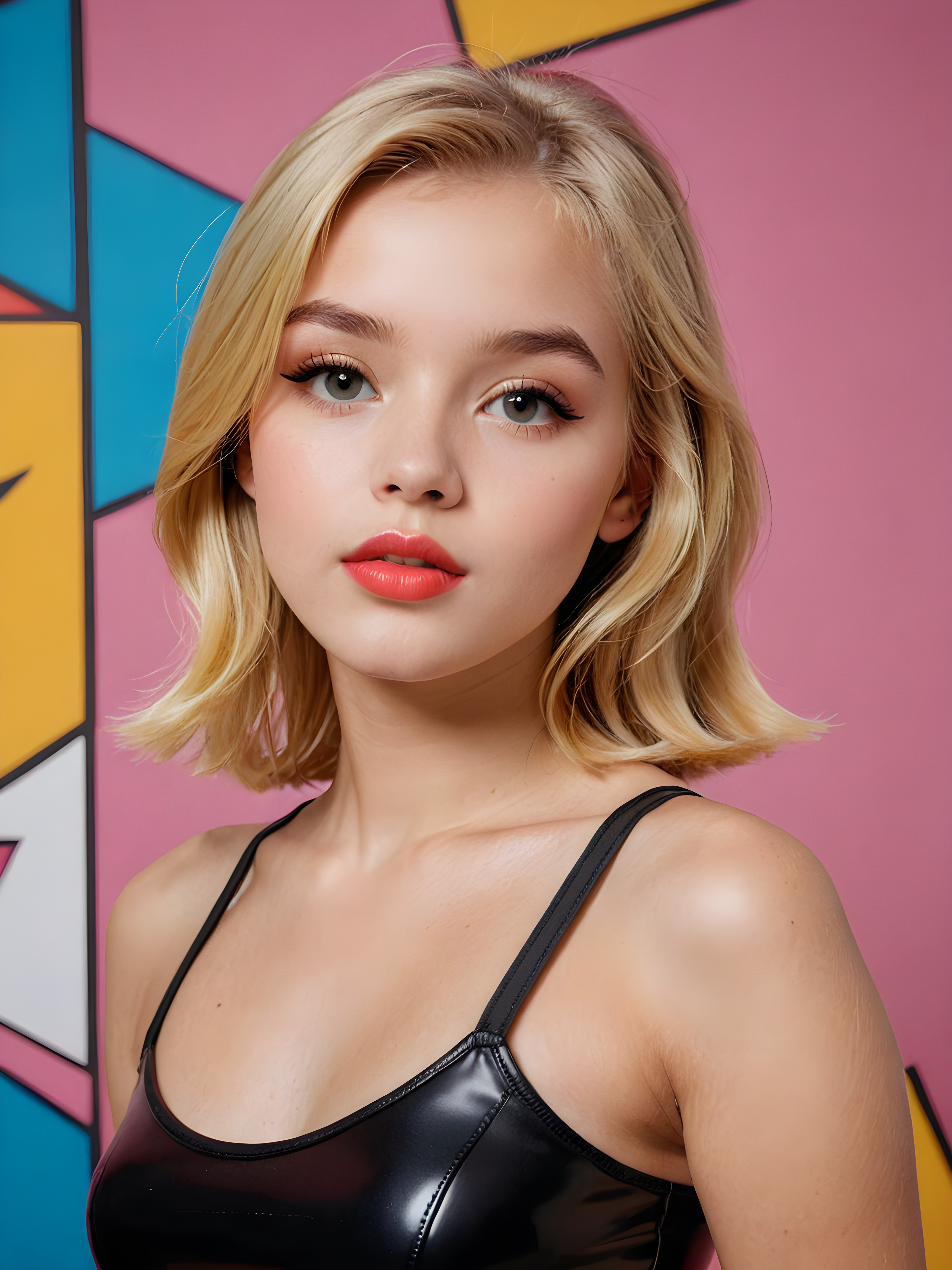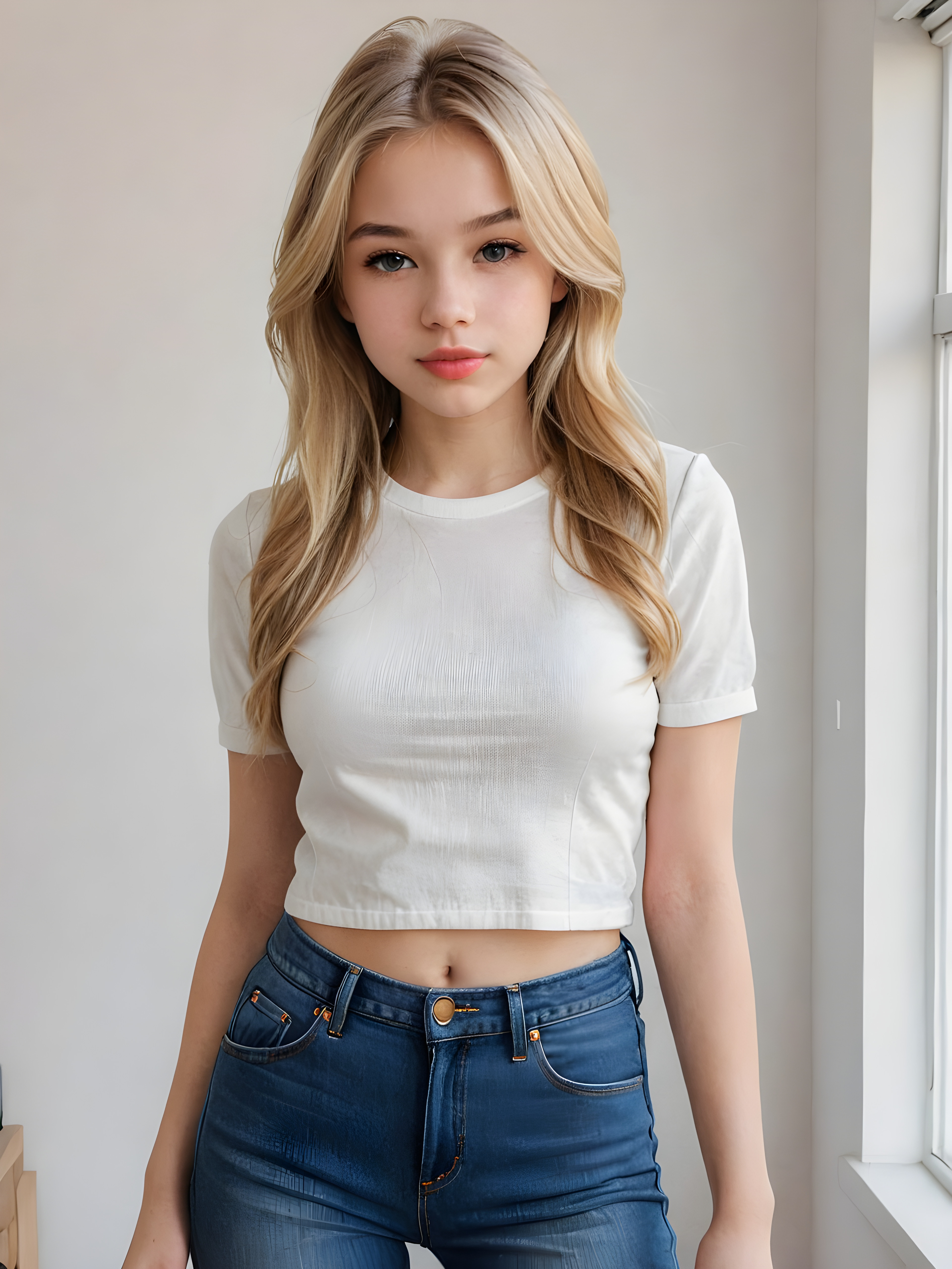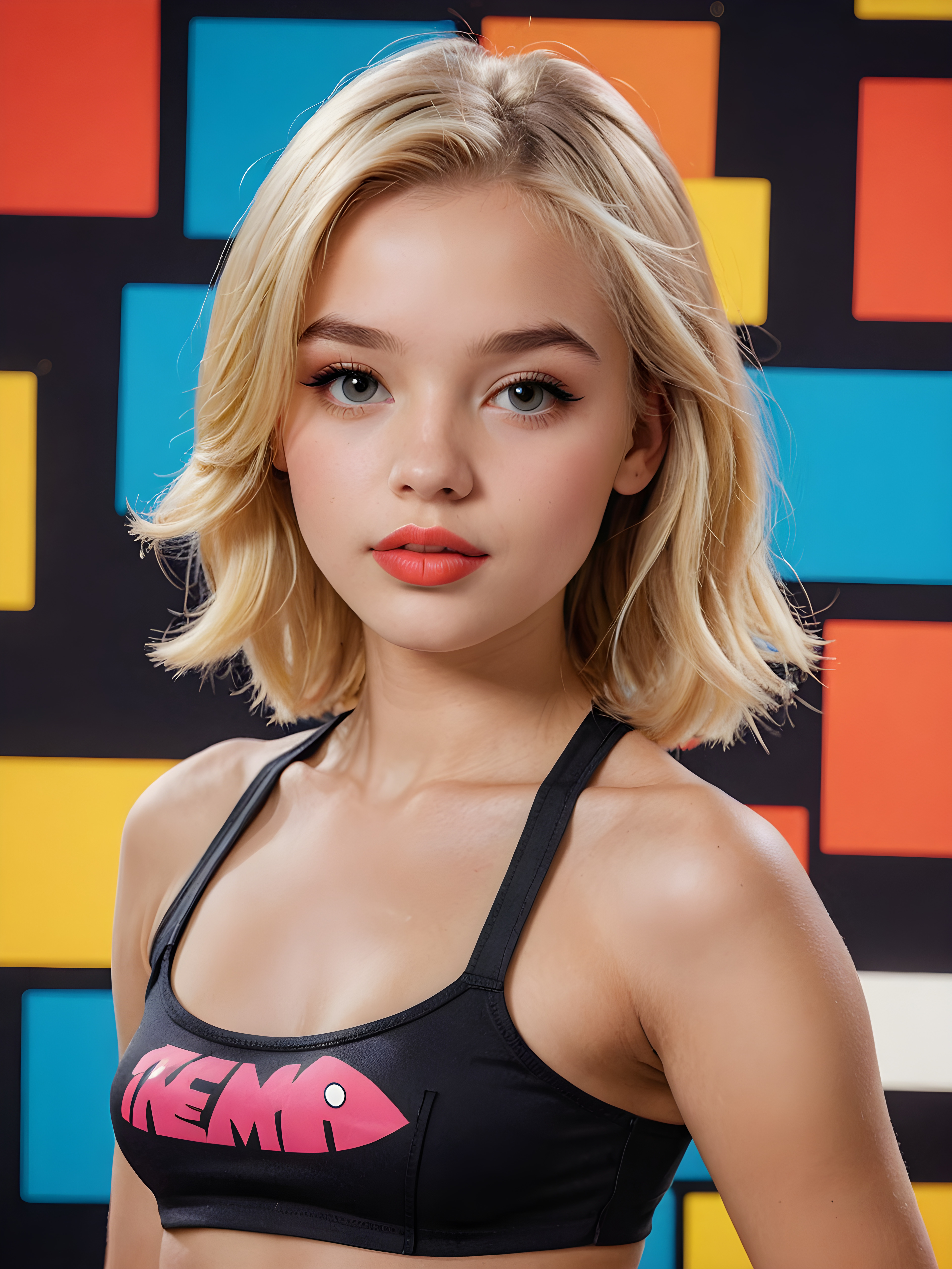 detailed and realistic photo from a (((cute pop art teen girl))) with straight, sleek blonde soft hair and (((kissable lips))), dressed in a ((crop thin top, perfect curved body))