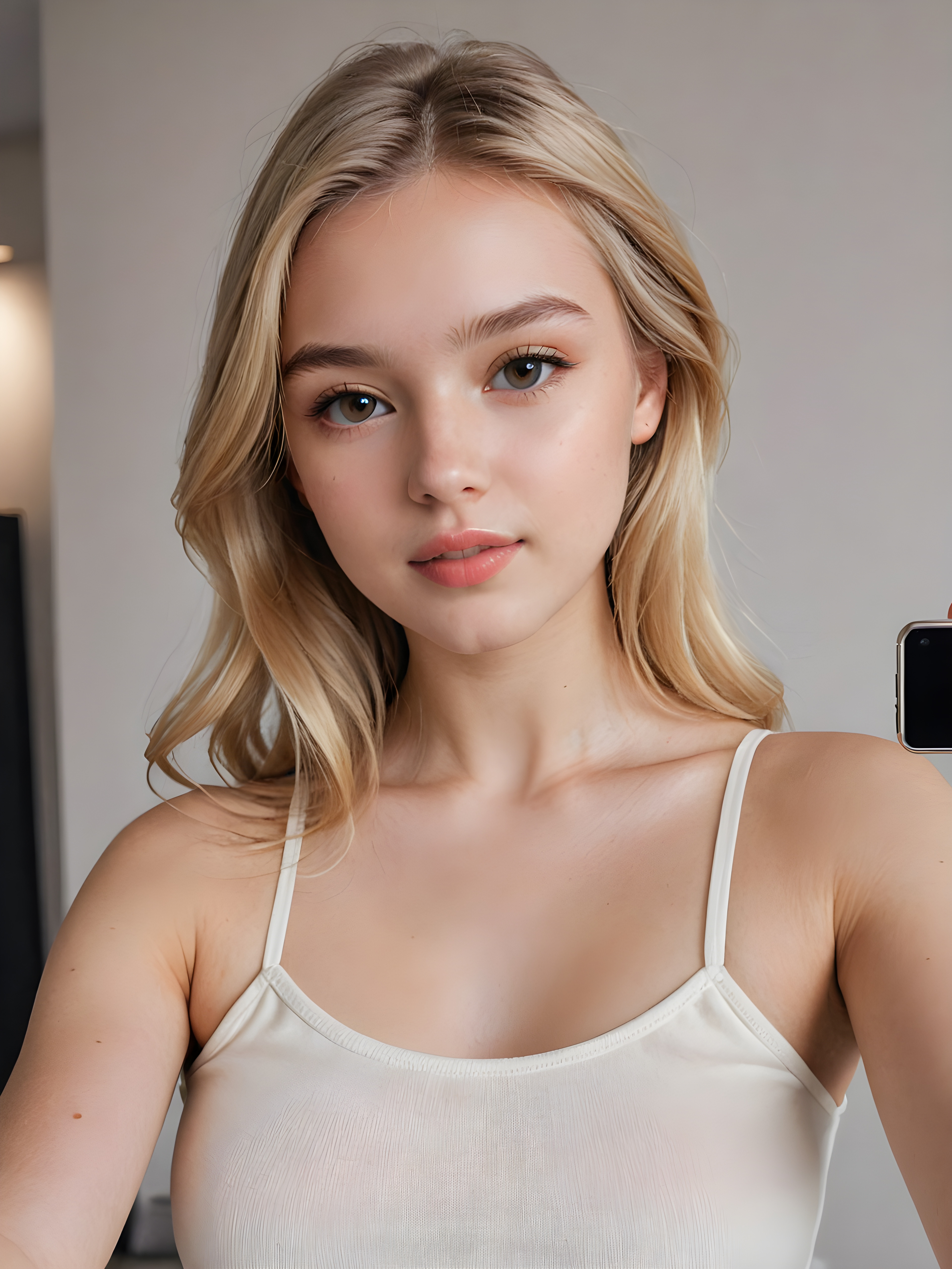 detailed and realistic photo from a (((cute teen girl (take a selfie)))) with straight, sleek blonde soft hair and (((kissable lips))), dressed in a (((minimalist wardrobe))) ((crop thin top, perfect curved body))