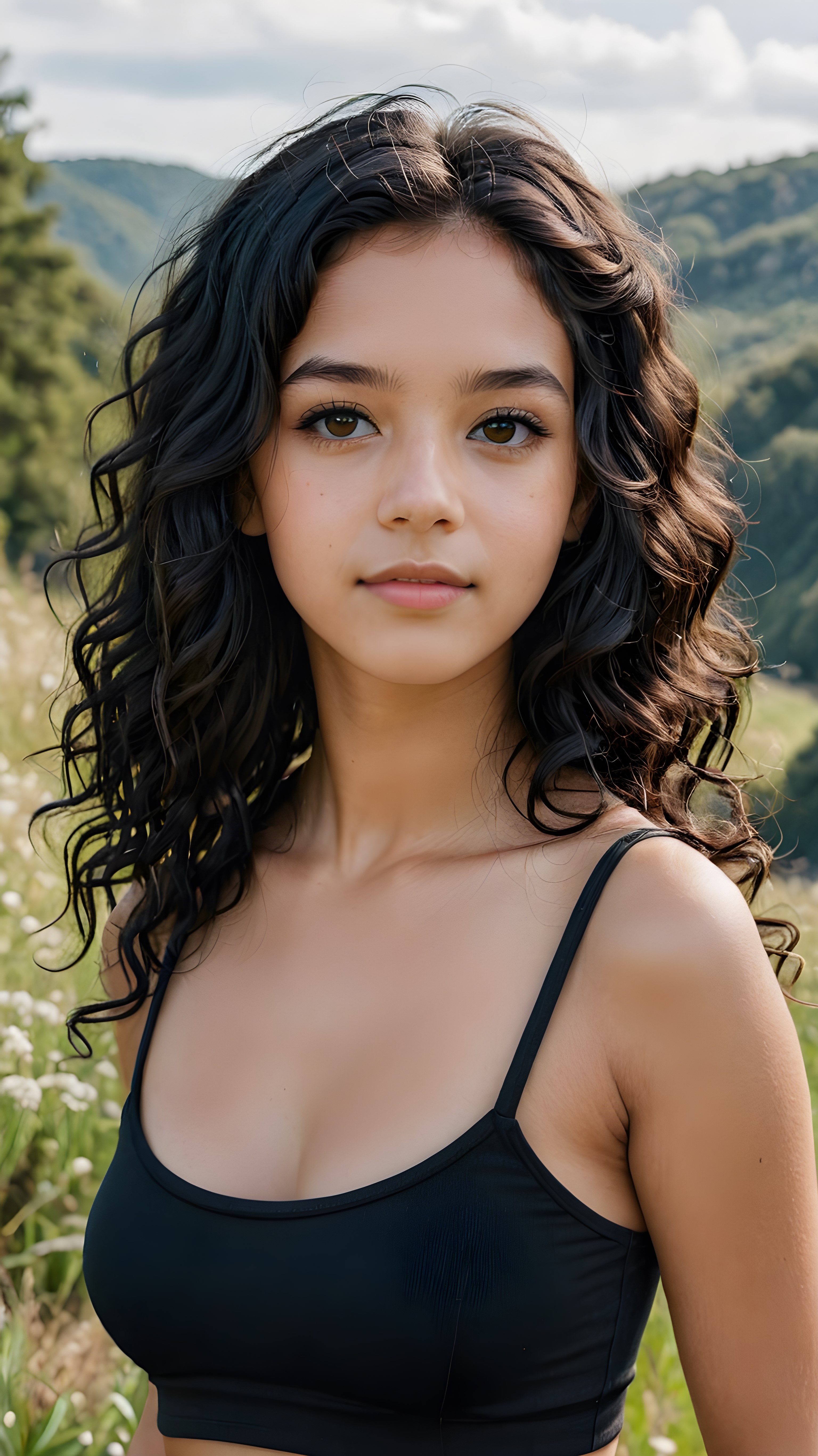detailed and realistic portrait: a natural beautiful teen girl with long semi curly soft black hair wearing a black tight crop top, in a beautiful natural place