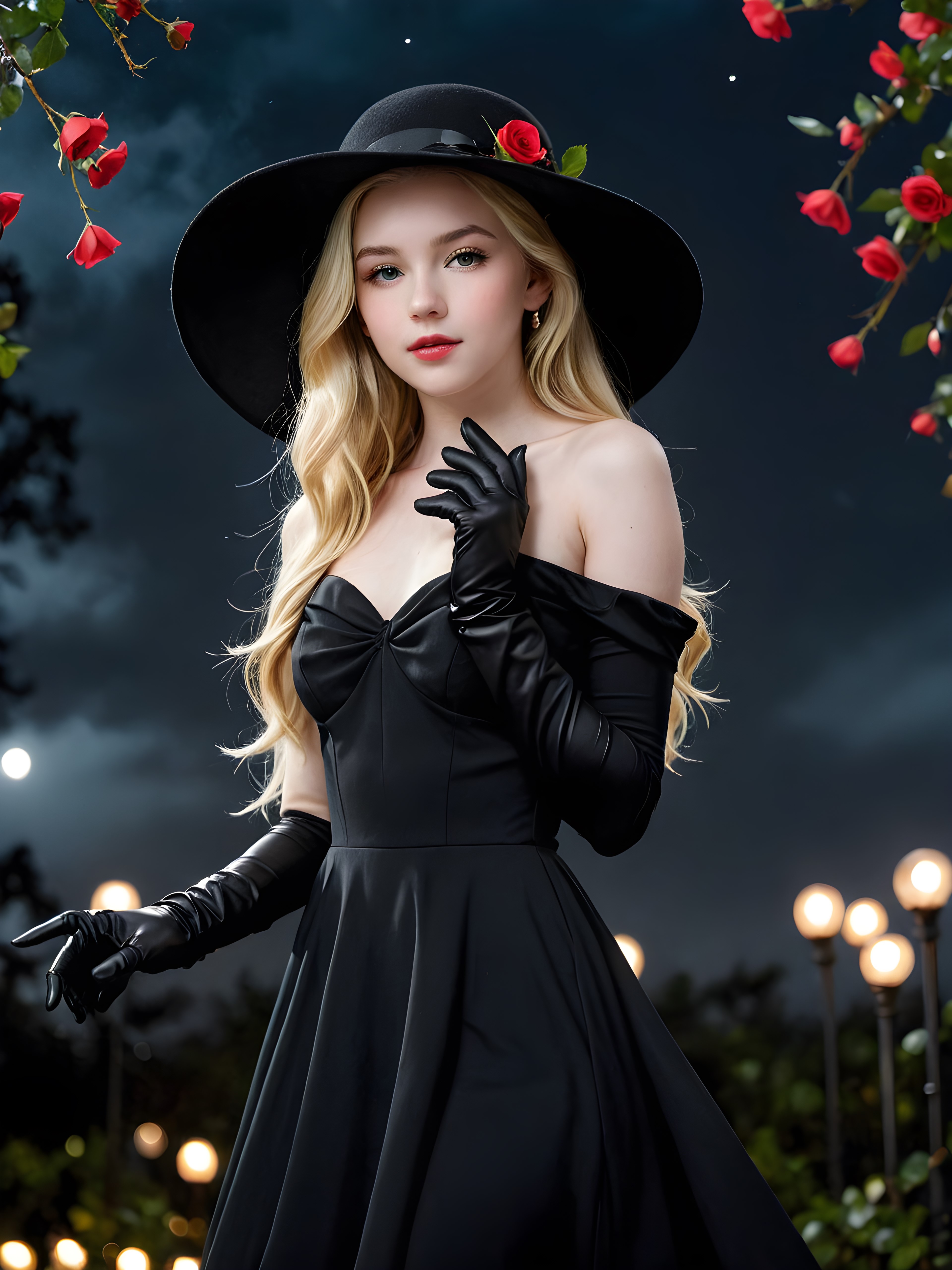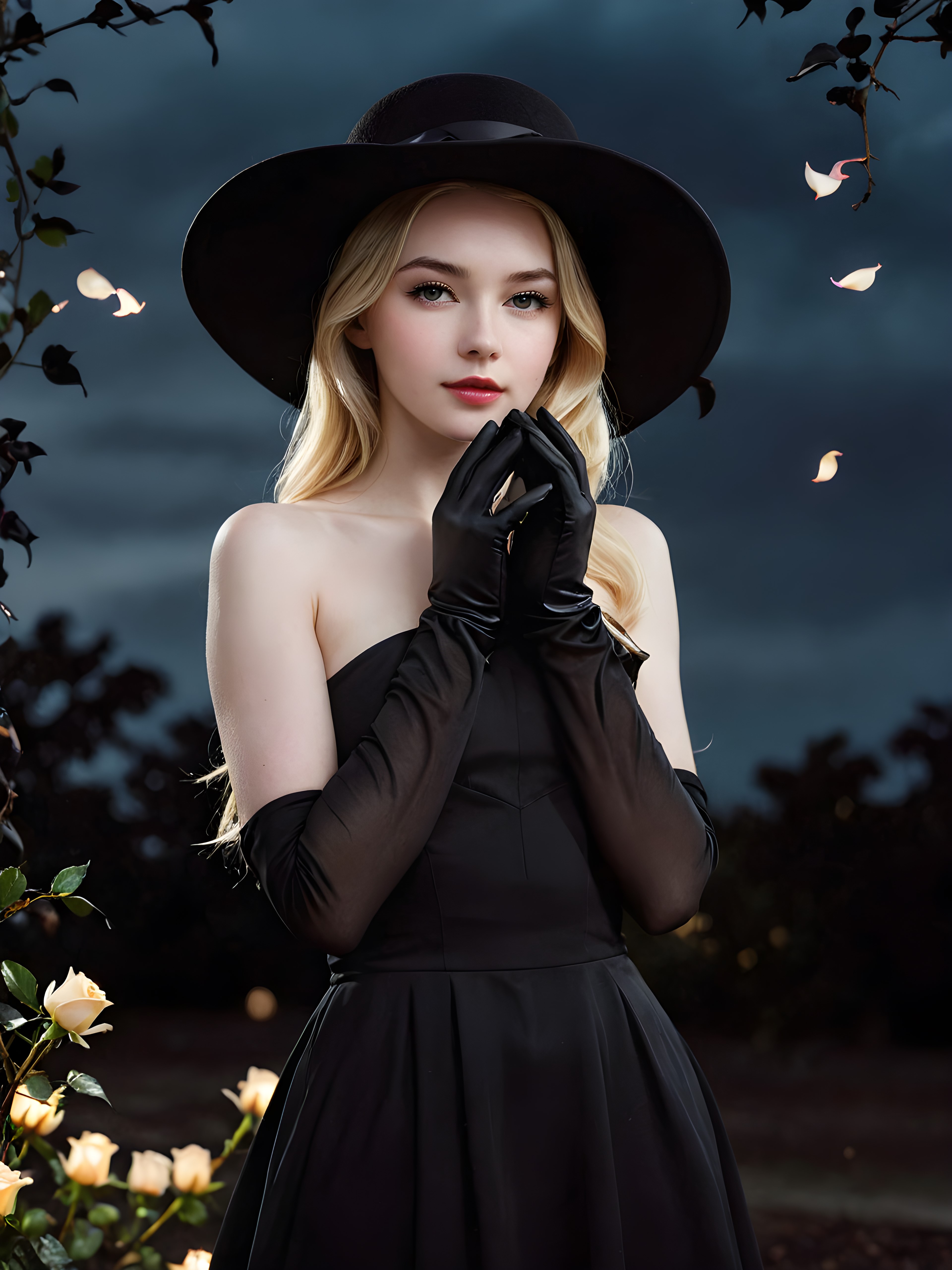 visualize an (((enchantingly beautiful teen girl))) with (((pale white skin))), dressed in a (((long, sleek black dress))), accessorizing with (((classic black gloves))), a flowing (((black hat))), and a halo of (((black rose petals))), emanating an ethereal glow under the (((softly illuminated night sky))), set against a (((distinctly dark backdrop of interwoven black roses)))