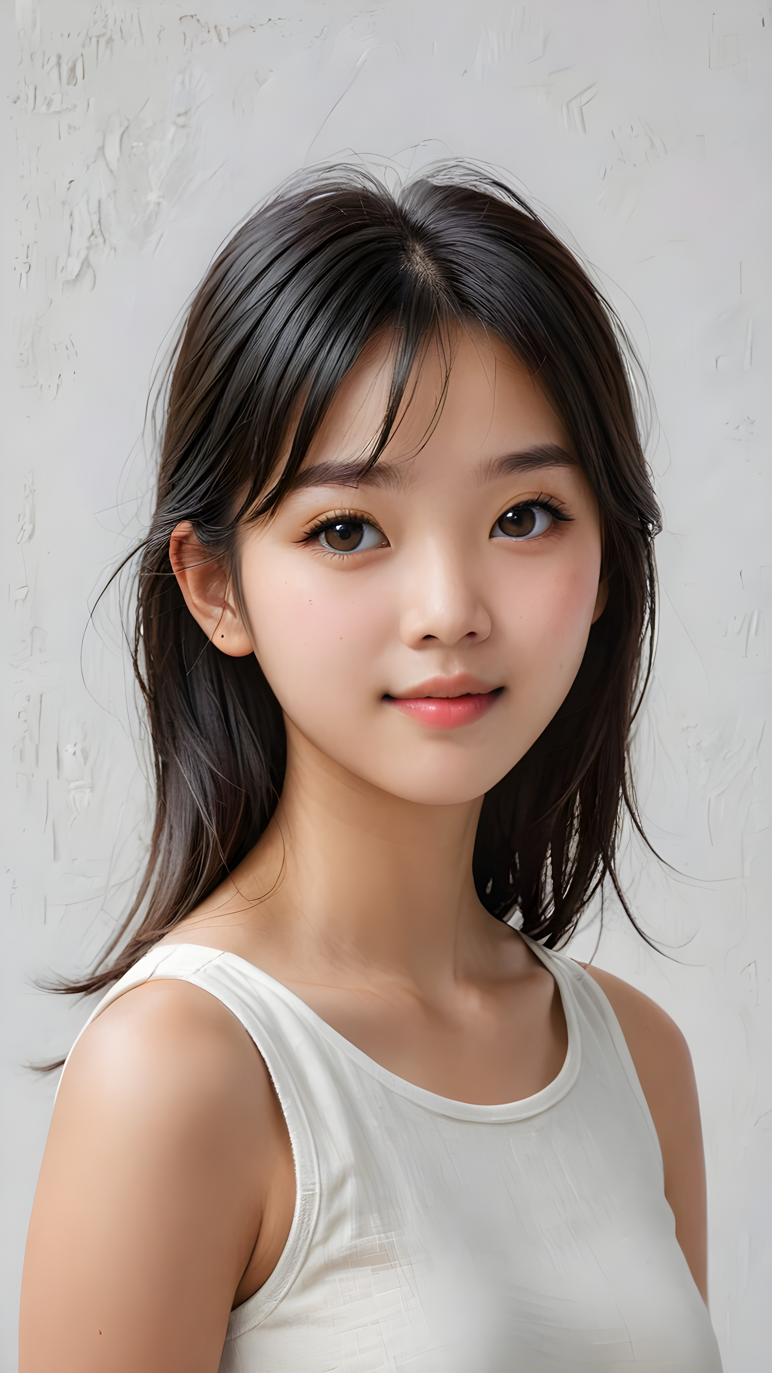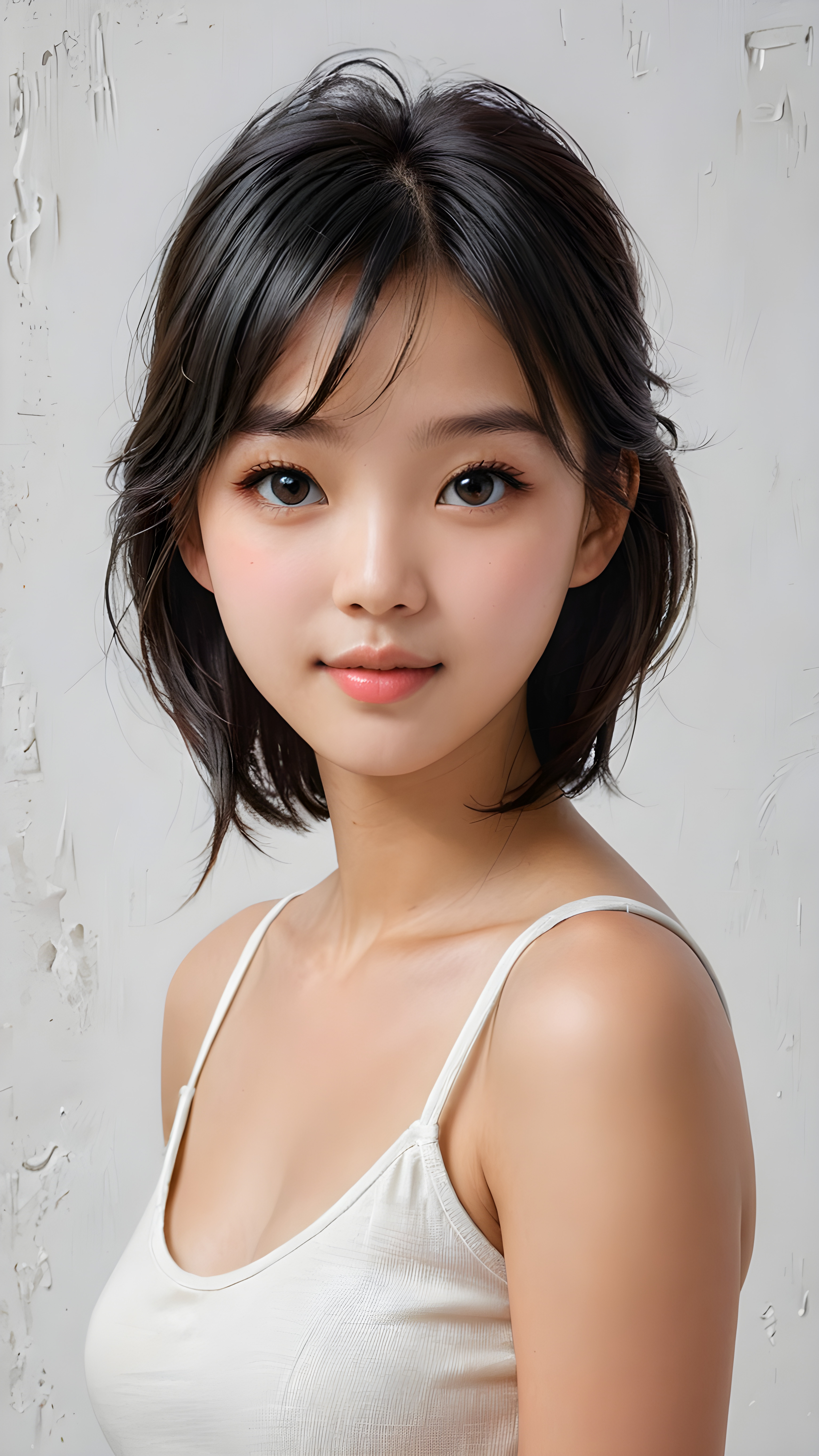 a (((breathtakingly realistic portrait))) capturing the essence of a cute youthful Korean teen girl, 15 years old, warm smile, with a flawlessly proportioned upper body, perfect curved fit body, straight, long, soft obsidian black hair in bangs cut, flawless, beautiful smooth skin, round angelic face with full kissable lips, wearing a thin and super sleek tank top, poised confidently against a (((white canvas background)))