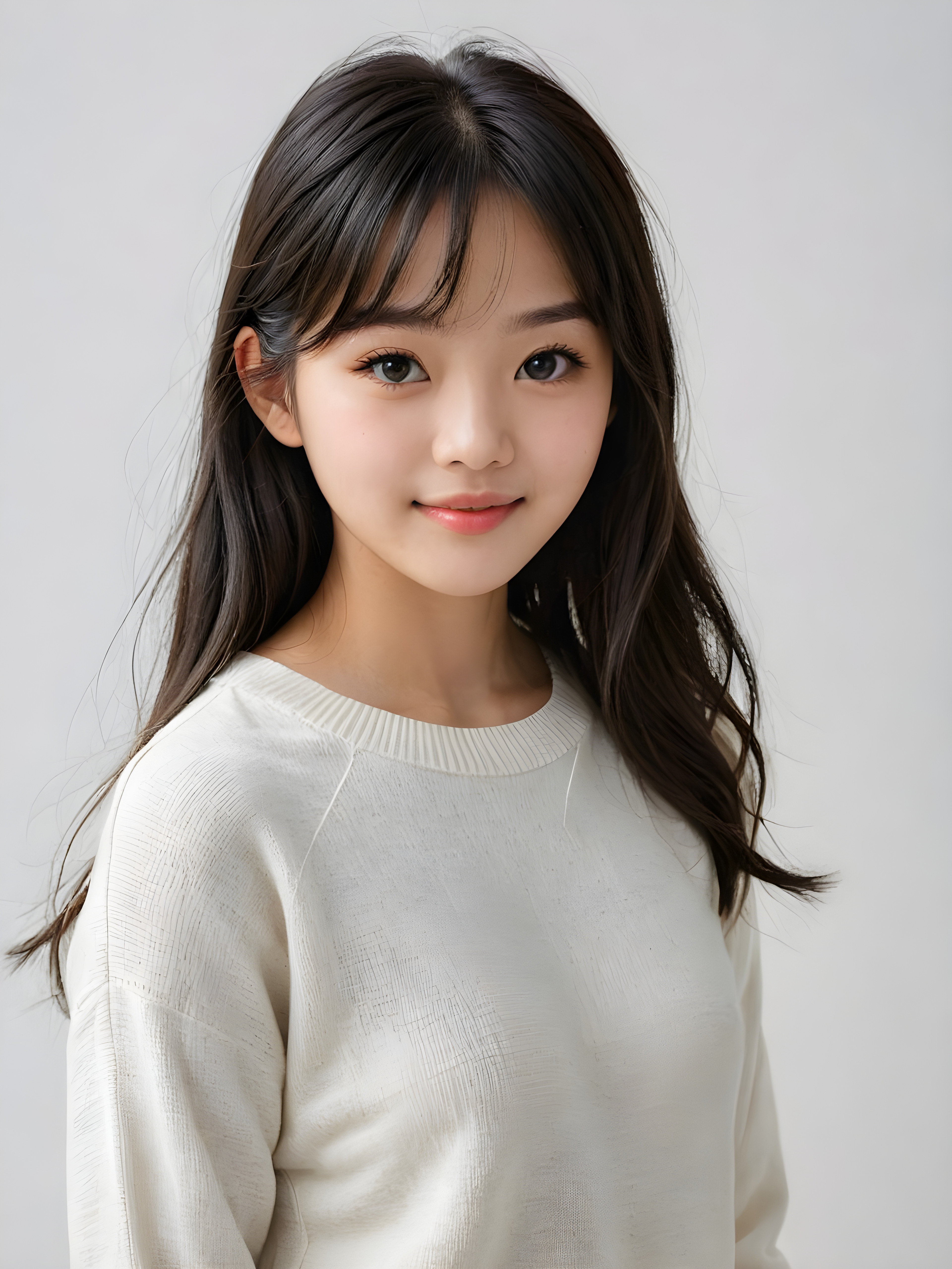 a (((breathtakingly realistic portrait))) capturing the essence of a cute youthful Korean teen girl, 15 years old, warm smile, with a flawlessly proportioned upper body, perfect curved fit body, straight, long, soft obsidian black hair in bangs cut, flawless, beautiful smooth skin, round angelic face with full kissable lips, wearing a thin and super sleek wool sweater, light blue eyes, poised confidently against a (((white canvas background)))