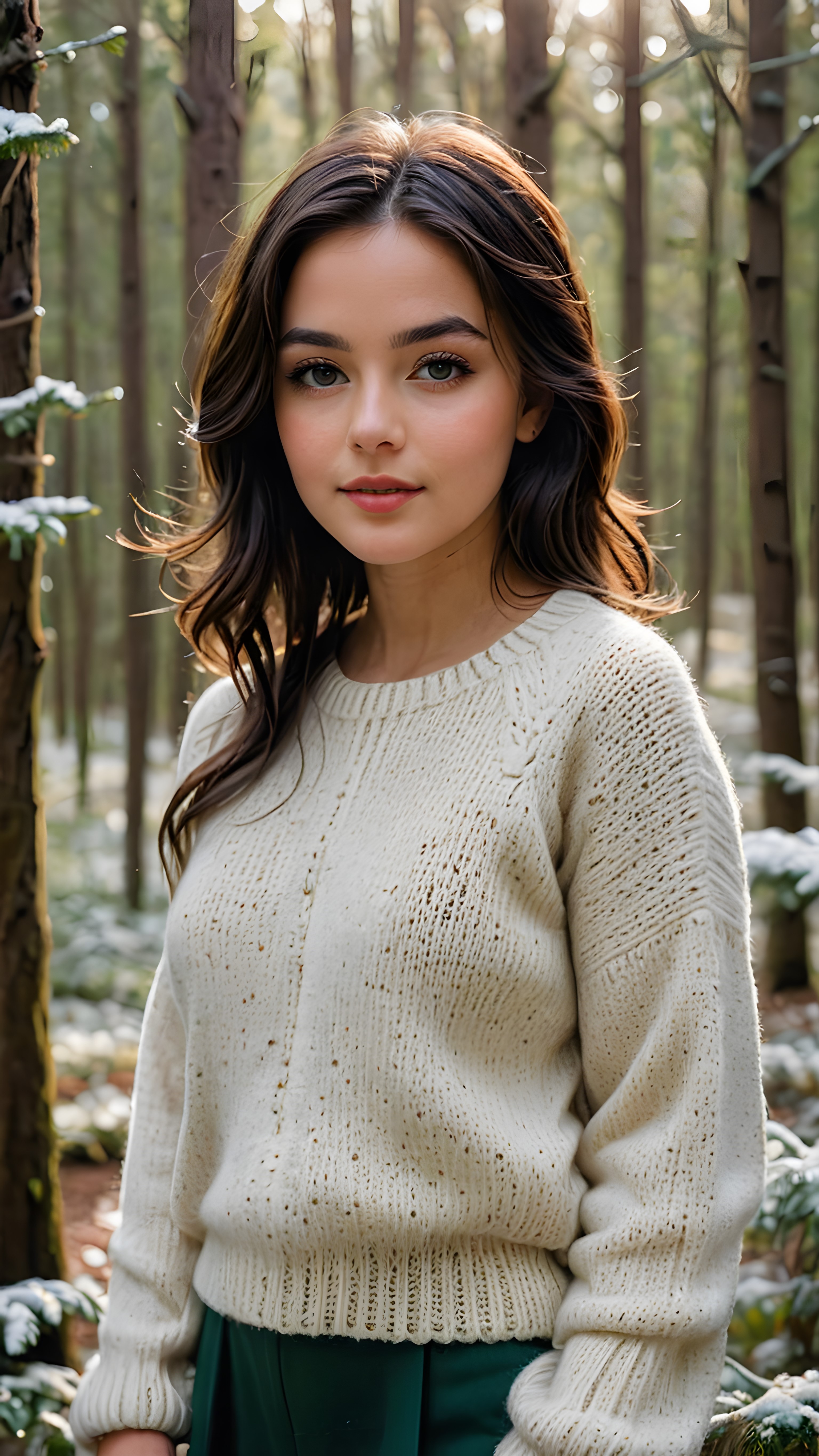 a (((breathtakingly realistic beautiful teenage girl))) dressed in thin wool sweater with flowing, brown sleek straight hair, standing in a (((winter forest))), her features and complexion mirroring the serene wonder of a softly falling winter scene, perfect formed fit body, perfect shadown and lights