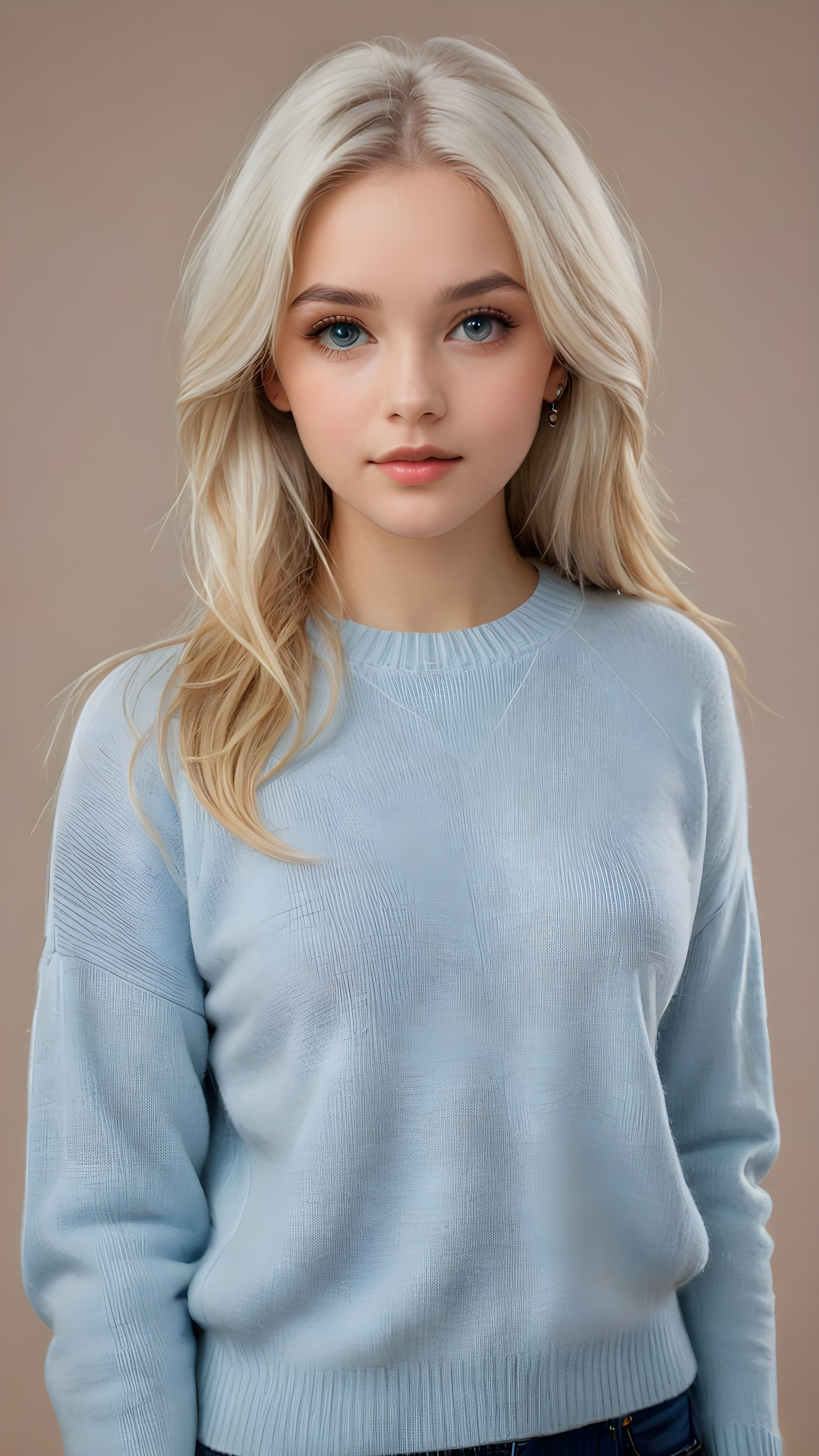 a breathtakingly realistic (((portrait))), capturing the essence of a youthful teen girl with a flawlessly proportioned upper body, perfect curved fit body, long, straight, soft and sleek white hair, round angelic face with full kissable lips, wears a thin and super sleek crop wool sweater, light blue eyes, posed confidently before the viewer, ((a white canvas as a background))