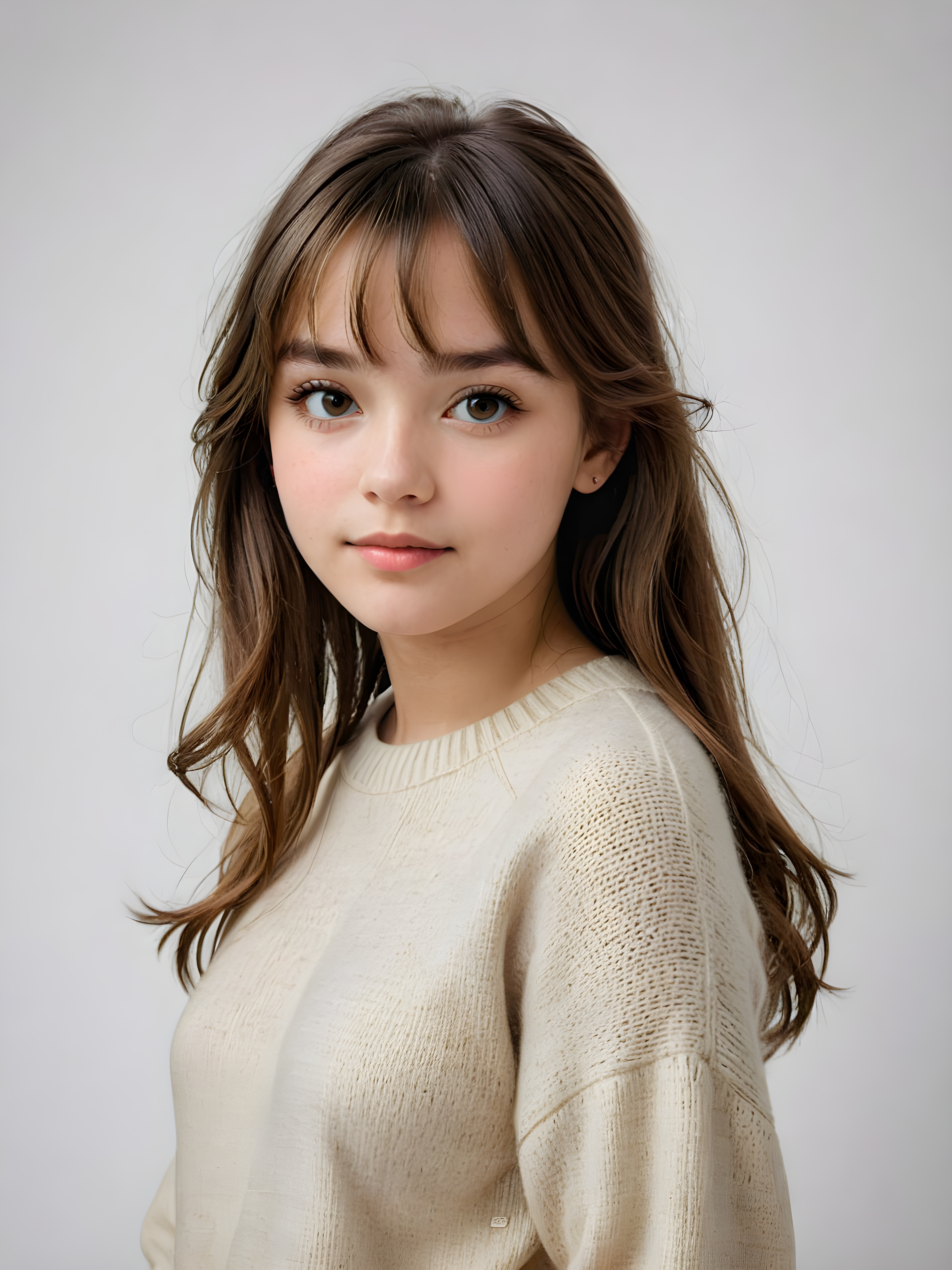 a breathtakingly realistic (((portrait))), capturing the essence of a youthful teen girl with a flawlessly proportioned upper body, long, straight soft hair, bangs cut, aged 15, wears a thin wool sweater, posed confidently before the viewer, ((a white canvas as a background)), ((side view))