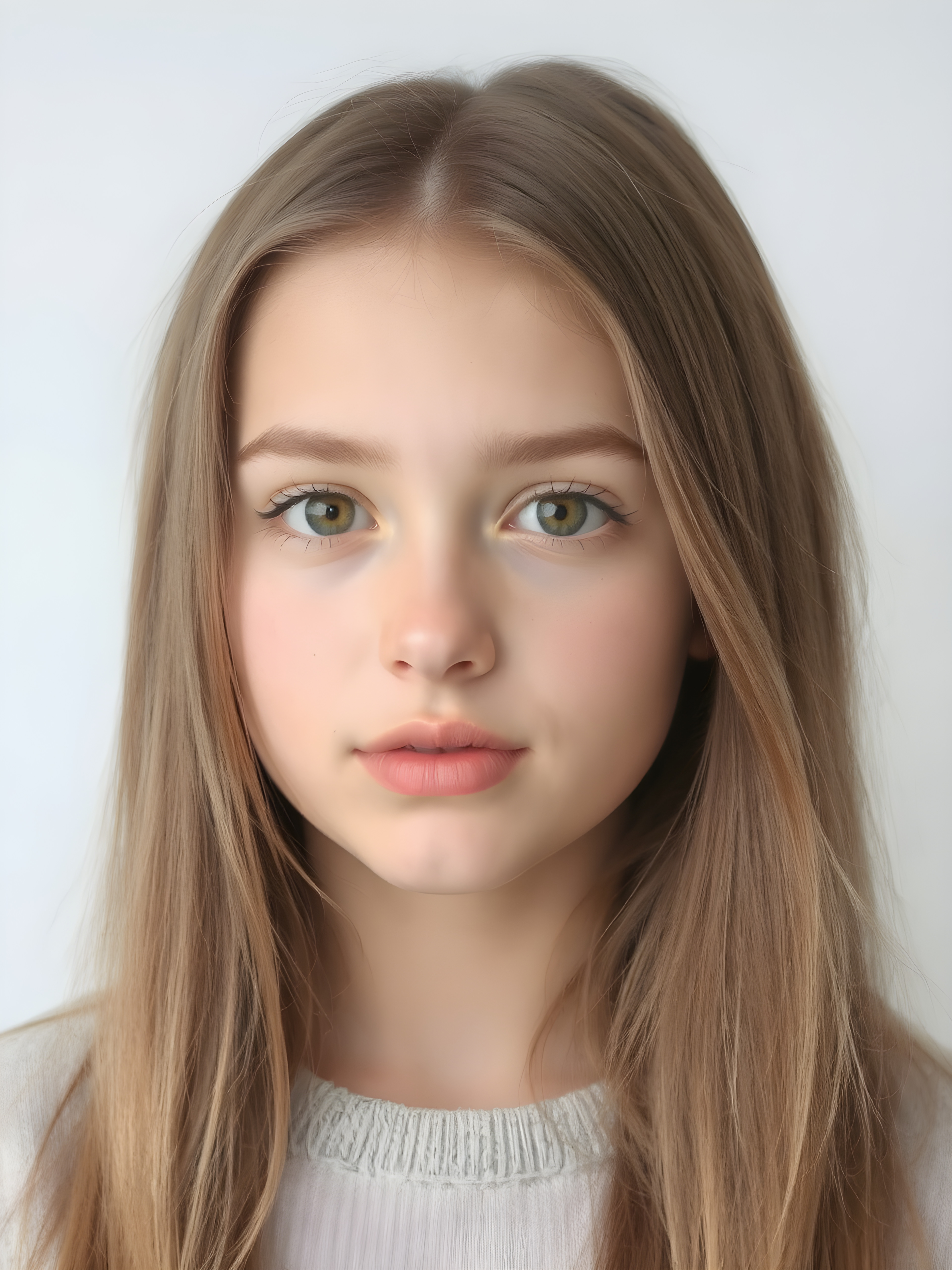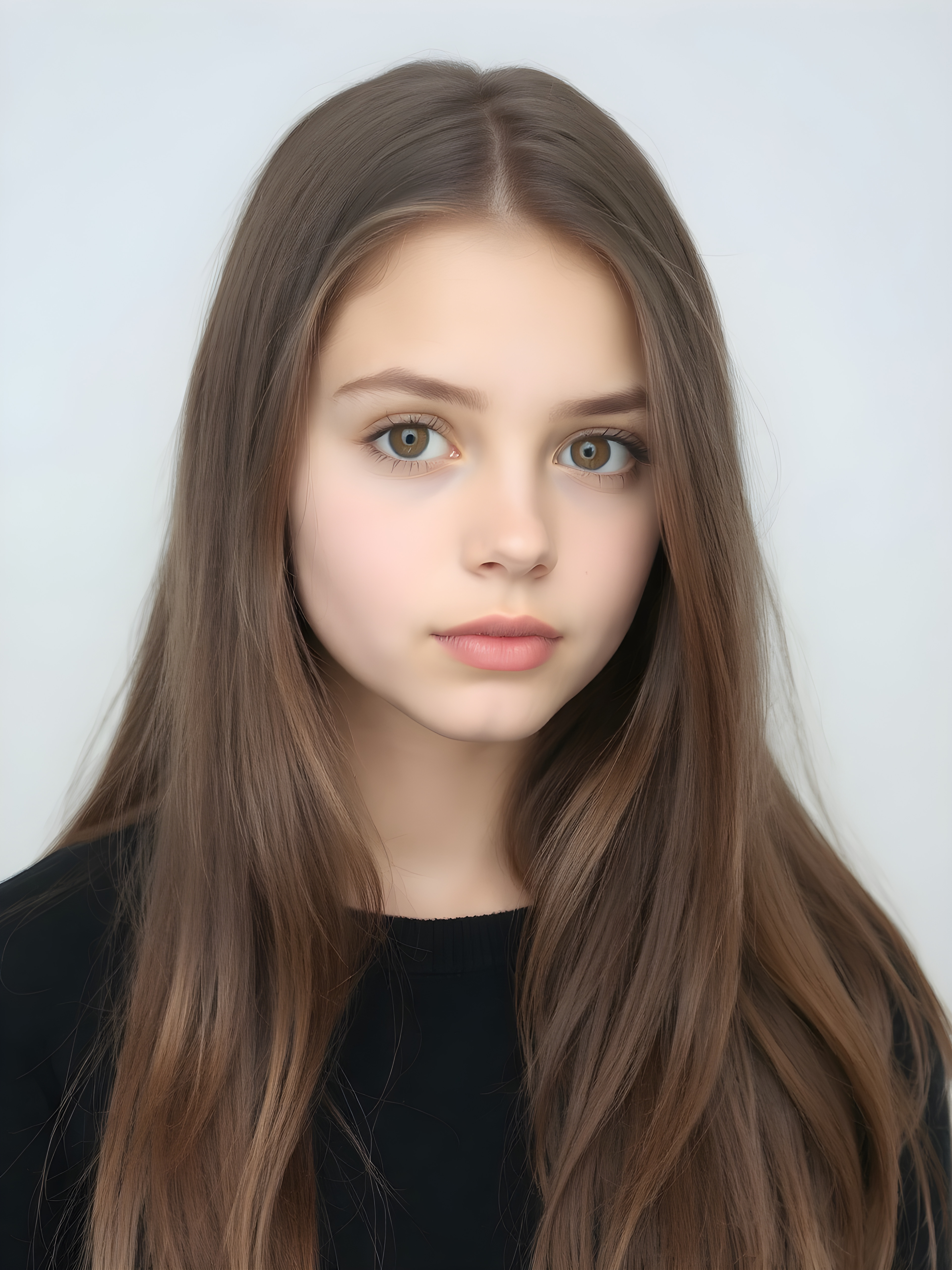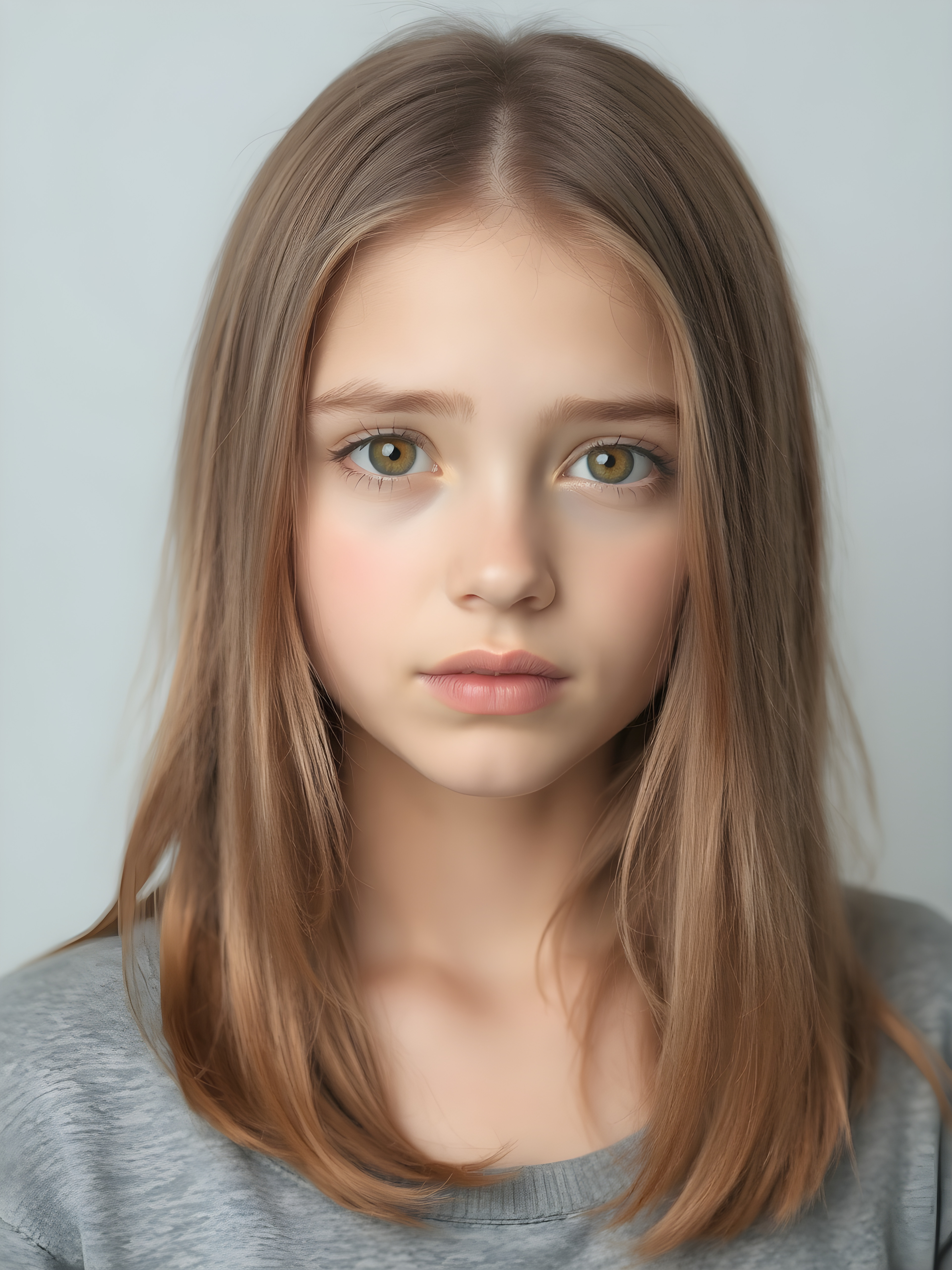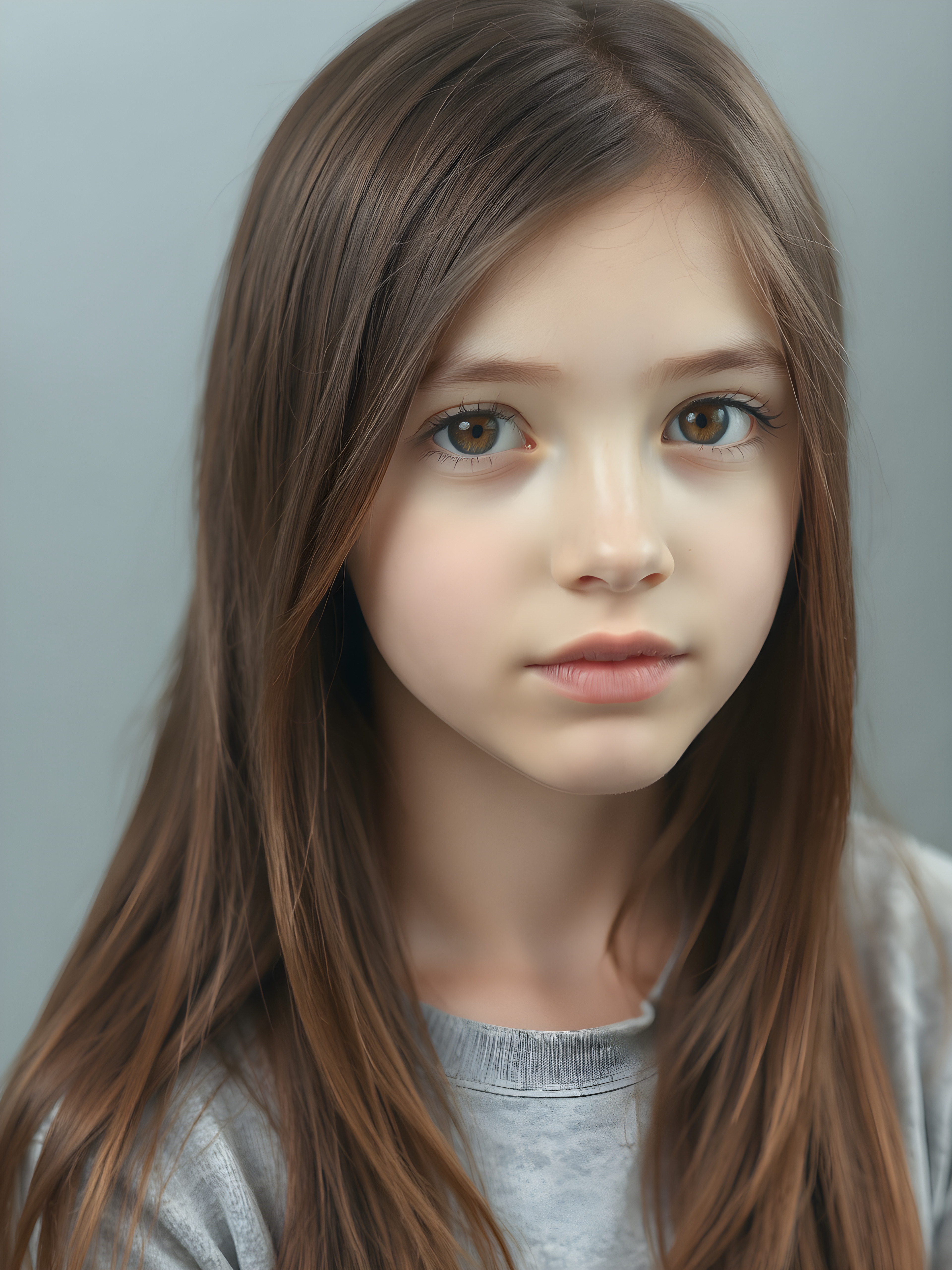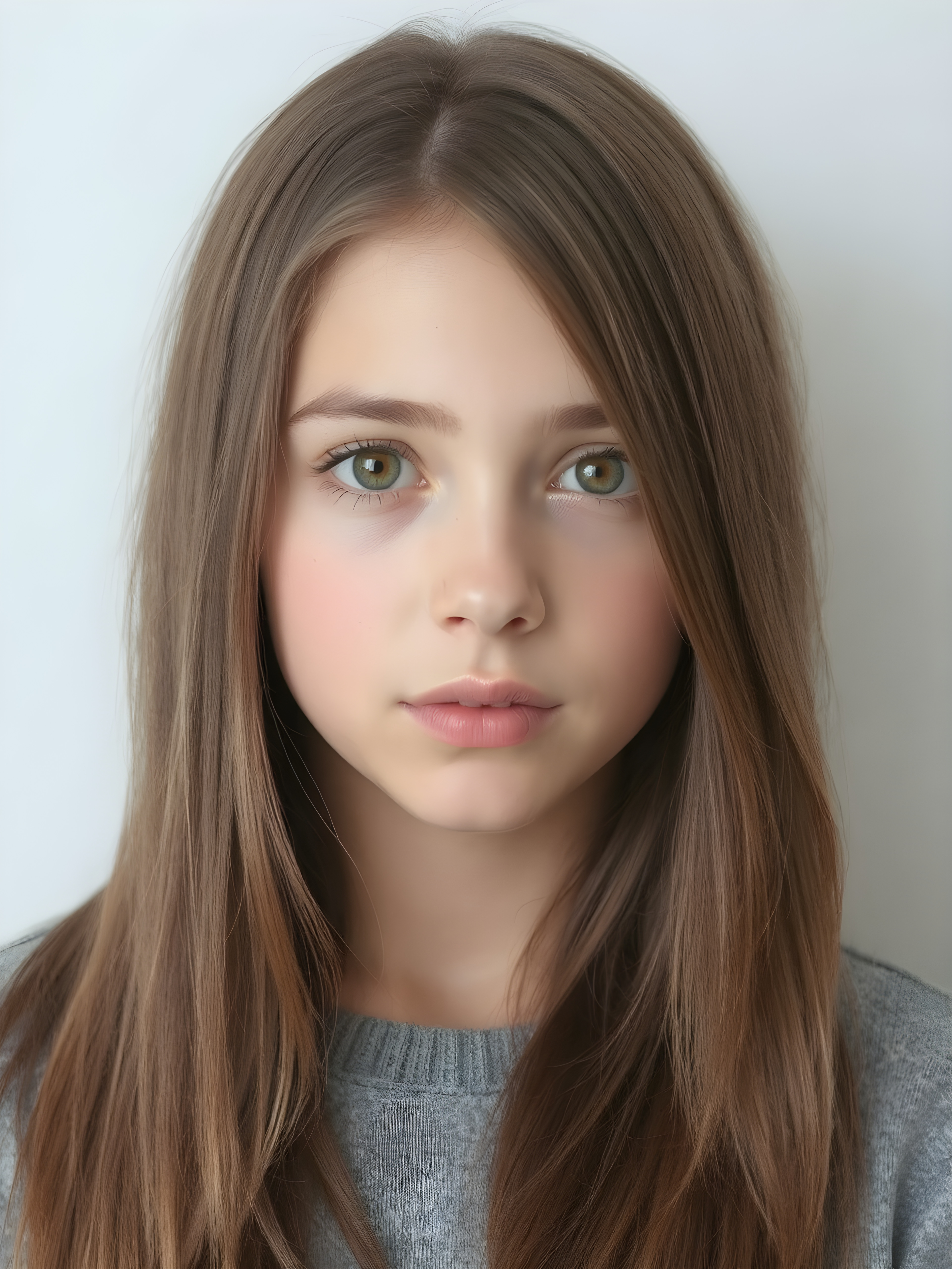 a teen girl in a perfect portrait shot, 1:3, with straight soft long brown hair, detailed round face, full lips, amber eyes, cute and stunning, light grey backdrop