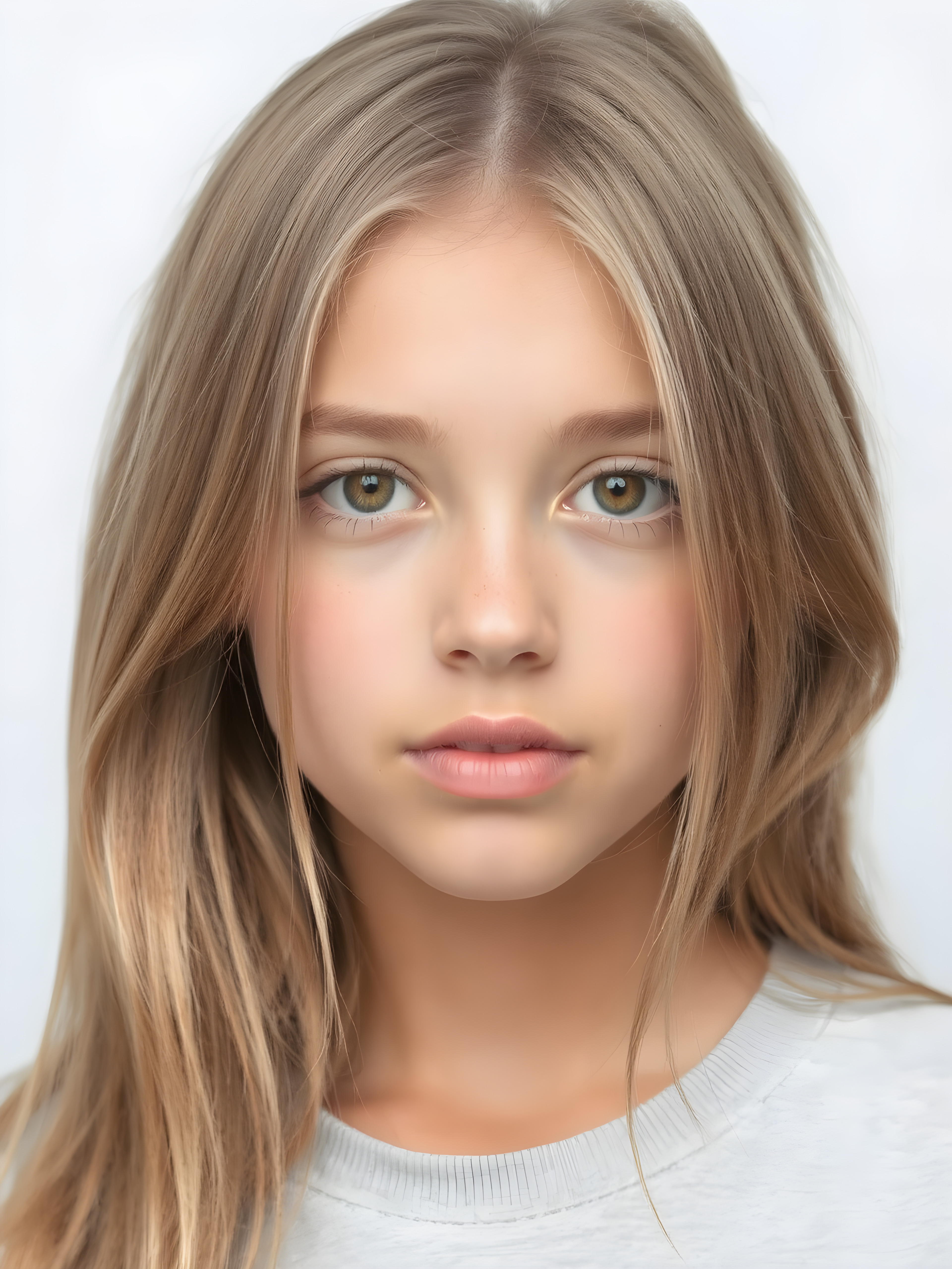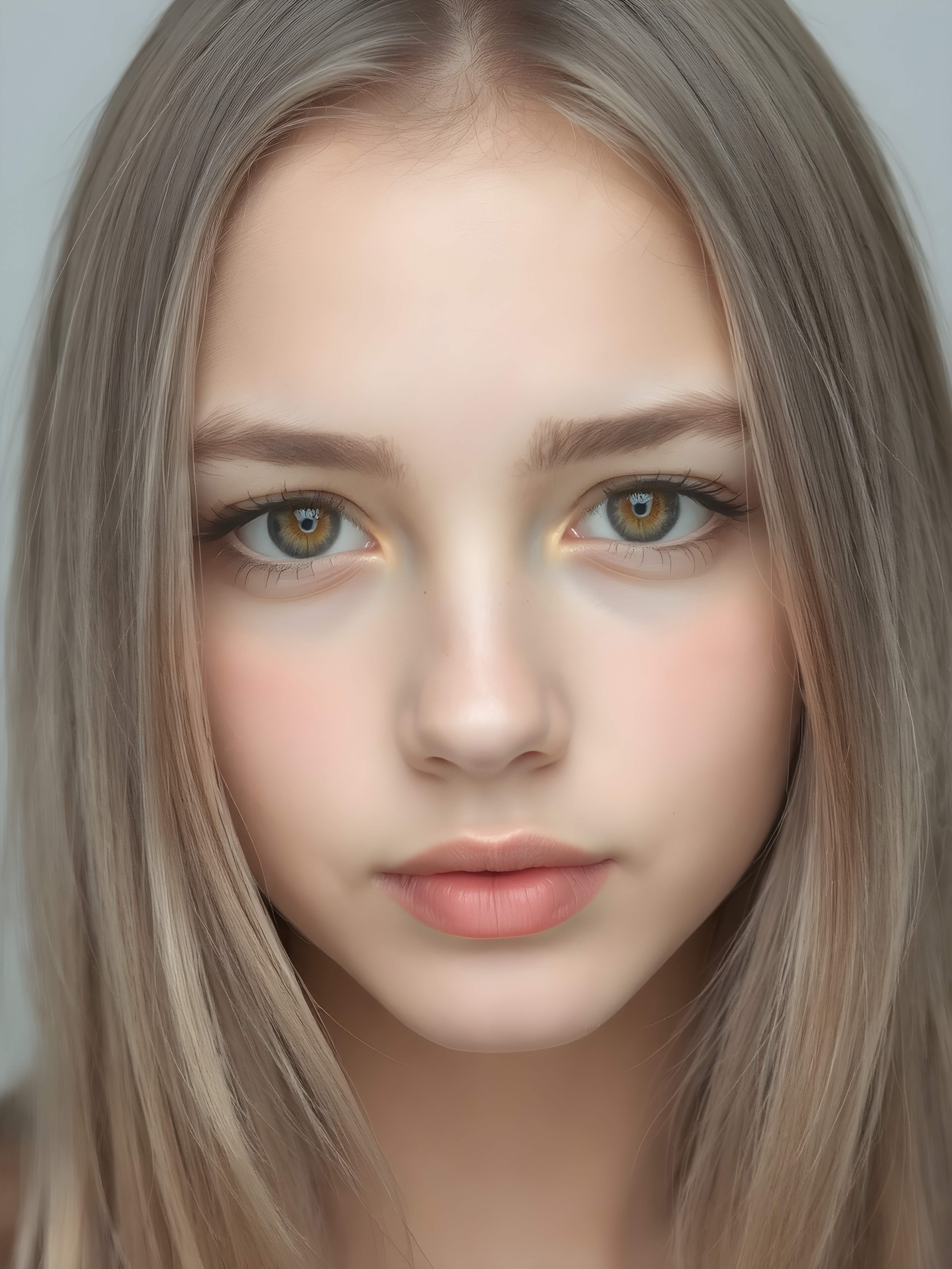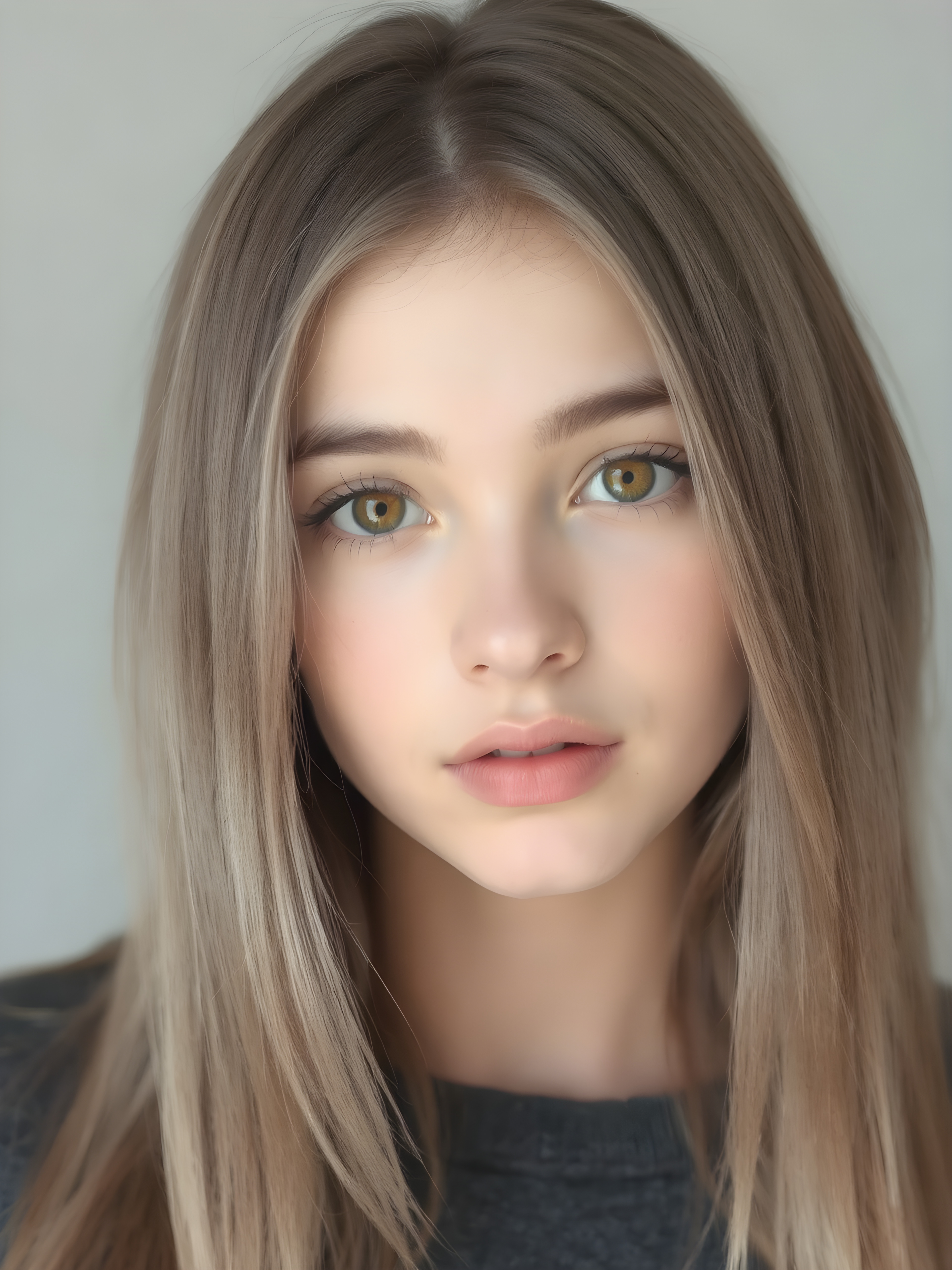 a teen girl in a perfect portrait shot, 1:3, with straight soft long hair, detailed round face, full lips, amber eyes, cute and stunning, light grey backdrop