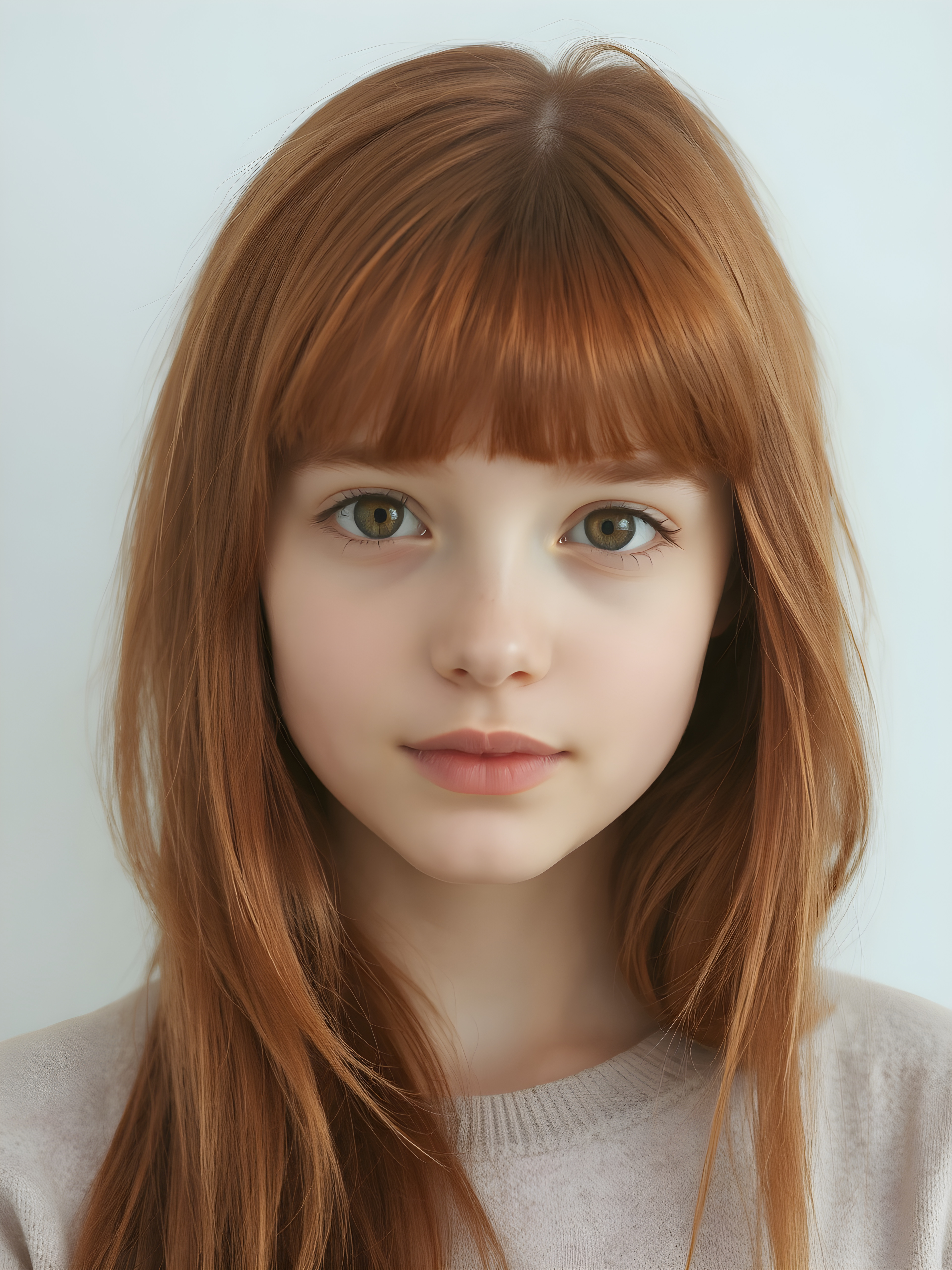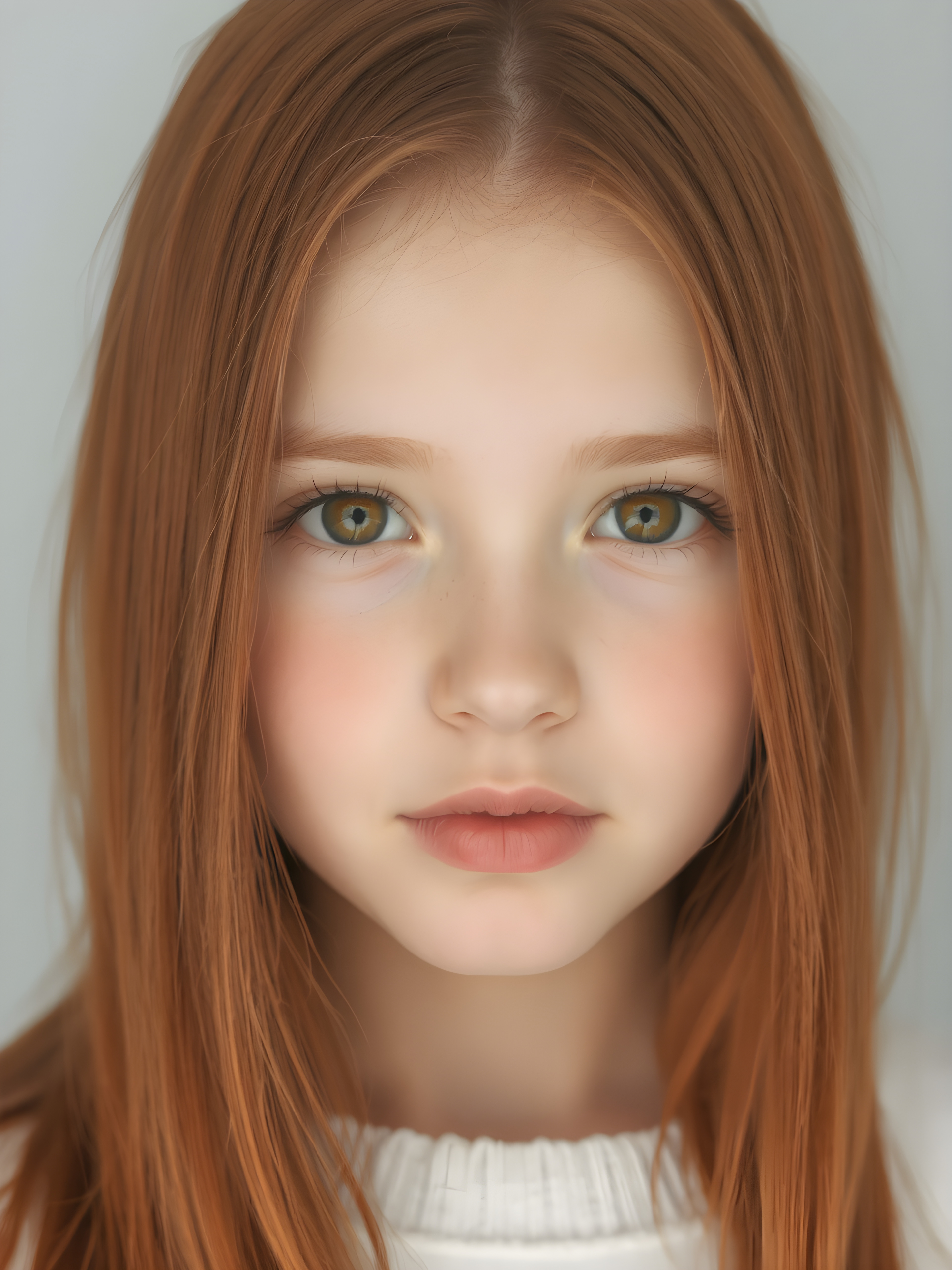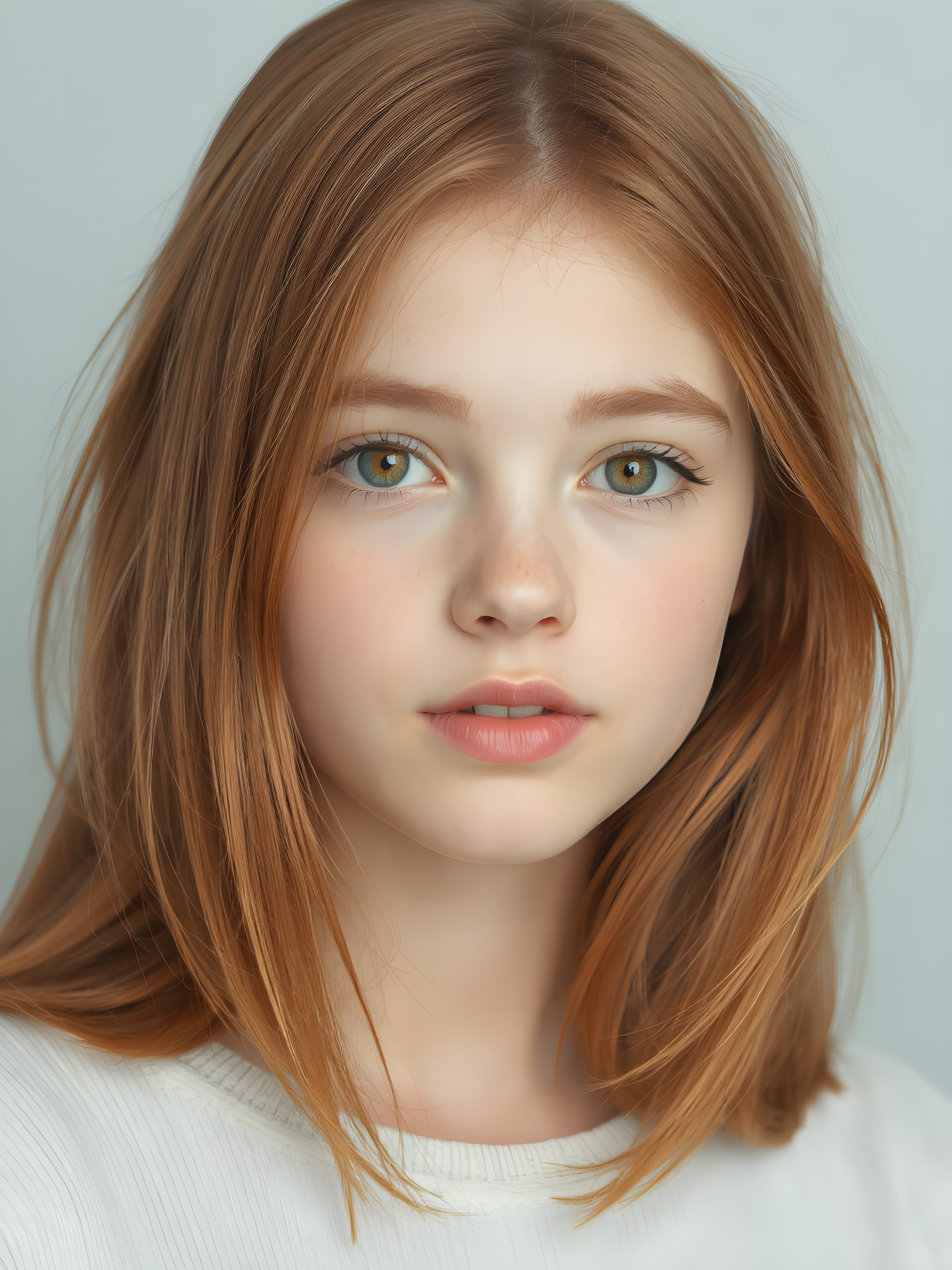 a teen girl in a perfect portrait shot, 1:3, with straight soft long red hair, detailed round face, full lips, amber eyes, cute and stunning, light grey backdrop