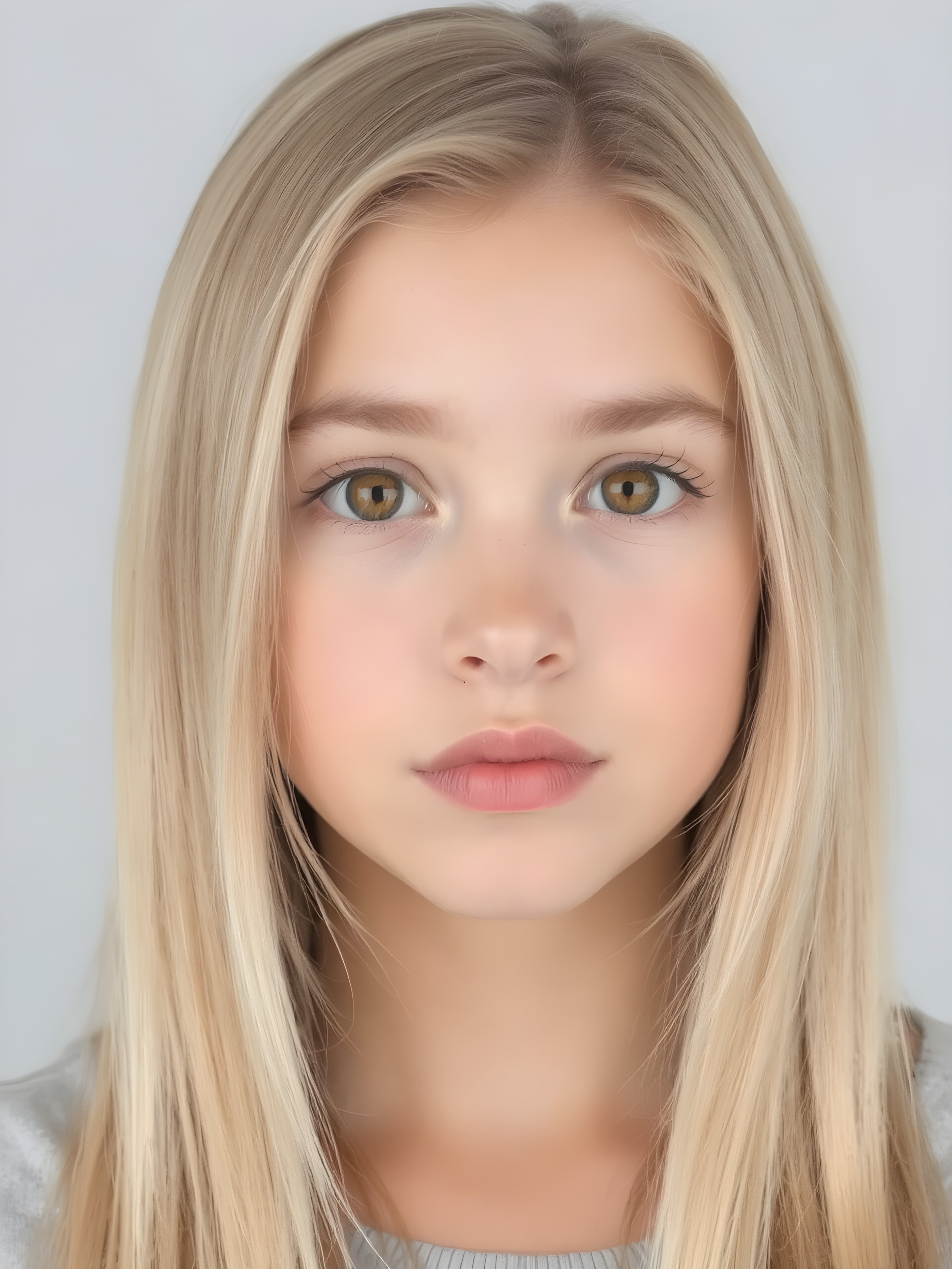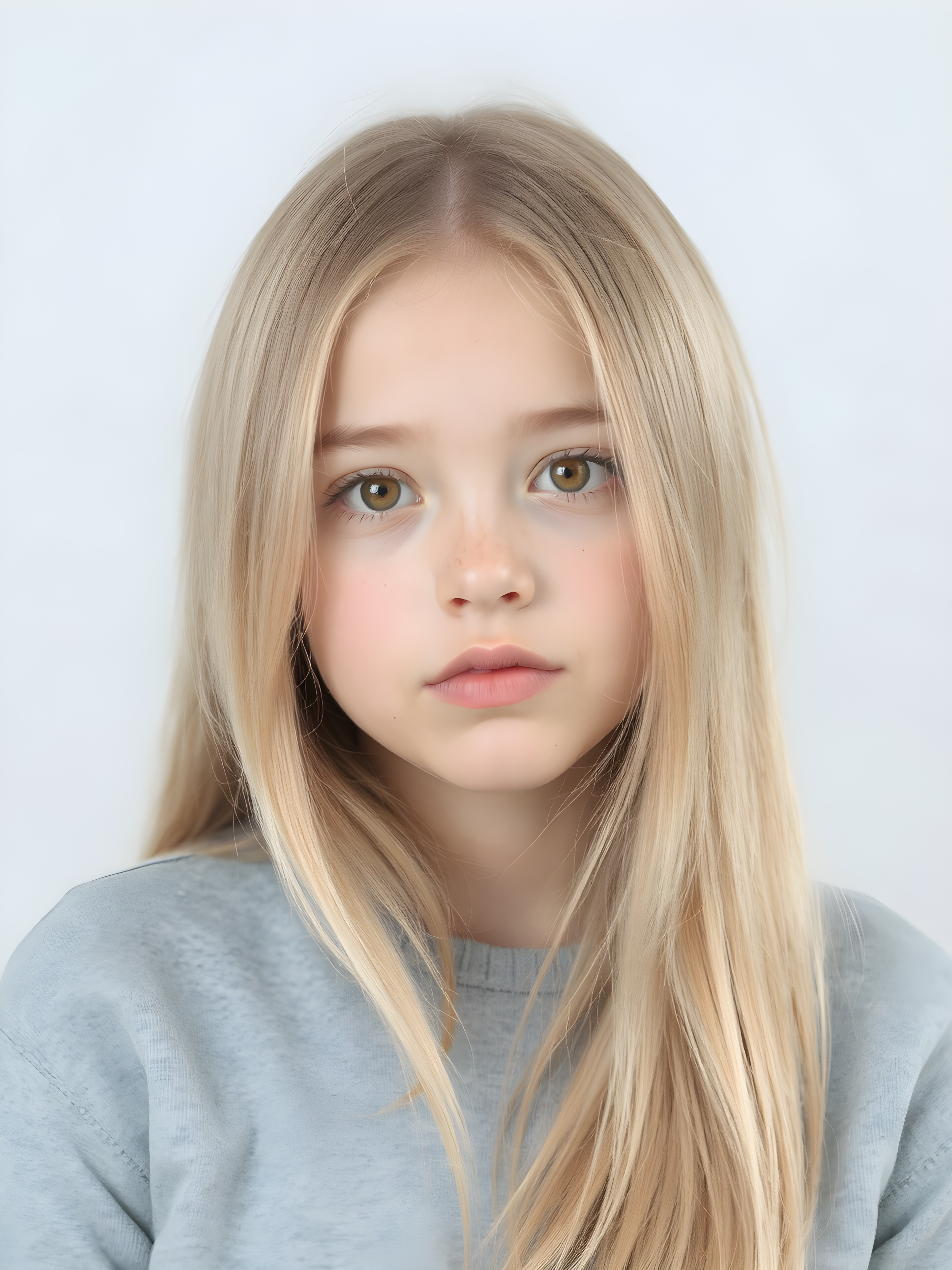 a teen girl in a perfect portrait shot, 1:3, with straight soft long blond hair, detailed round face, full lips, amber eyes, cute and stunning, light grey backdrop
