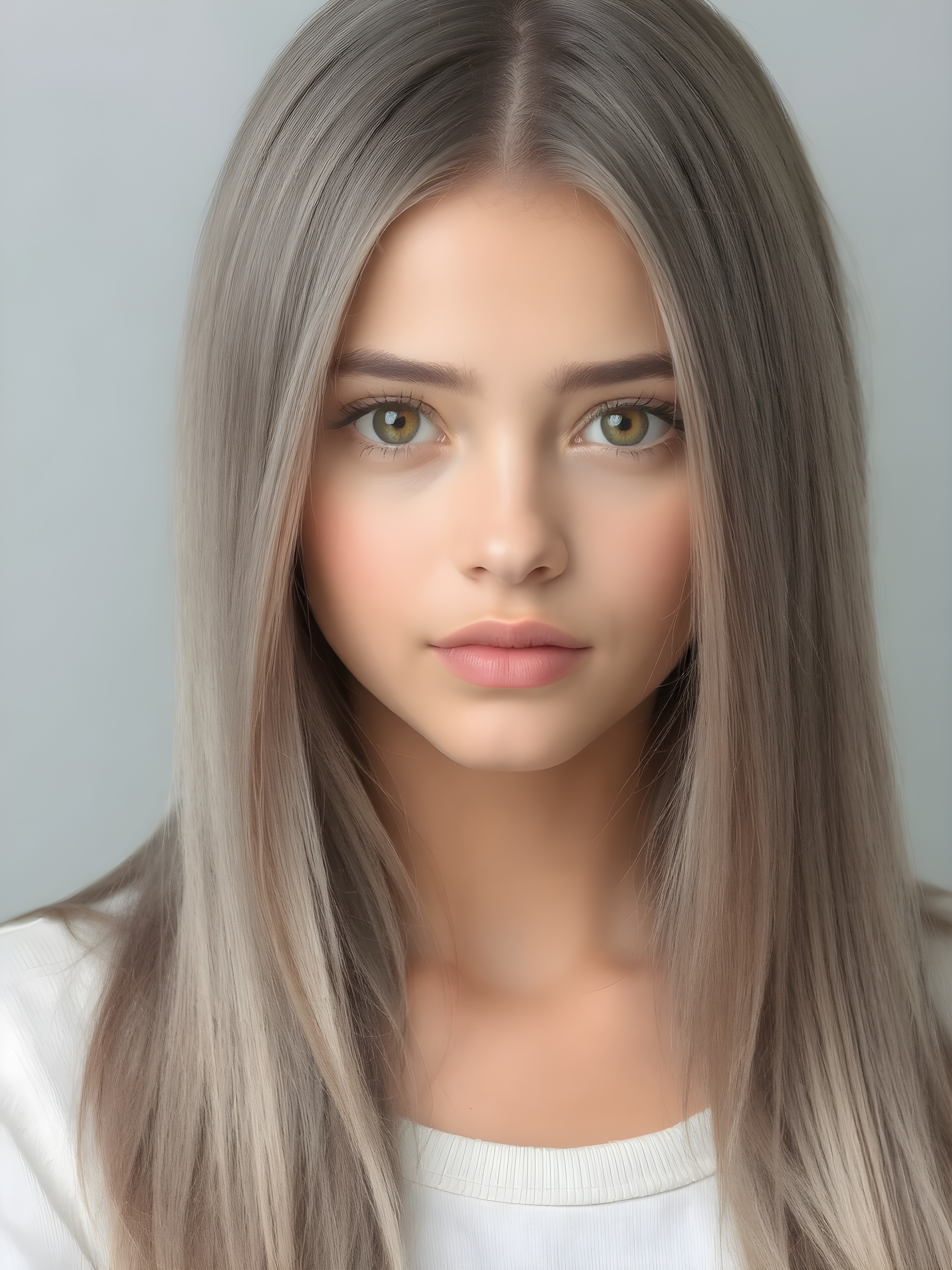 a teen girl in a perfect portrait shot, 1:3, with straight soft long ash grey hair, detailed round face, full lips, amber eyes, cute and stunning, light grey backdrop