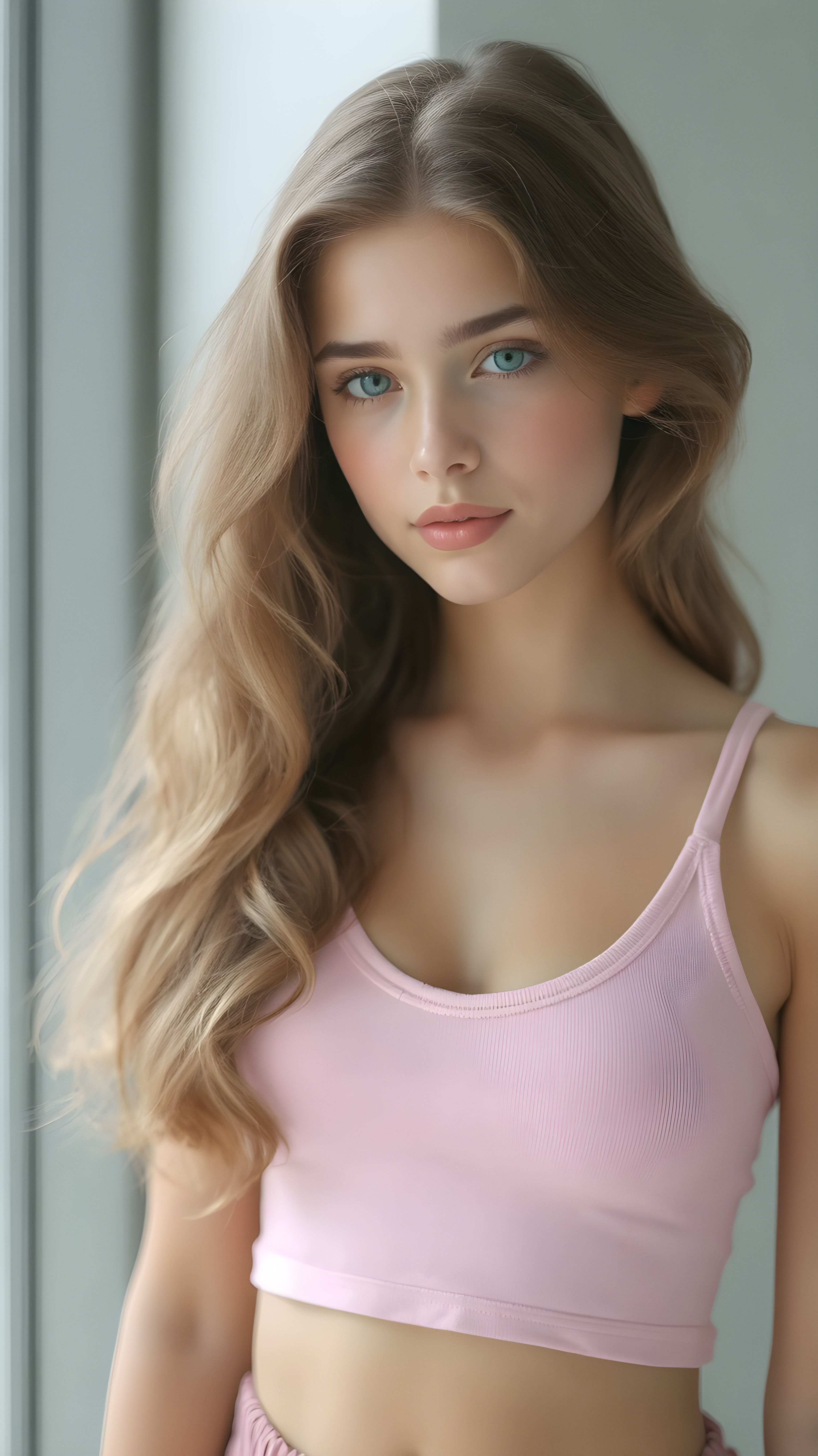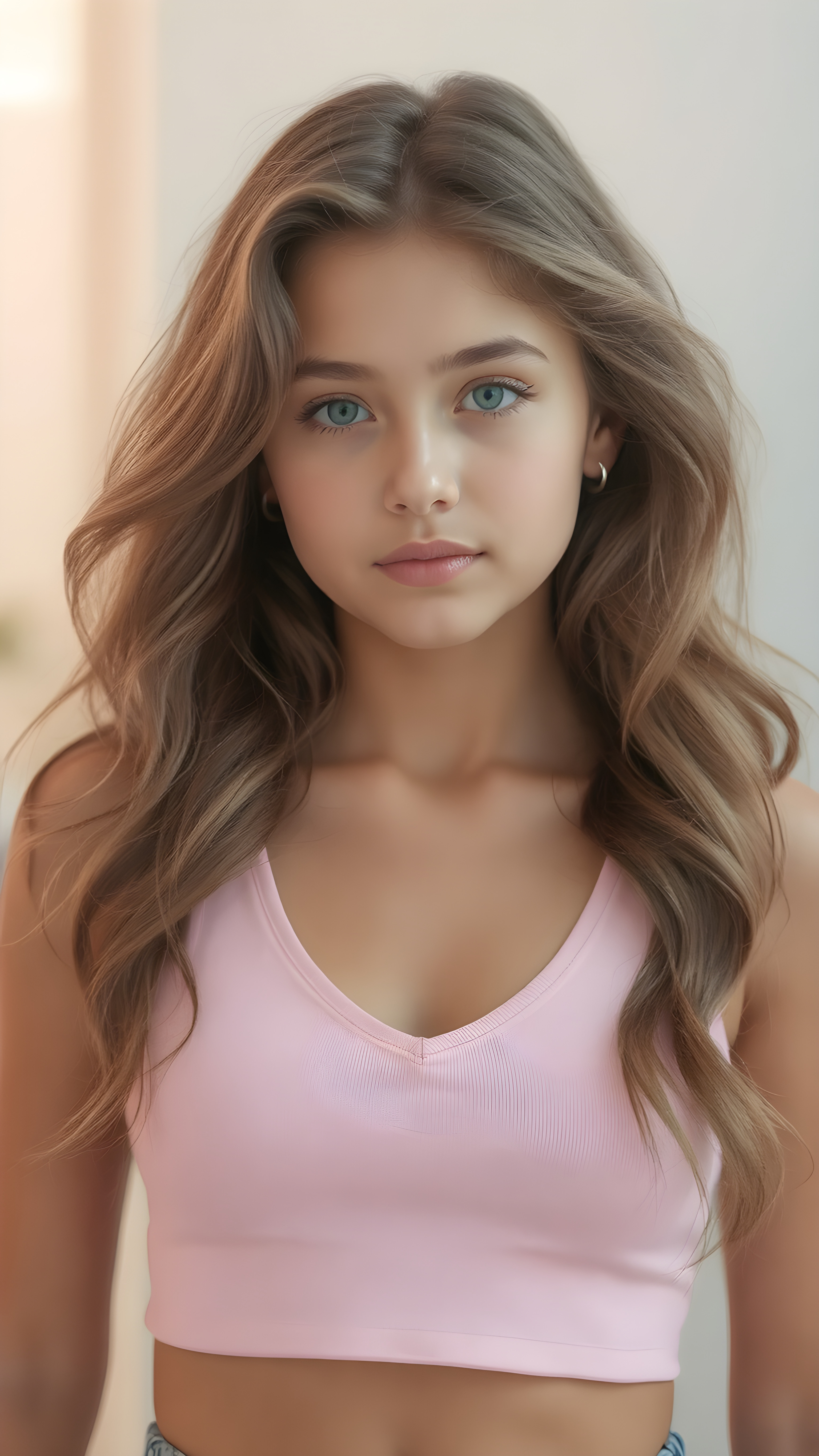 a (((teen girl))), ((long wavy hair)), that flows elegantly, framing her delicate, ((barely there face)), which exudes a youthful vibrancy, short cropped pink tank top that accentuates her natural beauty and her perfect body, deep v-neck and wide open front, contrasting against the sleek and modern backdrop of a (hyper realistic, 8K rendering) for a stunning, high-quality image