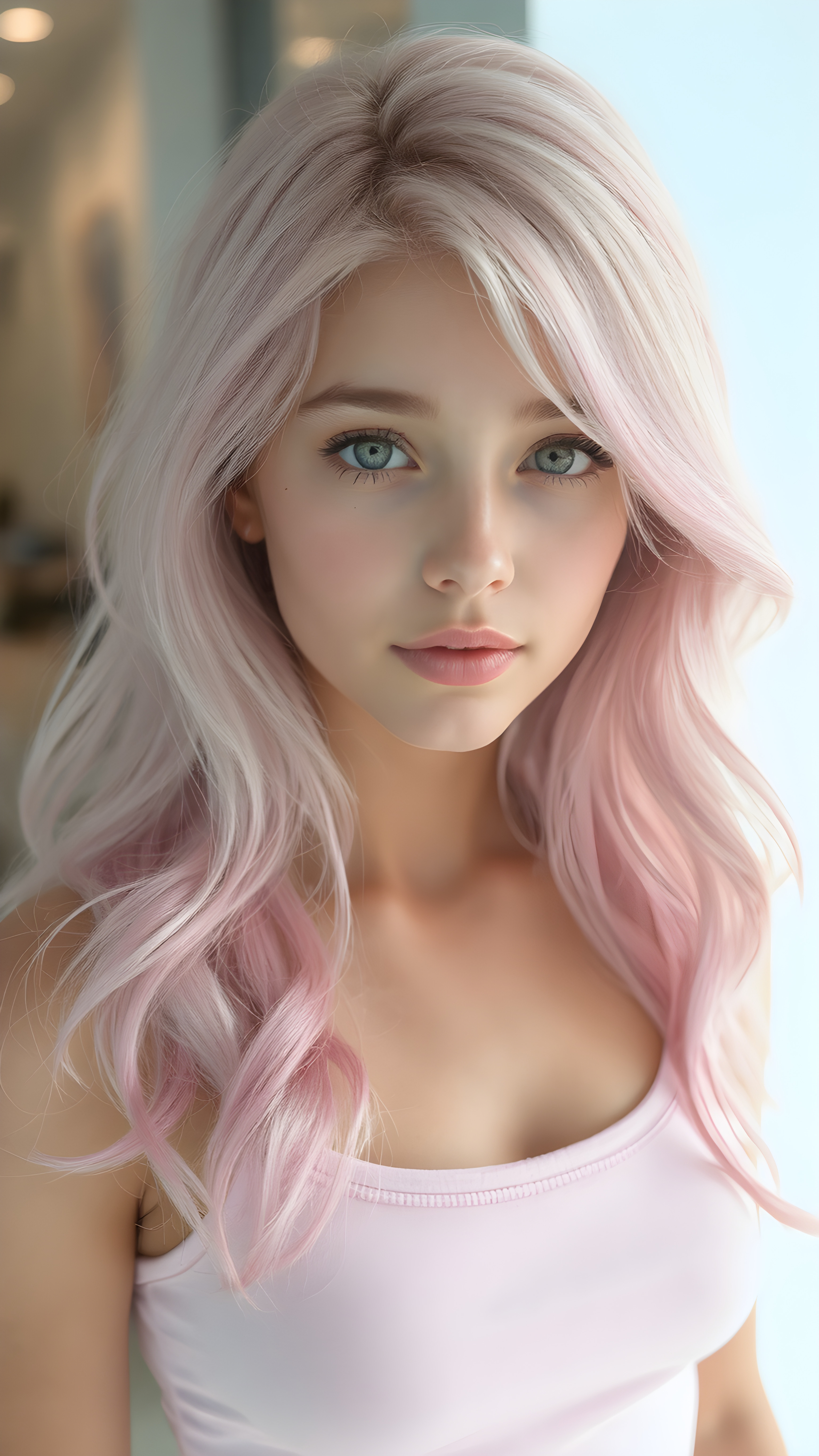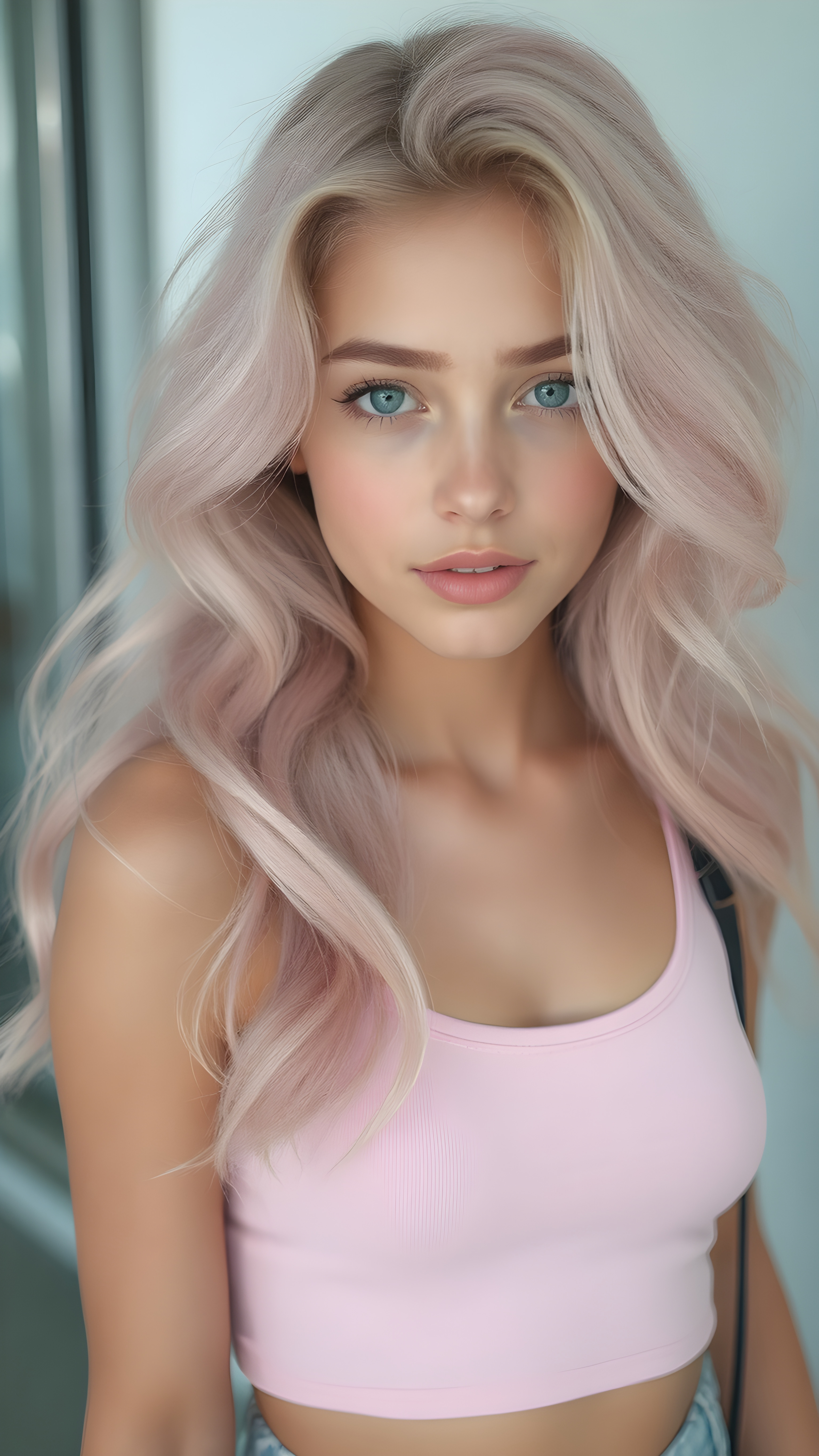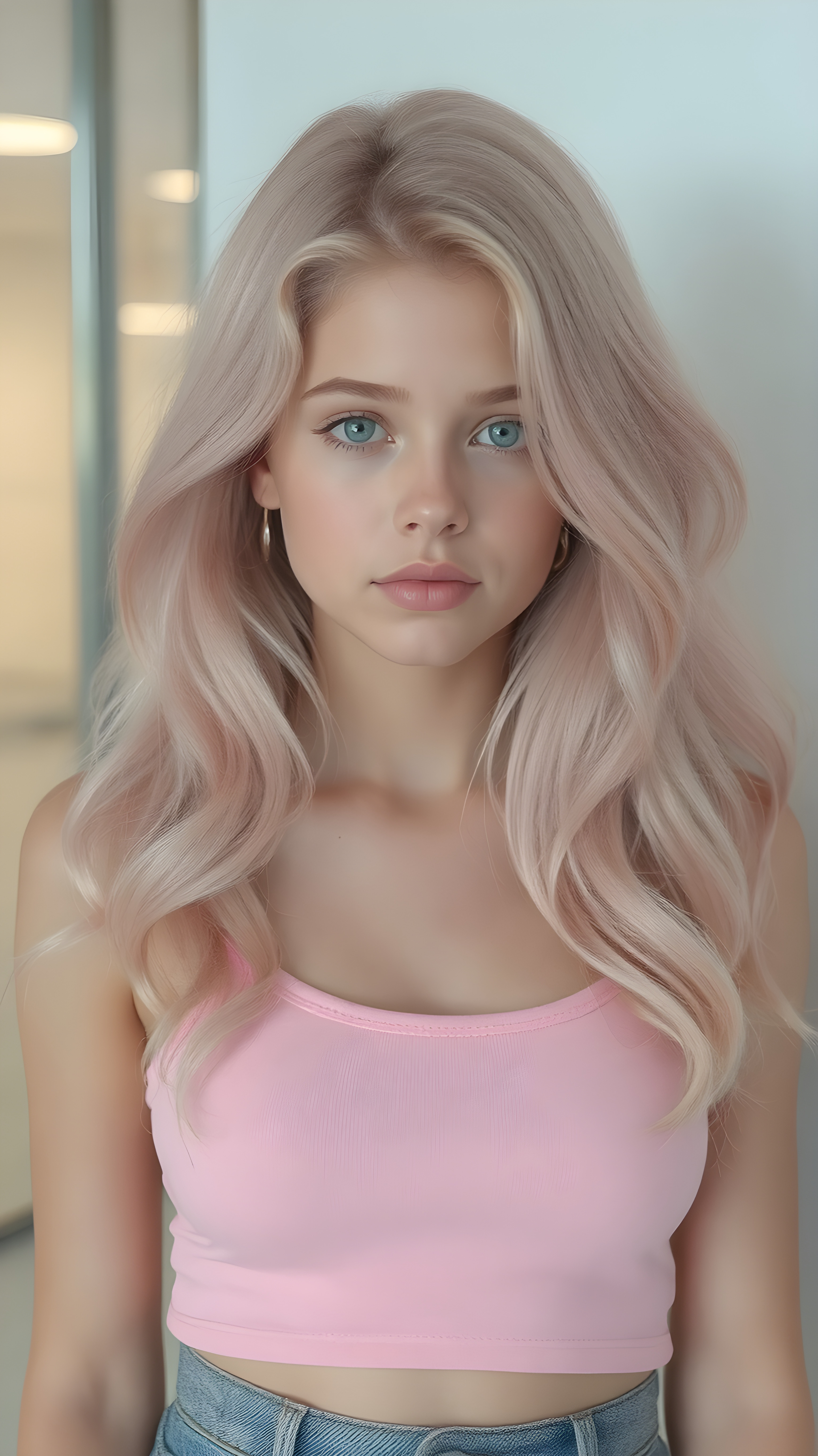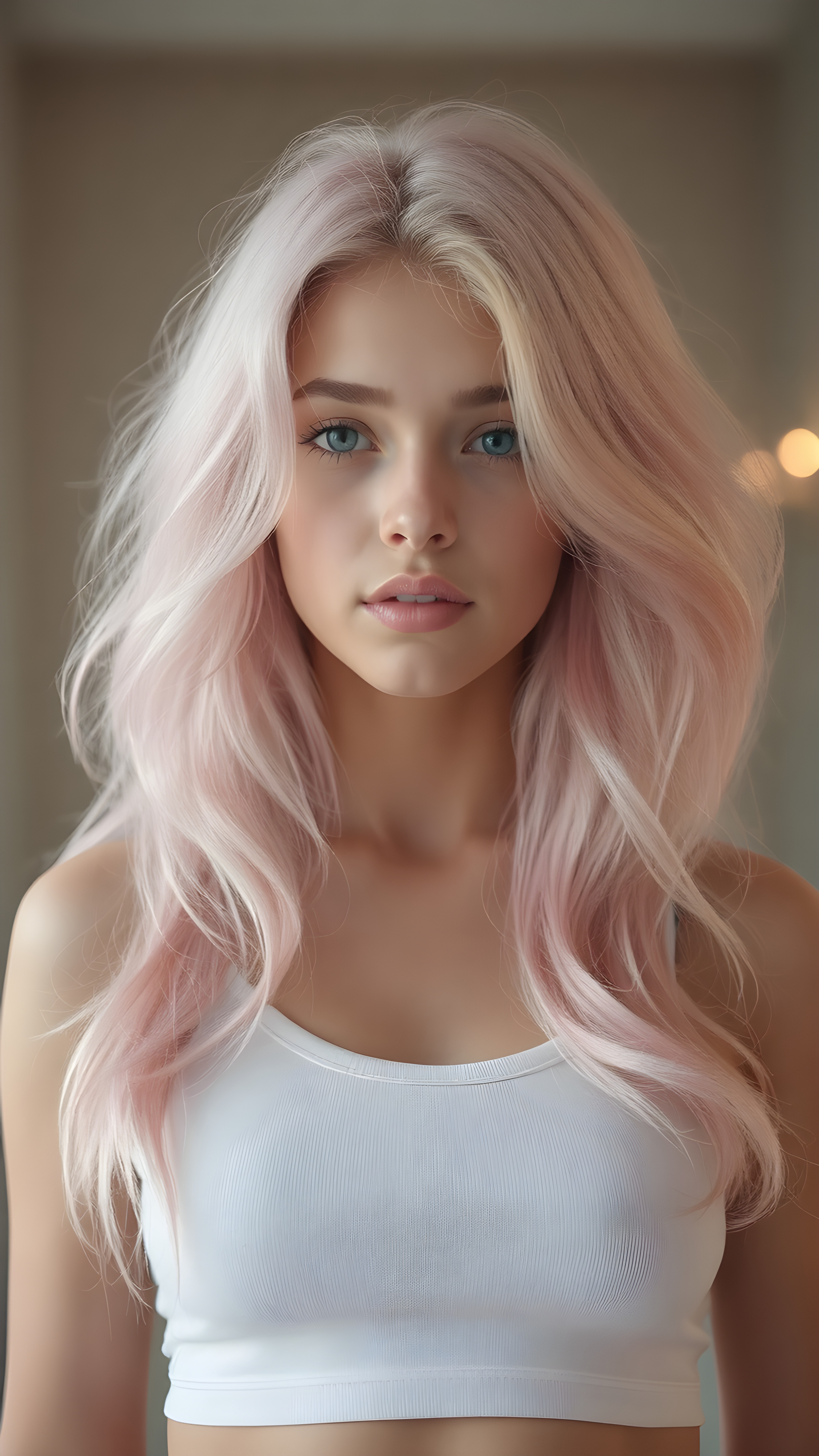 a (((teen girl))), ((light pink long wavy hair)), that flows elegantly, framing her delicate, ((barely there face)), which exudes a youthful vibrancy, short cropped tank top that accentuates her natural beauty and her perfect body, contrasting against the sleek and modern backdrop of a (hyper realistic, 8K rendering) for a stunning, high-quality image