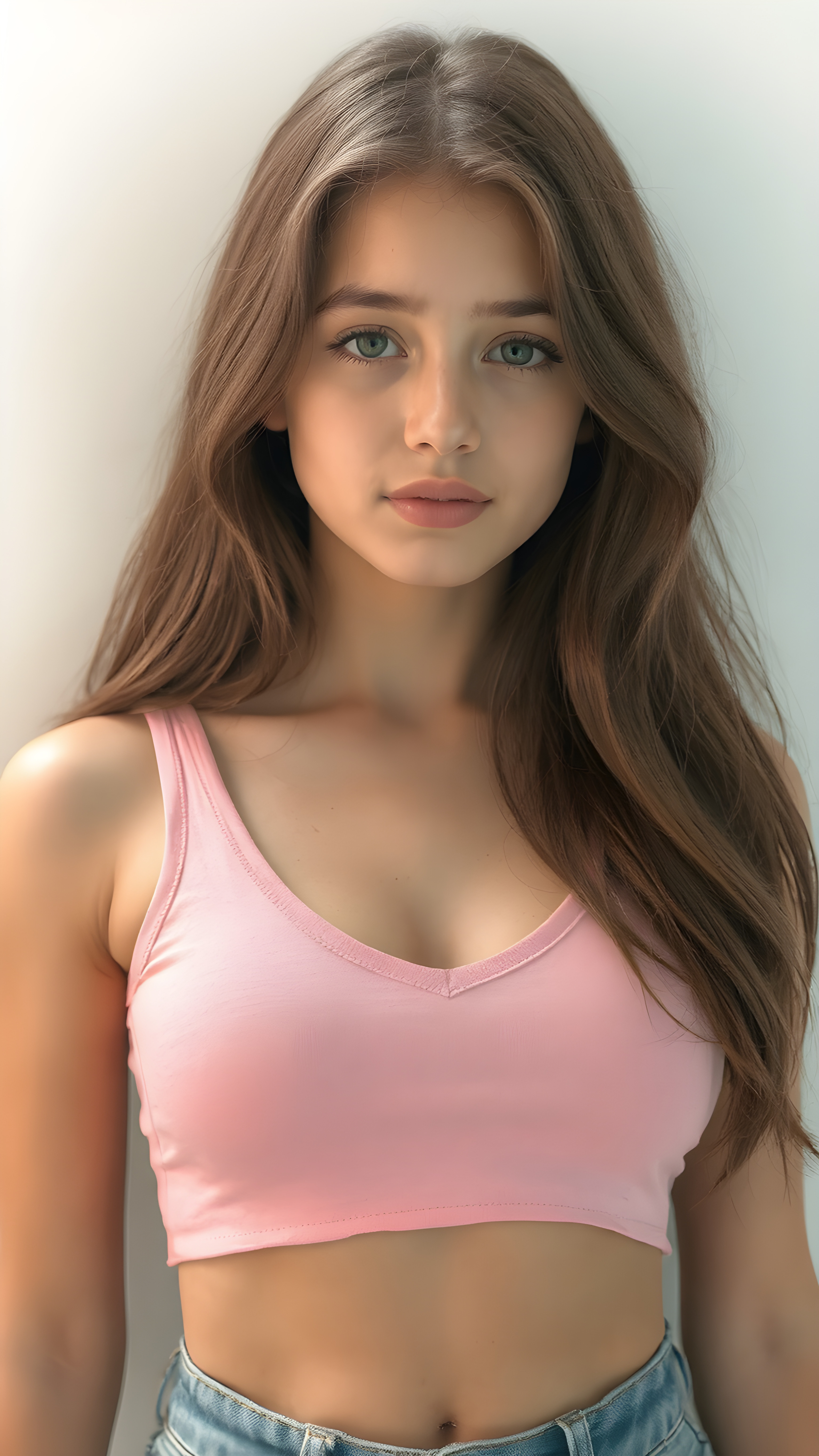 a (((teen girl))), ((long brown hair)), that flows elegantly, framing her delicate, ((round angelic face)), which exudes a youthful vibrancy, ((short cropped pink tank top that accentuates her natural beauty and her perfect body, deep v-neck and wide open front)), contrasting against the sleek and modern backdrop of a (hyper realistic, 8K rendering) for a stunning, high-quality image