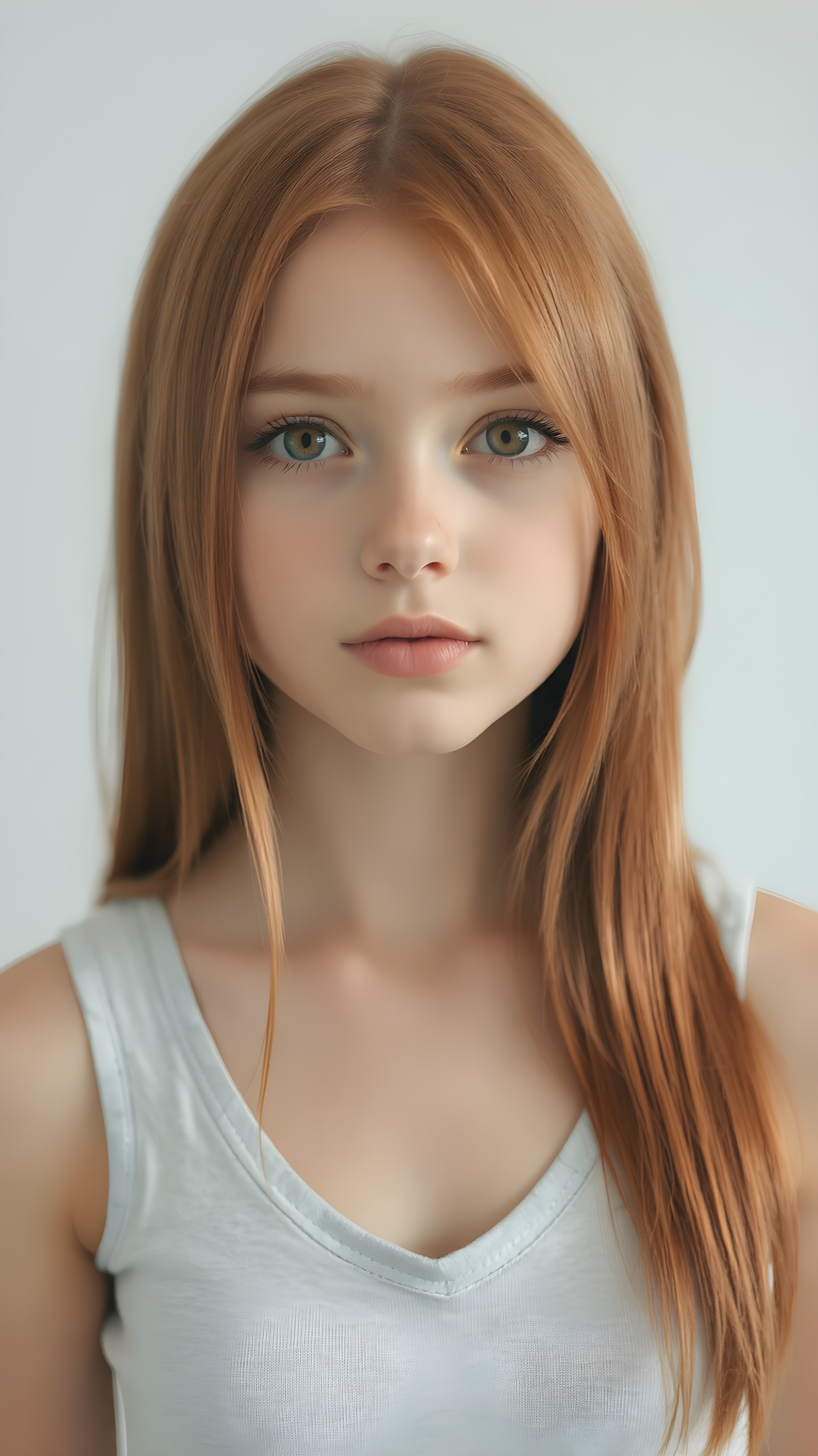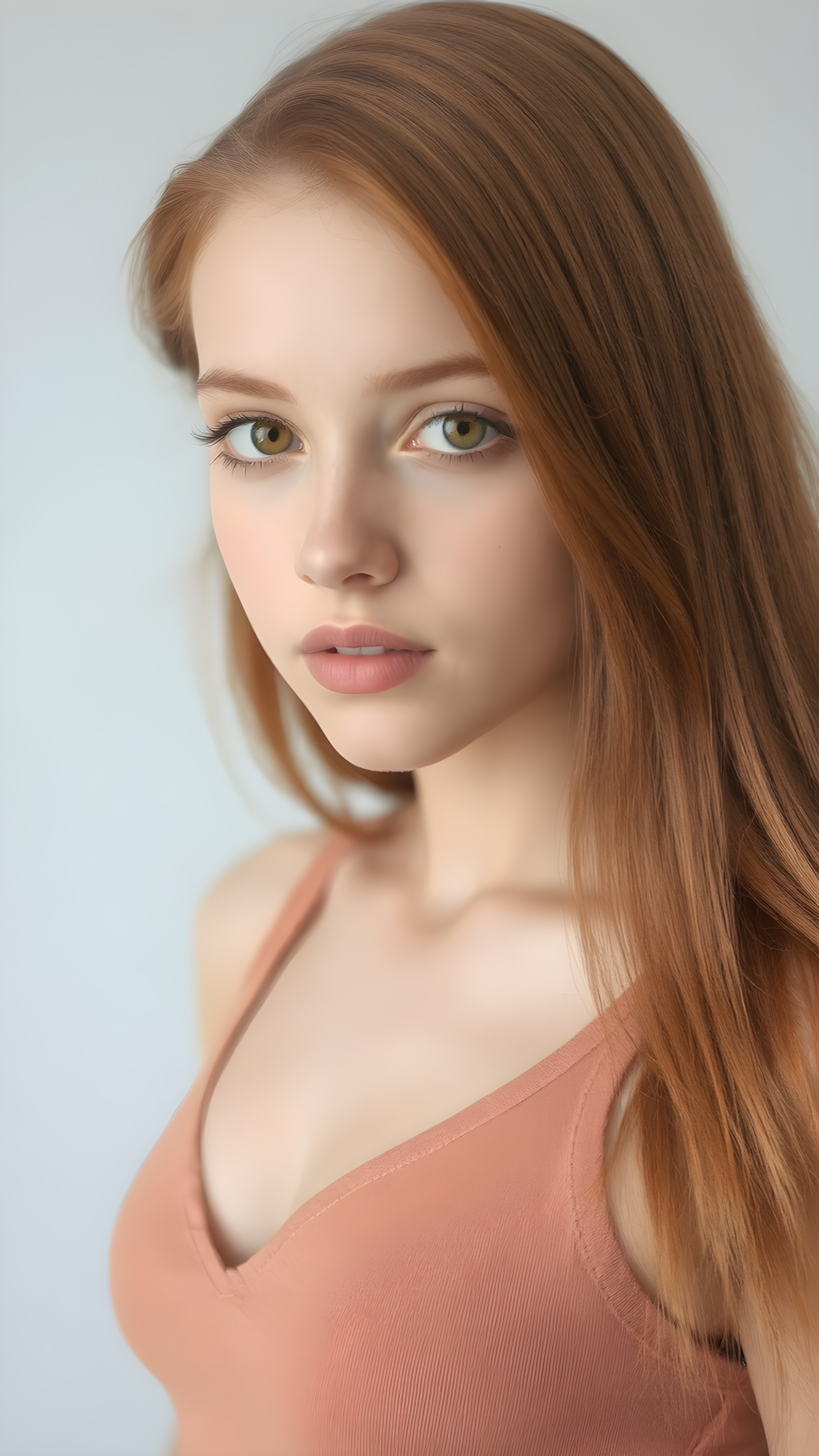 a teen girl in a perfect portrait shot, 1:3, with straight soft long red hair, detailed round face, full lips, amber eyes, she wears a cropped tank top with deep v-neck, cute and stunning, light grey backdrop