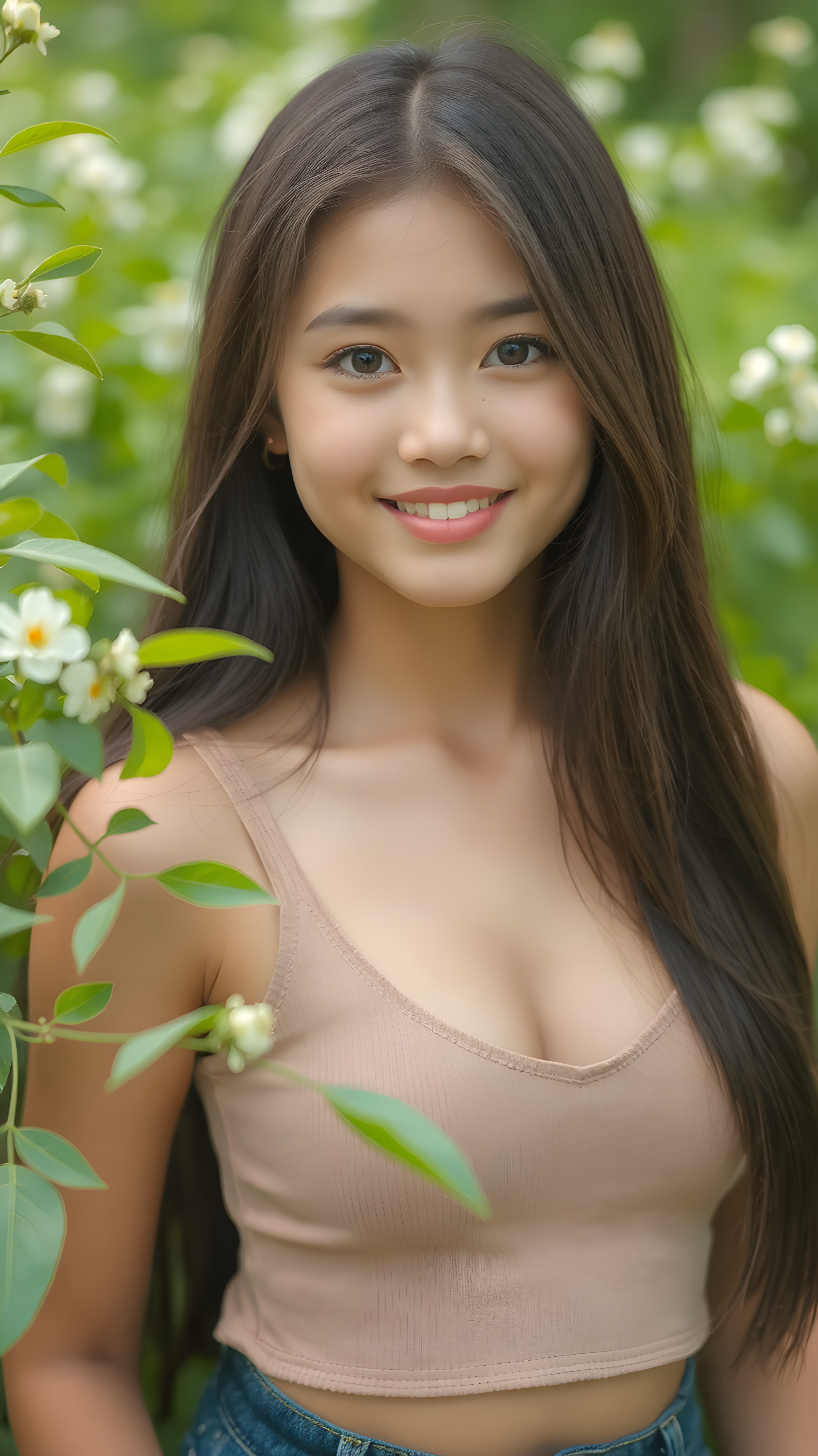 a young busty Indonesian model girl in a perfect portrait shot, with soft long hair, detailed round face, full lips, dark detailed eyes, smile, white teeth, she wears a cropped tank top with deep v-neck, cute and stunning, natural spring green backdrop