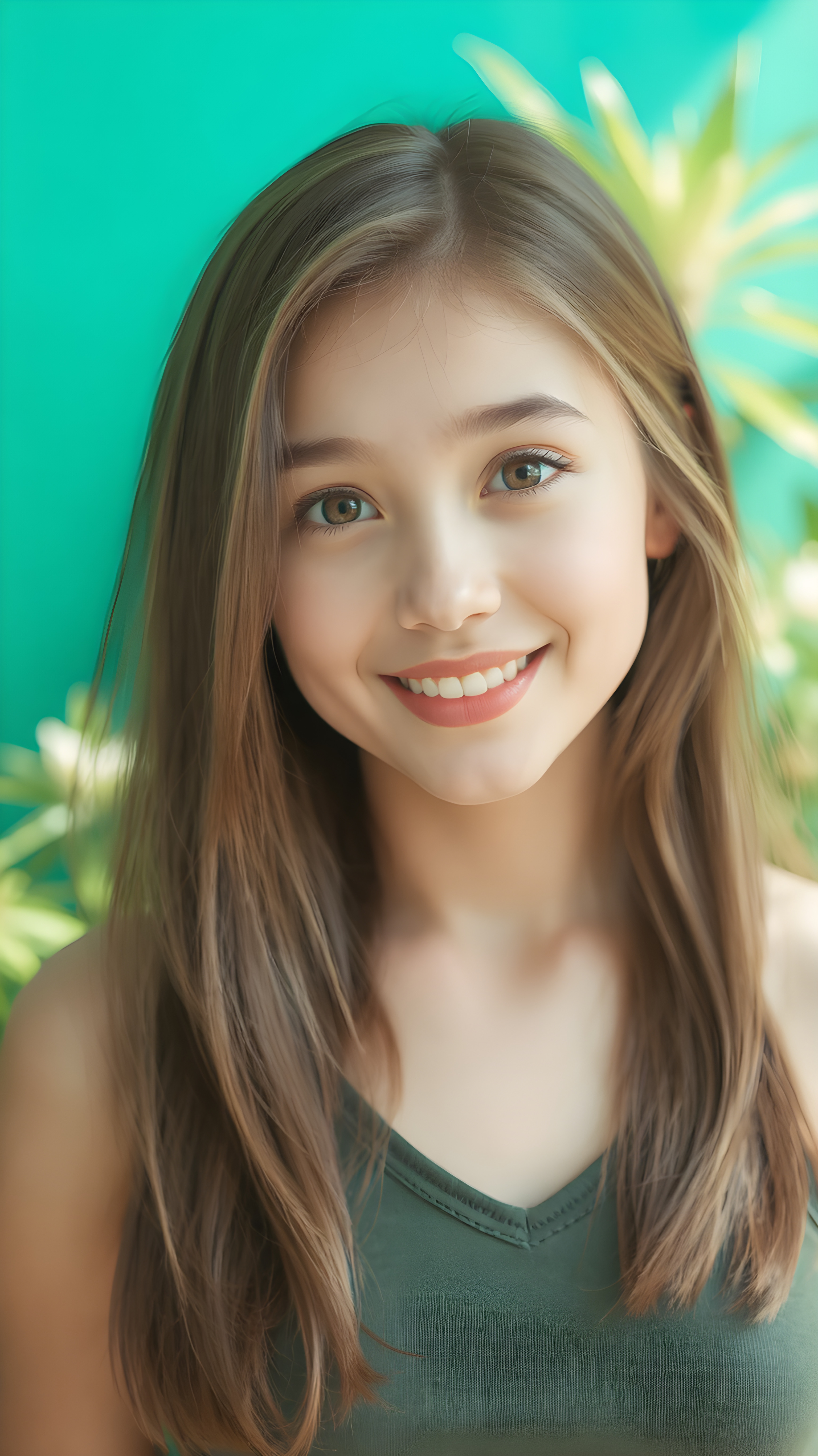 a young busty model girl in a perfect portrait shot, 1:3, with straight soft long hair, detailed round face, full lips, amber eyes, smile, white teeth, she wears a cropped tank top with deep v-neck, cute and stunning, sunny green backdrop