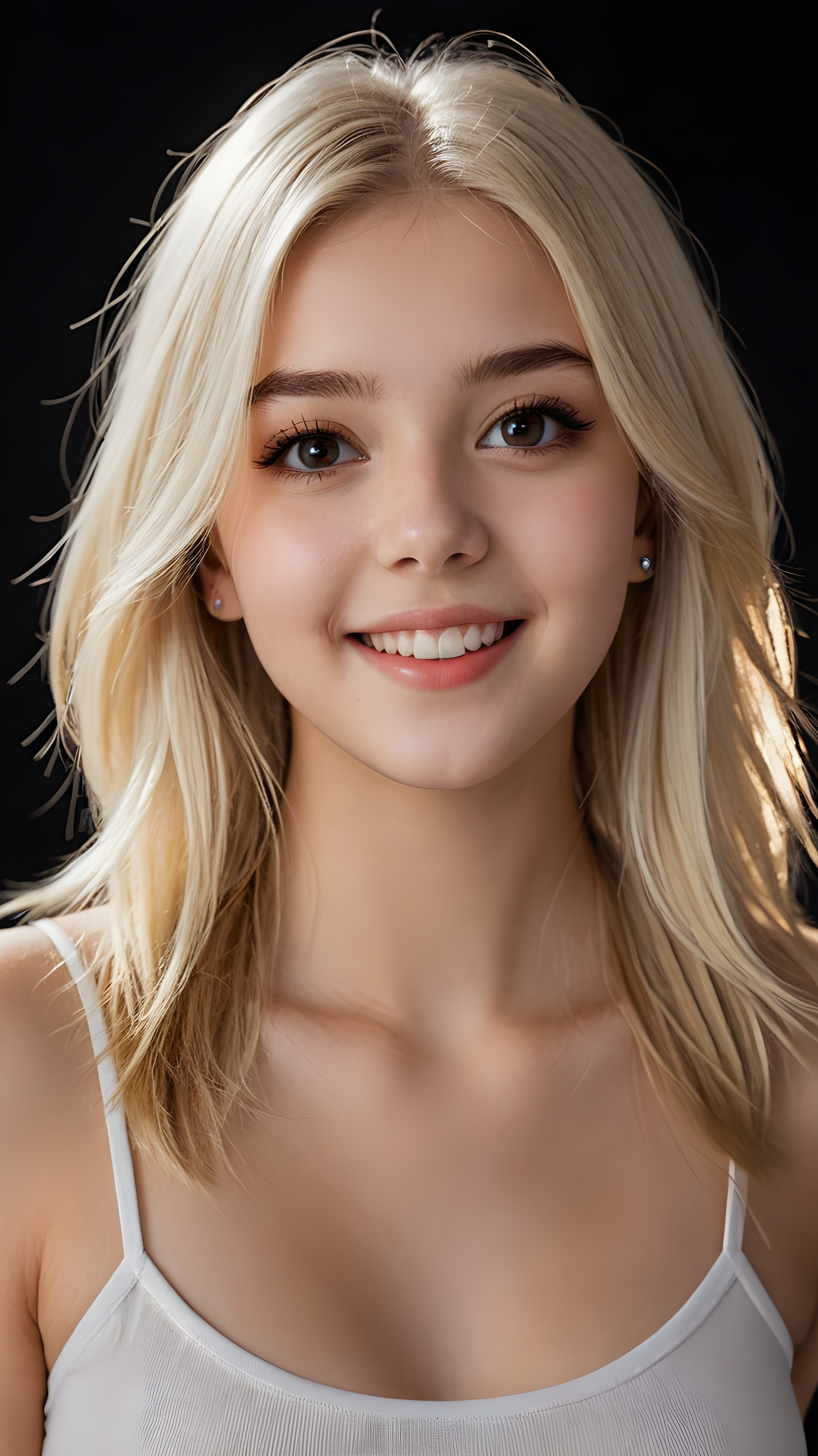 a realistic and detailed picture of my young daughter, 17 years old, short crop top, ((angelic round face, dark eyes)), ((soft long straight jet platinum-blonde hair)), full lips, in a (((carefree, happy expression))), surrounded by an air of exuberance and vivacity against a ((black backdrop)) ((perfect light and shadows))