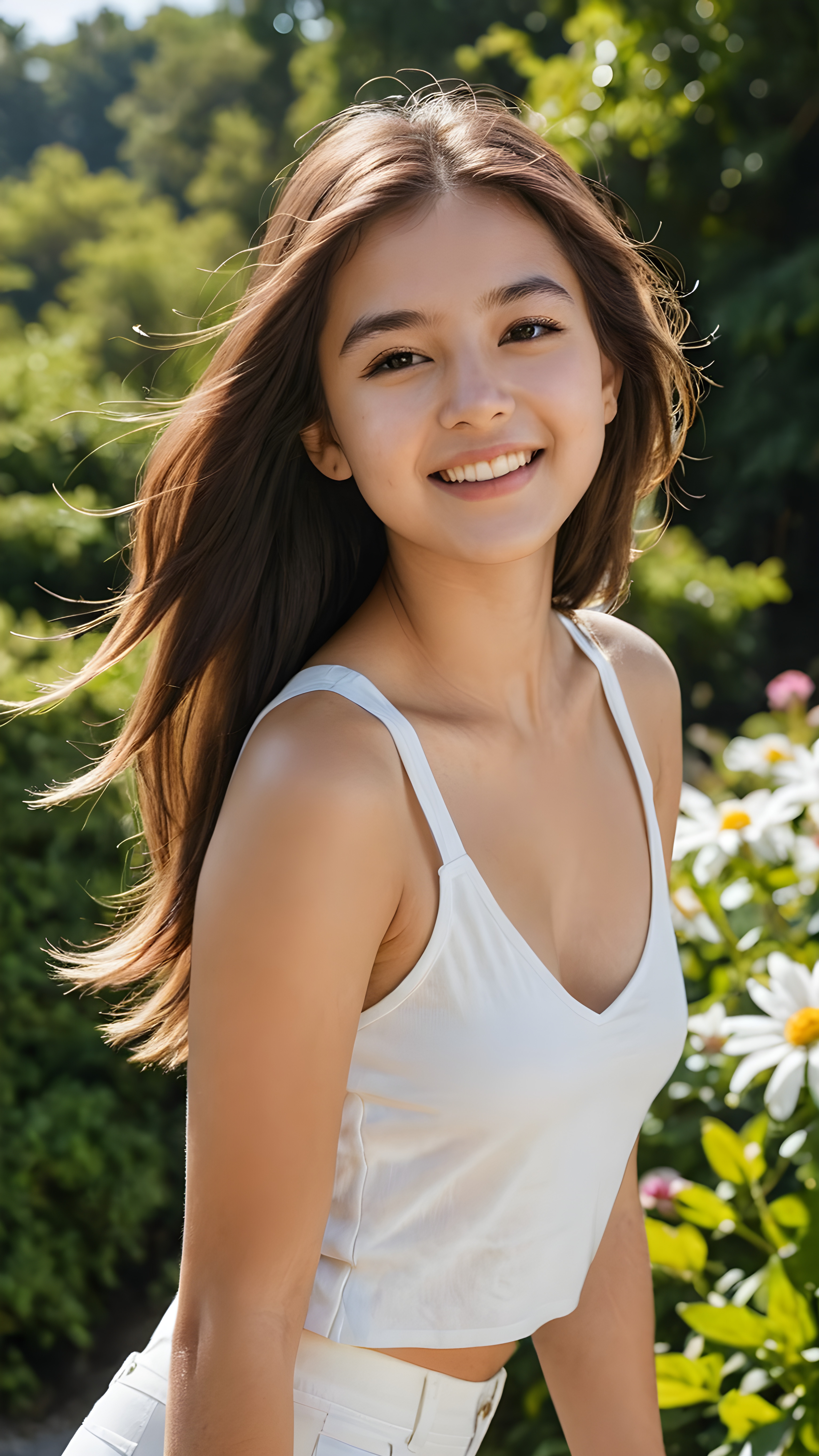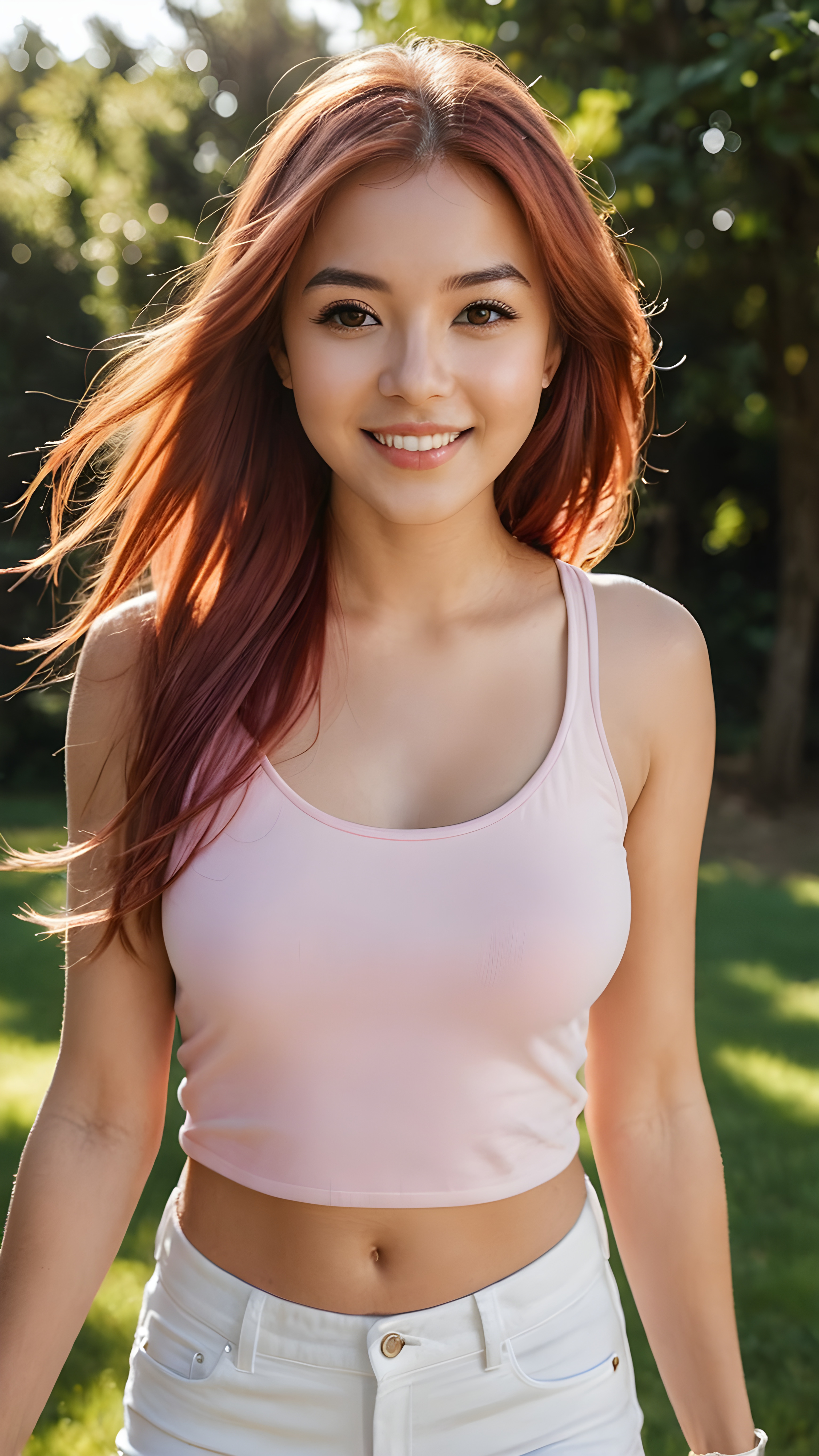 a realistic and detailed picture of my young daughter, in a plunge neck ((short pink crop tank top)), ((short white pants)), ((angelic round face)), ((auburn-red soft long straight hair)) in a (((carefree, happy expression))), surrounded by an air of exuberance and vivacity against a ((natural, sunny backdrop)) ((perfect light and shadows))