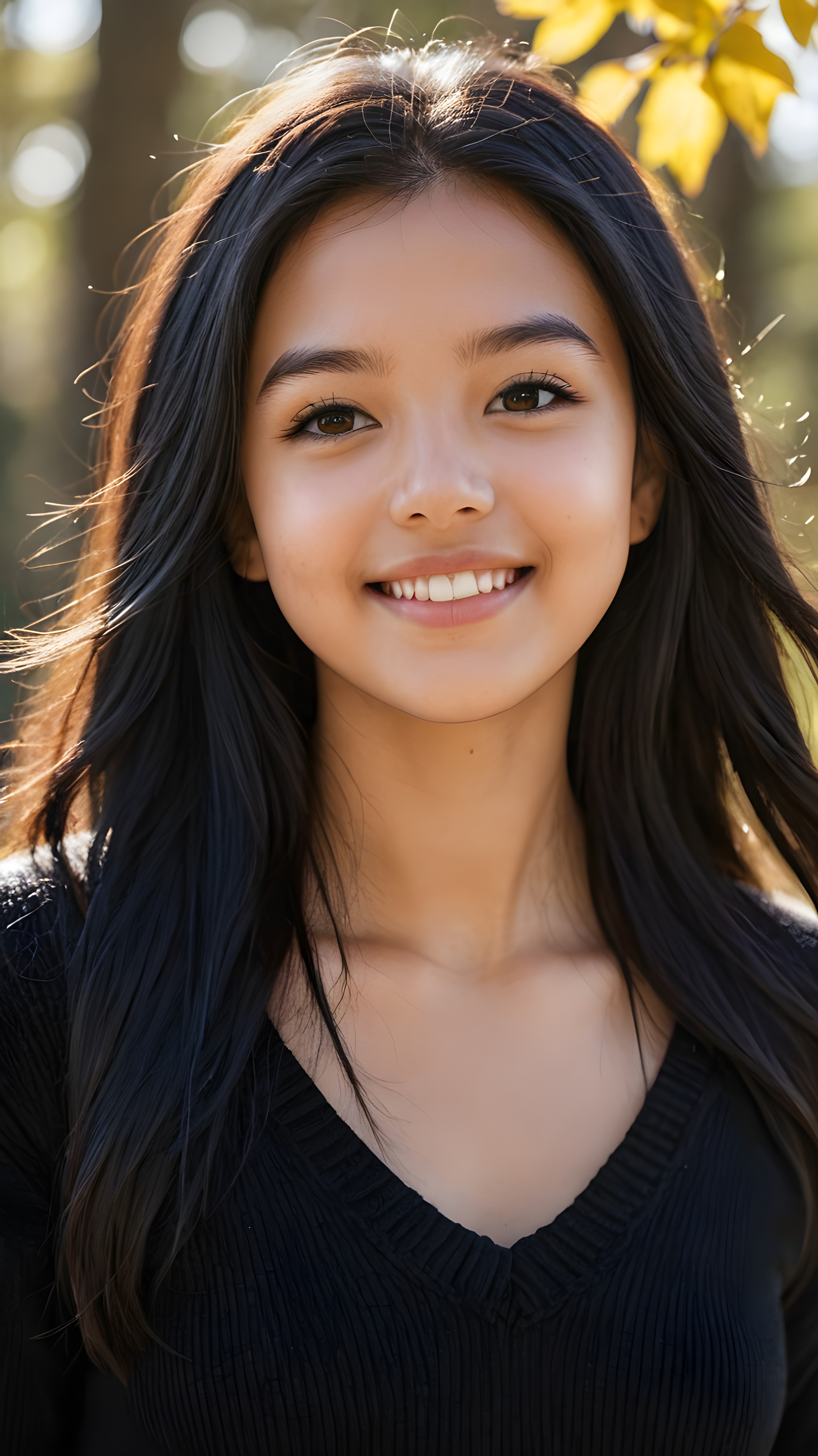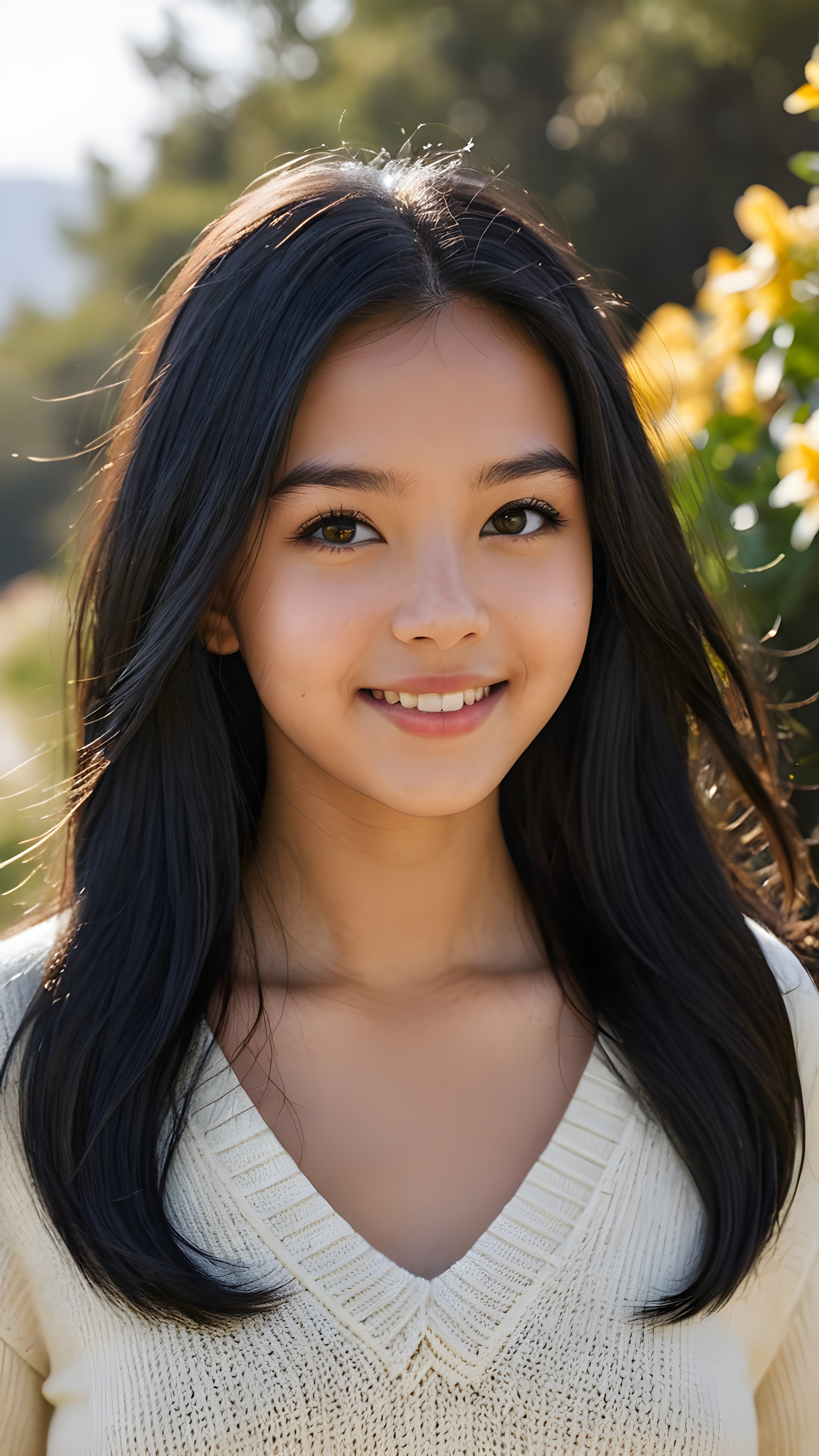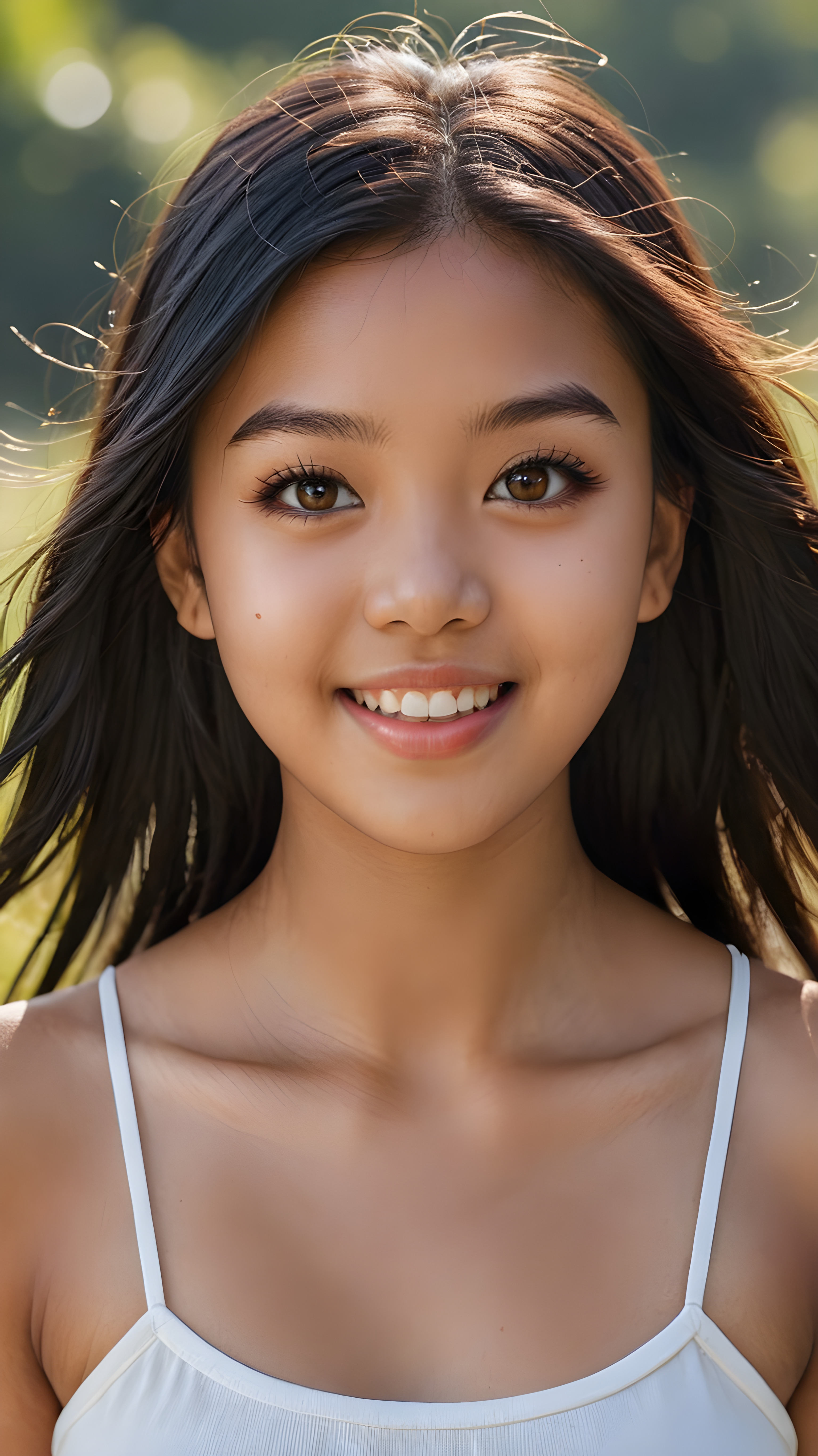 a realistic and detailed picture of my young daughter, 16 years old, short crop top, ((angelic round face, amber eyes)), ((soft long straight jet platinum white hair)), full lips, in a (((carefree, happy expression))), surrounded by an air of exuberance and vivacity against a ((natural, sunny backdrop)) ((perfect light and shadows))