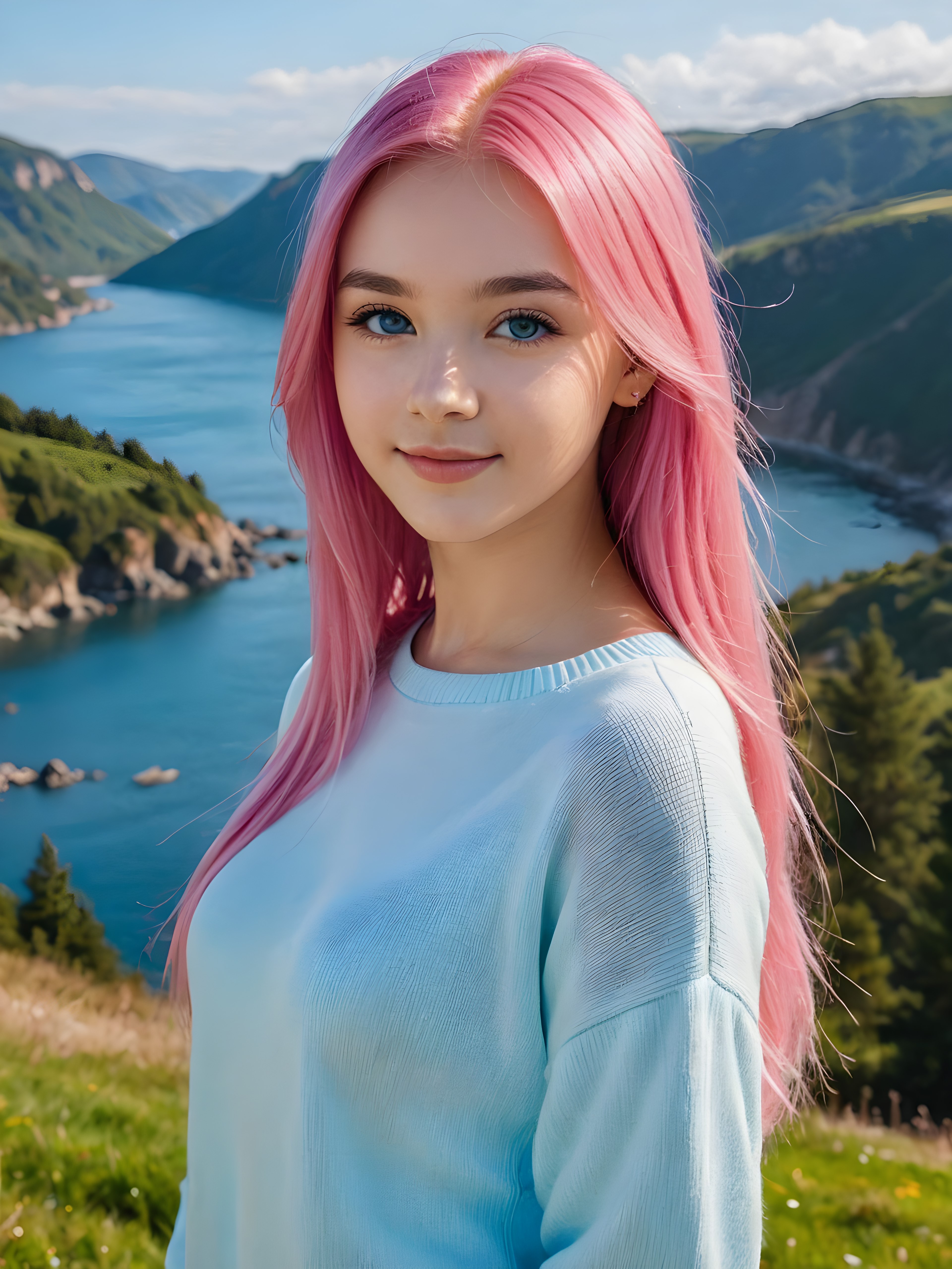 a beautiful (((pretty young teen girl))), with long, silky, shiny straight neon pink hair, wearing a thin, sweater, her hair extends beyond her shoulders, she looks cheerfully at the viewer, perfect curved body, natural backdrop